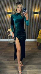 Turn heads in the Sibyl Forest Green High Neck Velvet Ruched Tie Detail Midi Dress. With its luxurious velvet material, high neck design, and unique ruched and tie detail, this midi dress exudes both elegance and playfulness. The side split adds a touch of flirtiness, making it the perfect dress for any occasion.