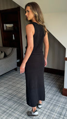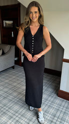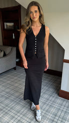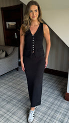 Indulge in the luxurious sophistication of the Abby Black Fine Knit V Neck Top & Skirt Co-Ord. This elegant ensemble features a sleeveless top and a midi length skirt, both crafted with the finest fine knit fabric. Elevate your style with this exclusive set, perfect for any occasion.