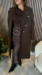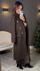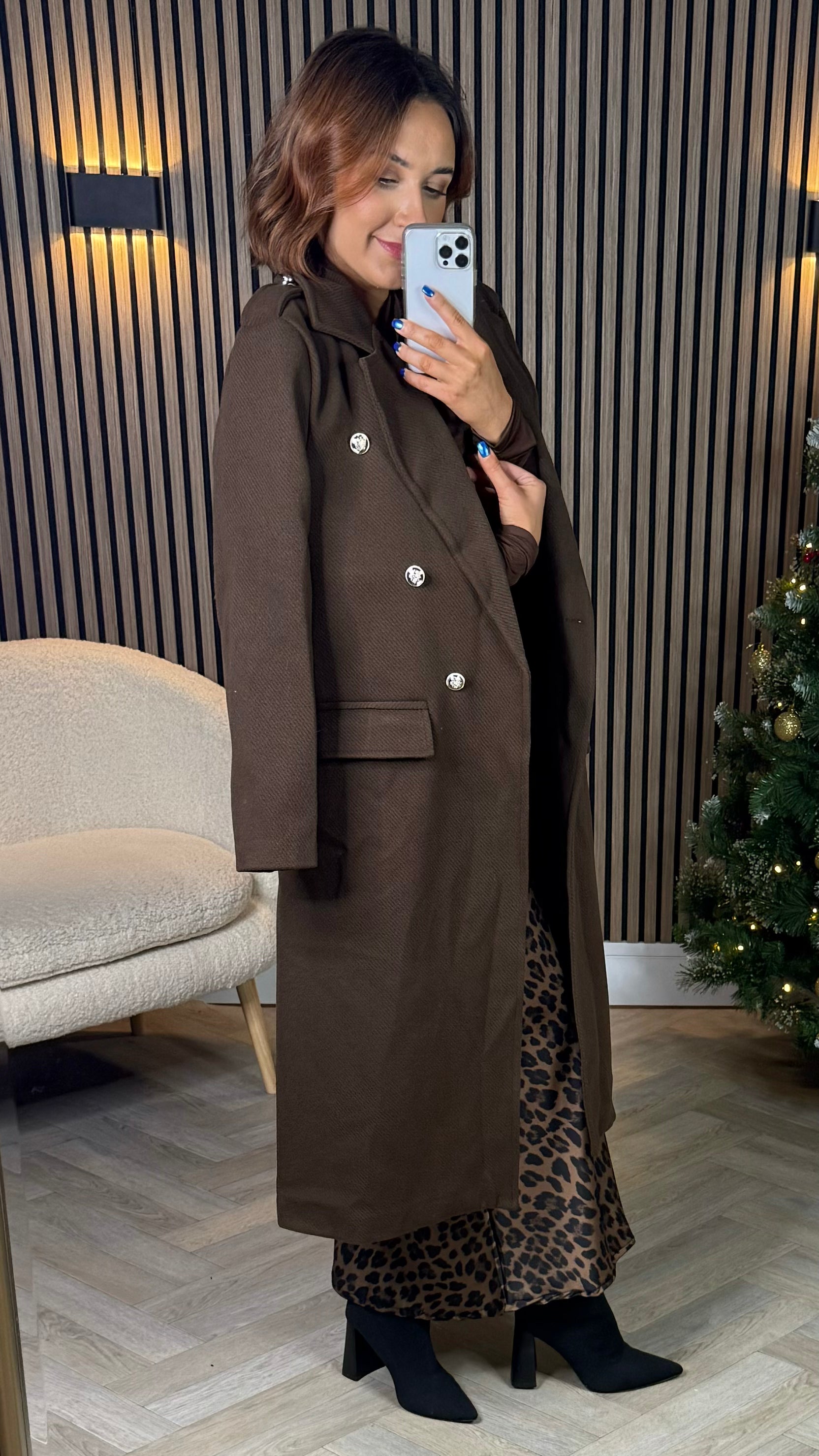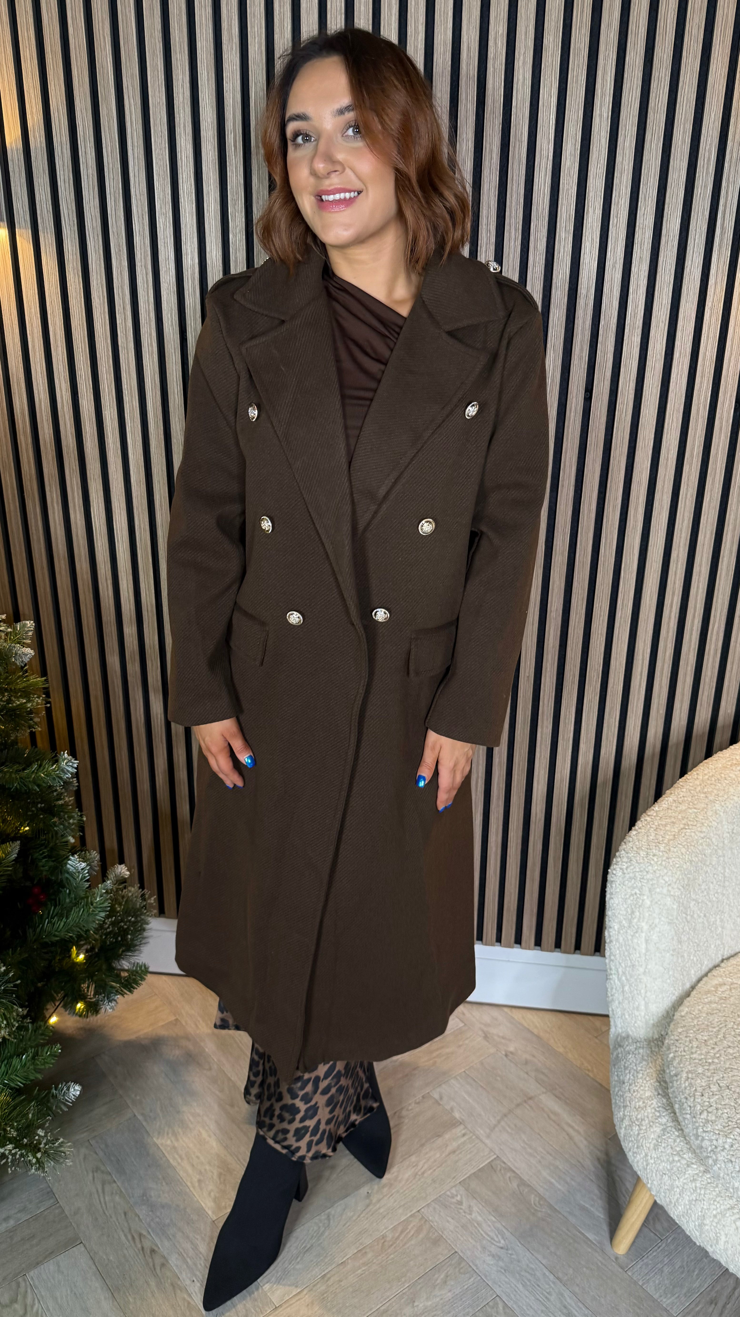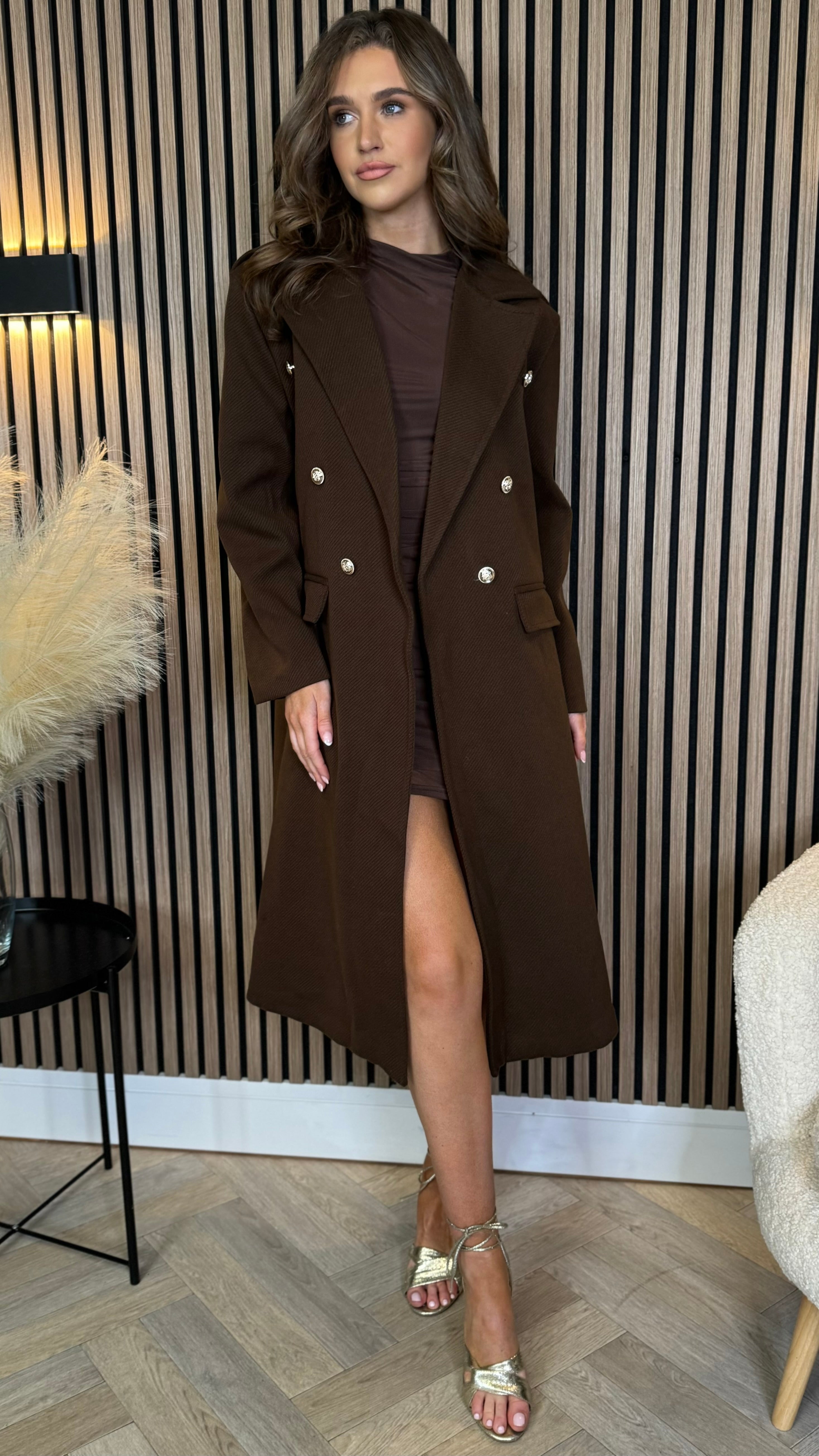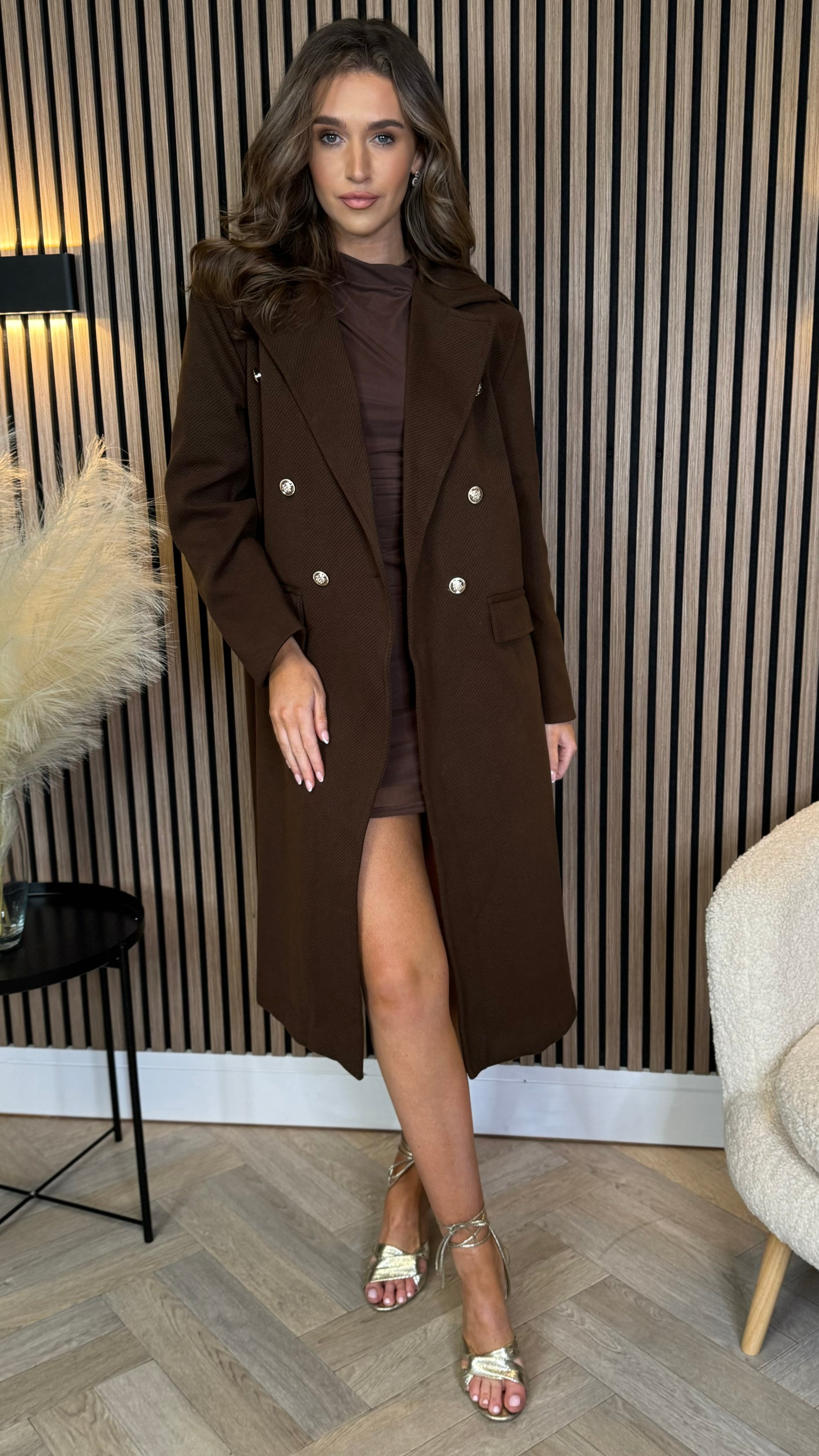 Indulge in style with the Alorie Chocolate Brown Coat. This playful midi length coat features a luxurious wool finish and a double-breasted design. The button detail on the front and cuffs adds a touch of whimsy to the classic silhouette. Keep yourself cozy and chic this season.