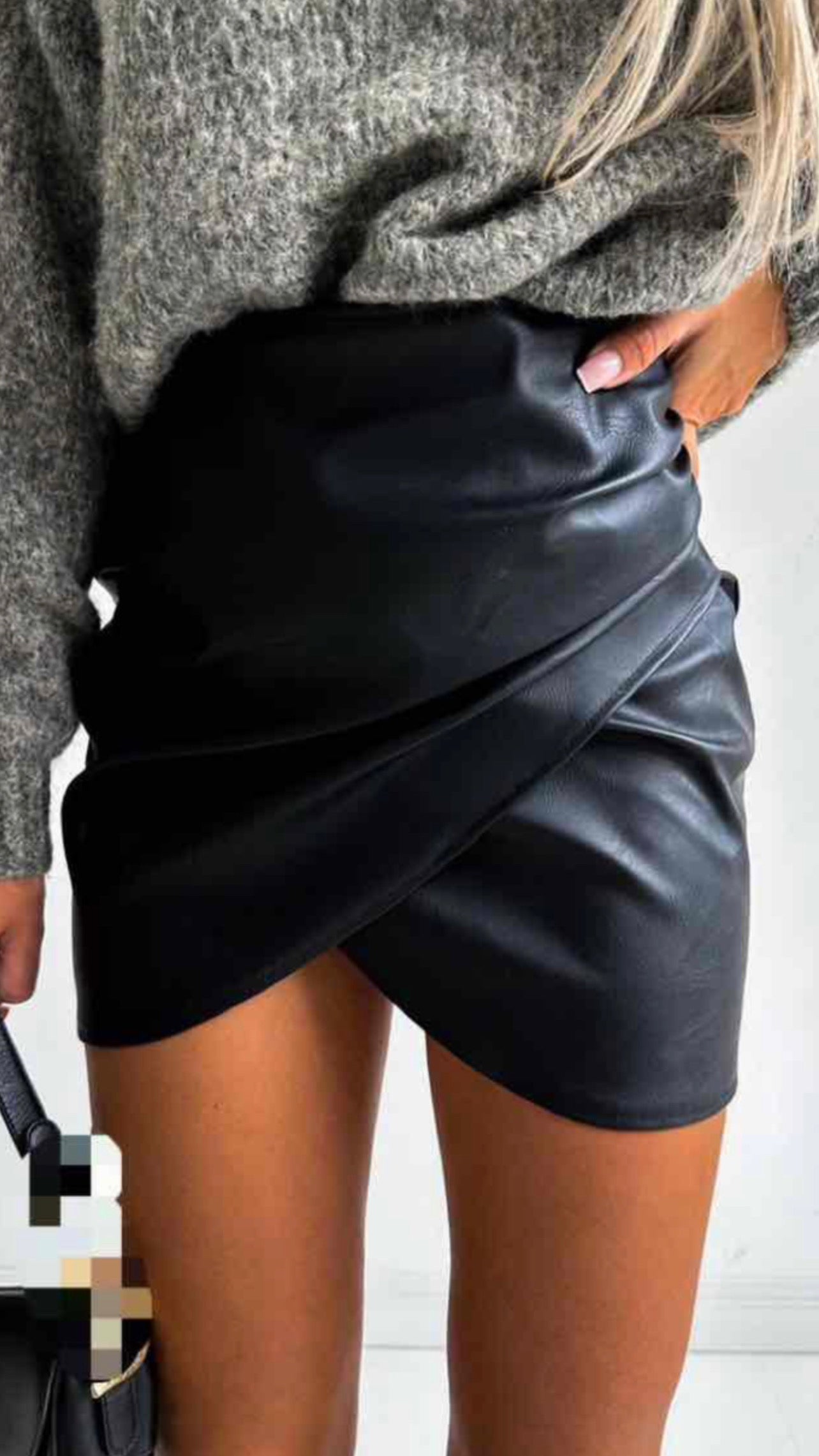 Rock the look with this faux-leather mini skirt! Its black hue, ruched design, and faux-wrap style give you fashionista vibes like no other. Add a dash of confidence (and a 🤩 emoji for good measure) and you've got a show-stopping ensemble.