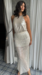 Get ready to twinkle all night long with the Astra Champagne Sequin Mesh Detail Maxi Skirt! Featuring an elasticated waistband for a comfy fit, this skirt dazzles with all-over embellishments that catch every eye. Lined until mid-thigh for smooth coverage and a concealed zip fastening, it's as easy to wear as it is stunning. Perfect for when you want to sparkle and move with flair!