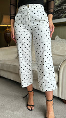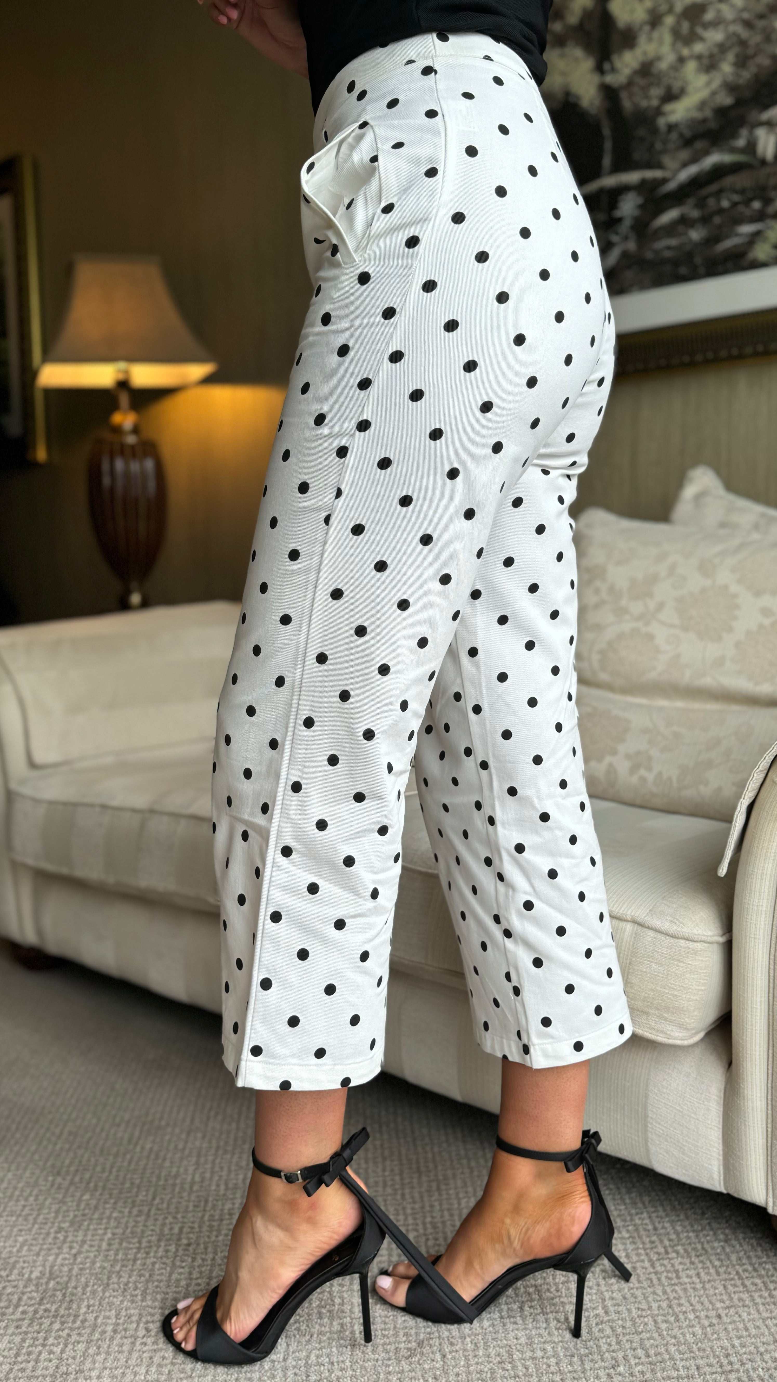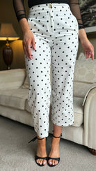 Elevate your everyday wardrobe with these chic cropped trousers, designed for effortless style and comfort. Featuring a timeless white base with playful polka dots, they offer a contemporary twist on a classic silhouette. The button and fly fastening ensures a secure, flattering fit, while the cropped length works beautifully with everything from trainers to heels. Faux pockets add a sleek finishing touch without compromising the clean lines. Perfect for creating polished looks that feel both put-together and approachable.