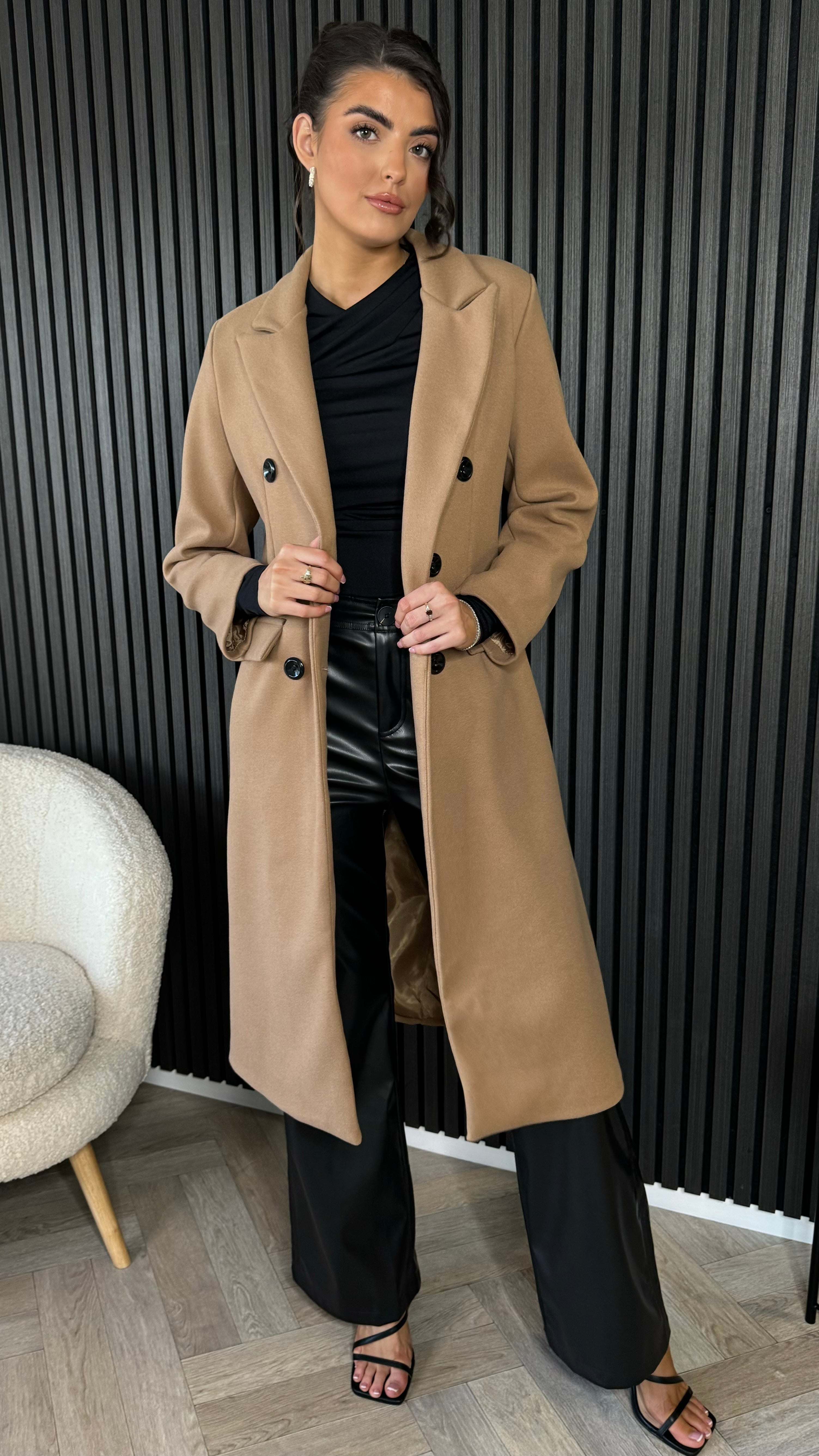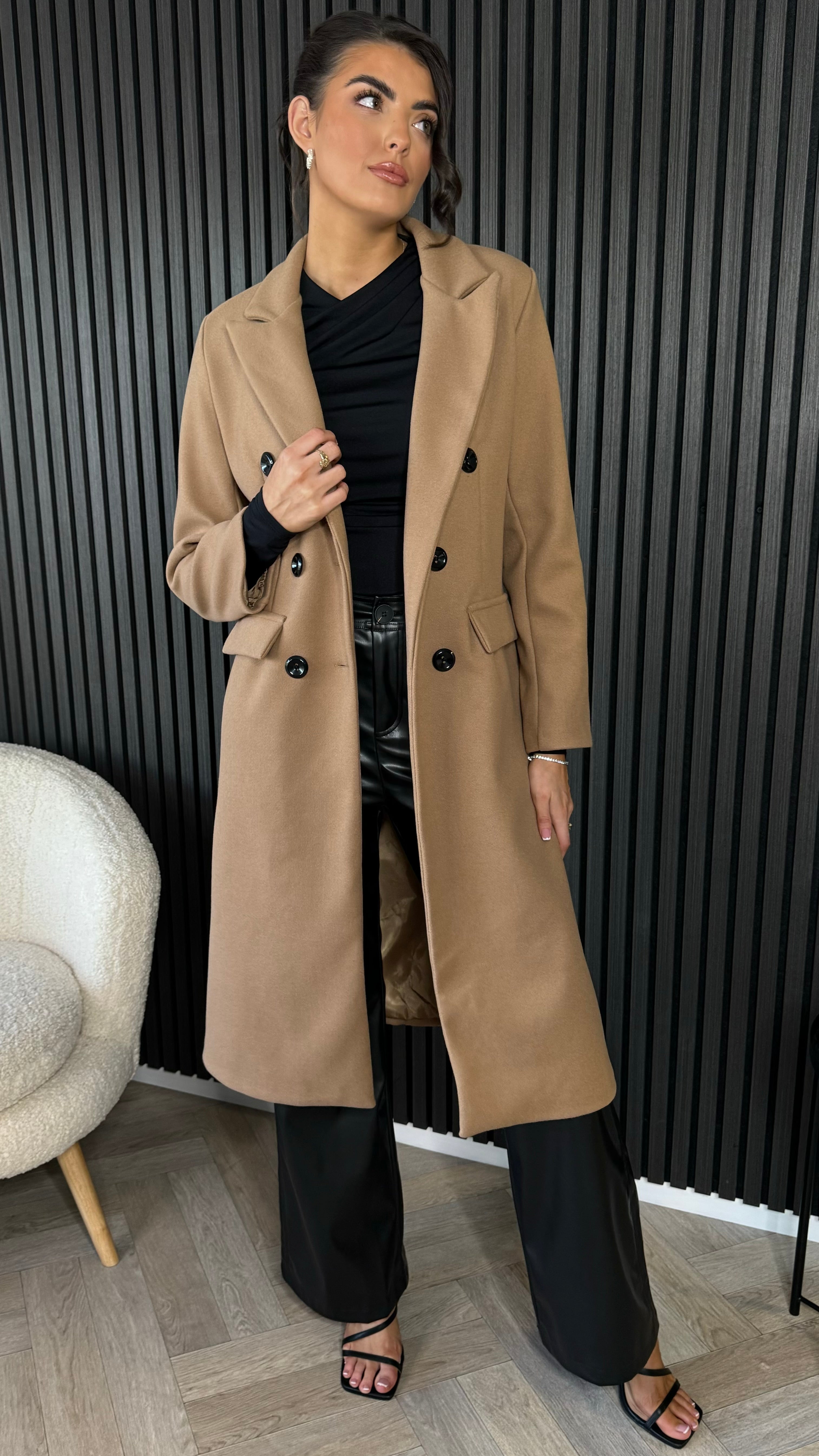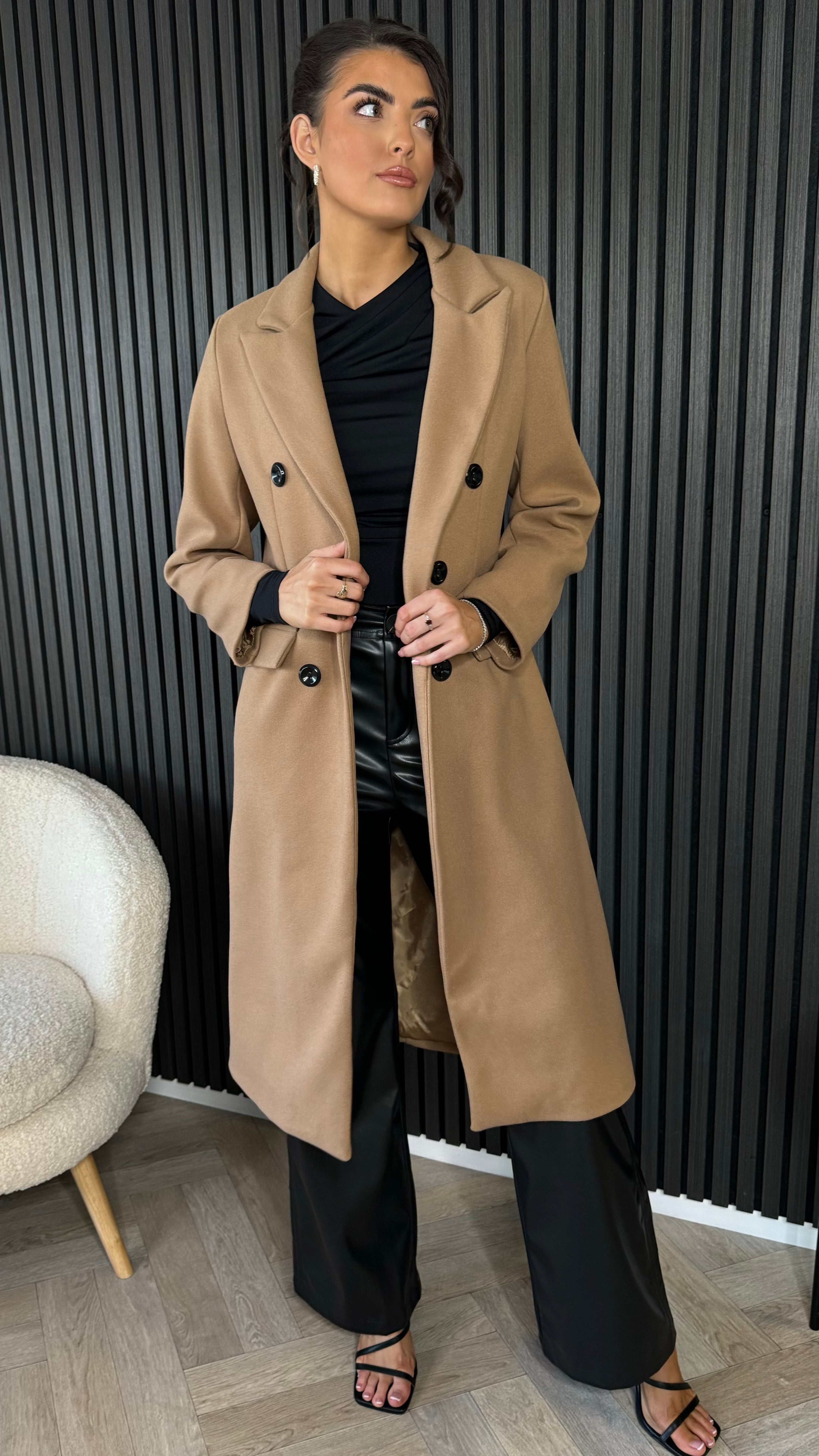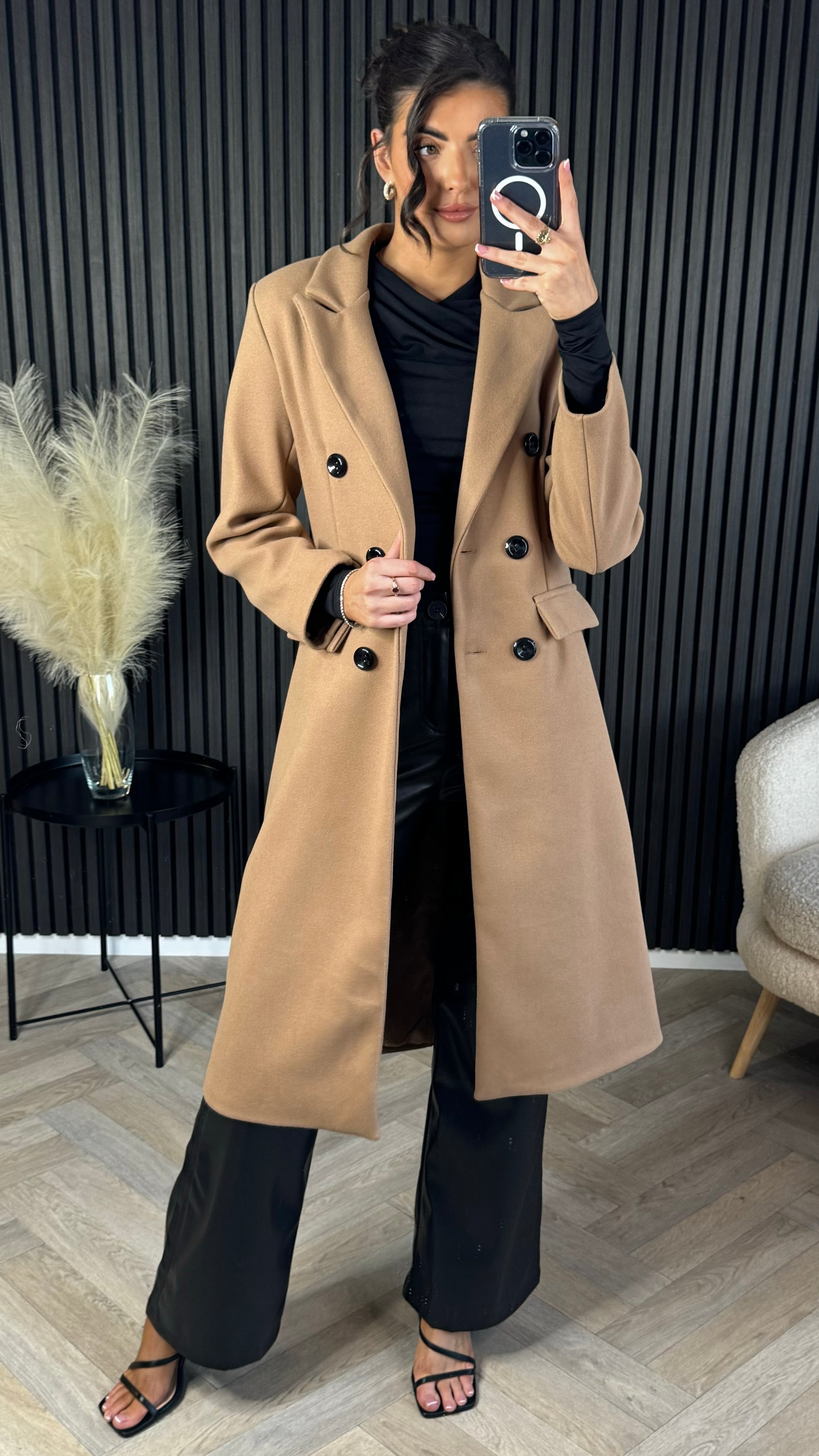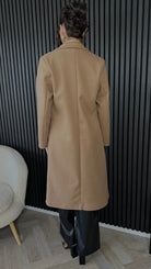 Stay chic and cozy with the Baldwin Camel Midi Length Coat. Featuring a stylish collared design and classic black buttons, this coat will make you stand out in any crowd. Embrace your inner fashionista and stay warm at the same time.