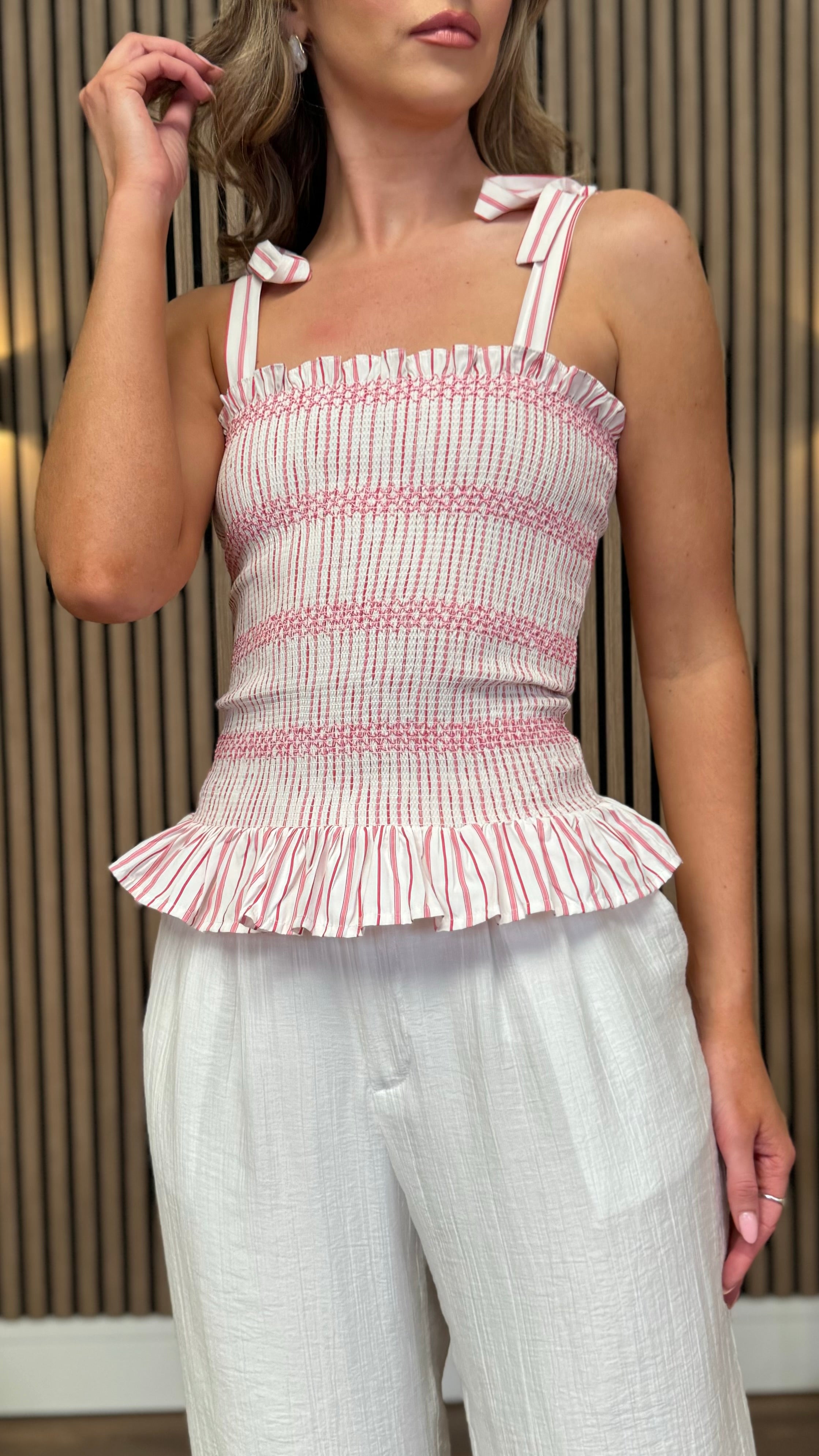 Beatrice Pink & White Tie Strap Shirred Top