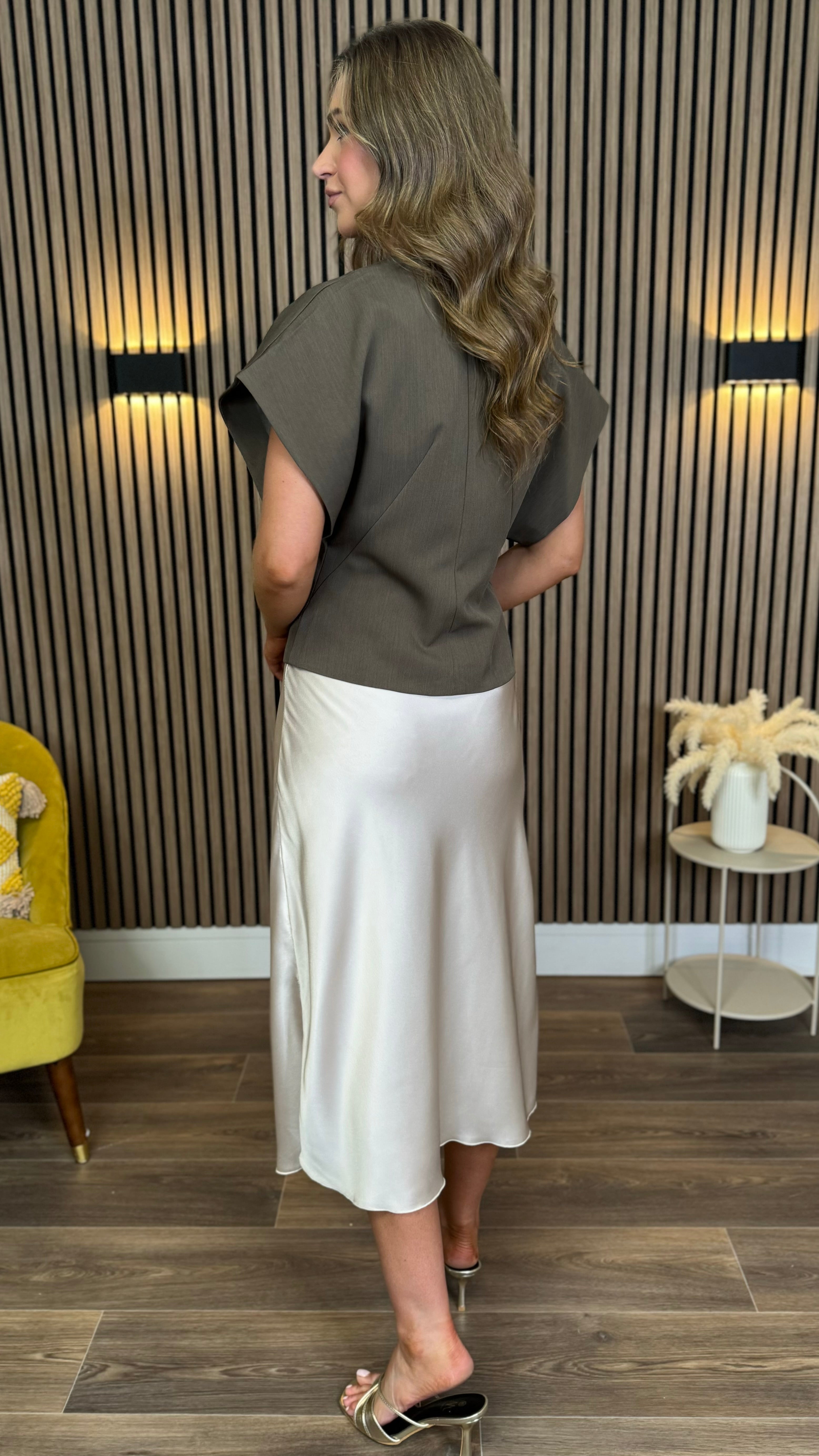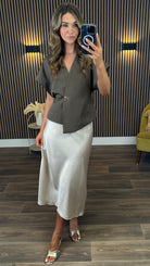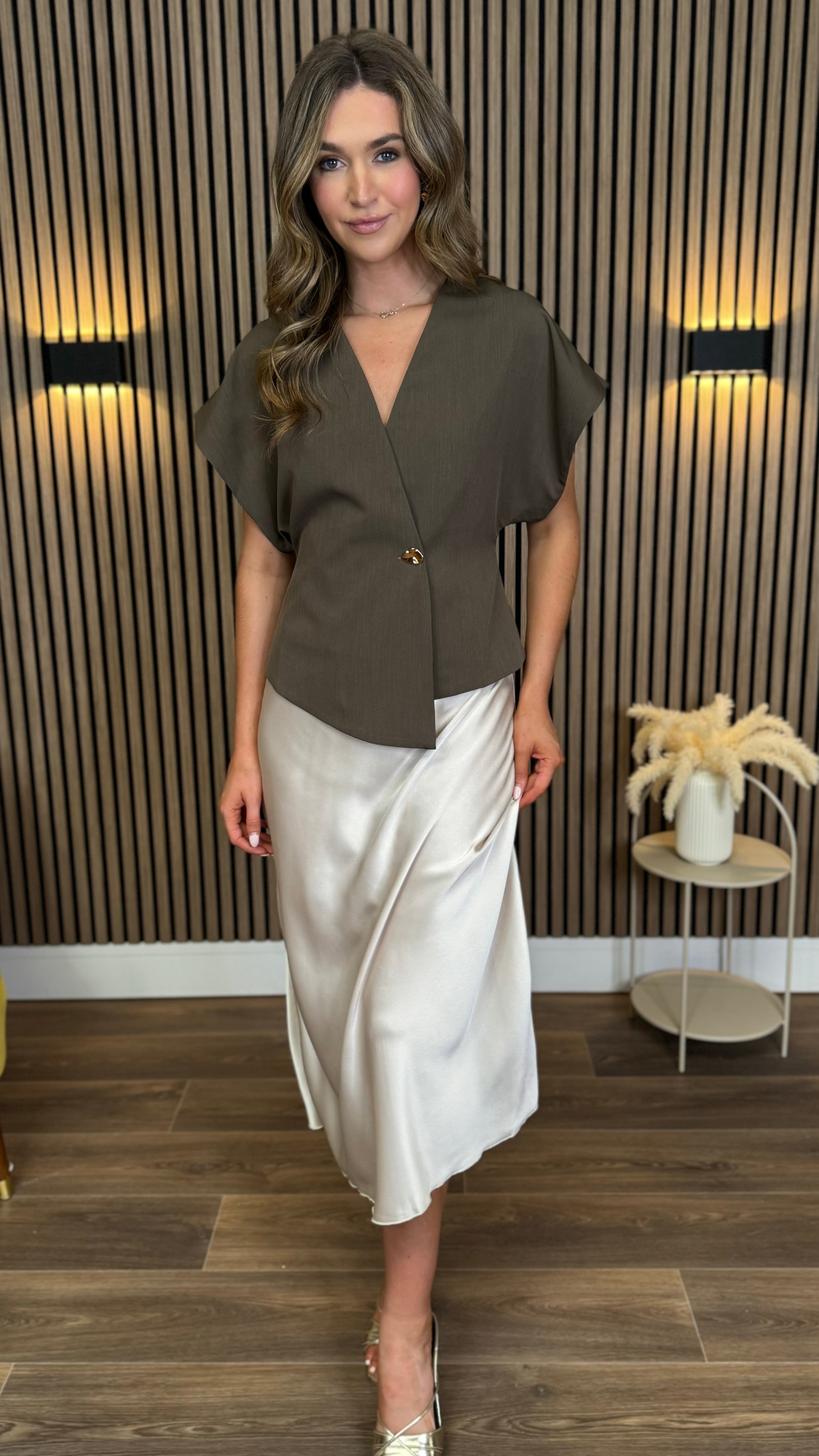 The Blair Taupe Asymmetrical Gold Detail Top combines a chic wrap silhouette with elegant gold accents ✨. Its taupe hue and unique design offer a sophisticated look that seamlessly transitions from day to night. Perfect for those seeking a refined and stylish addition to their wardrobe.