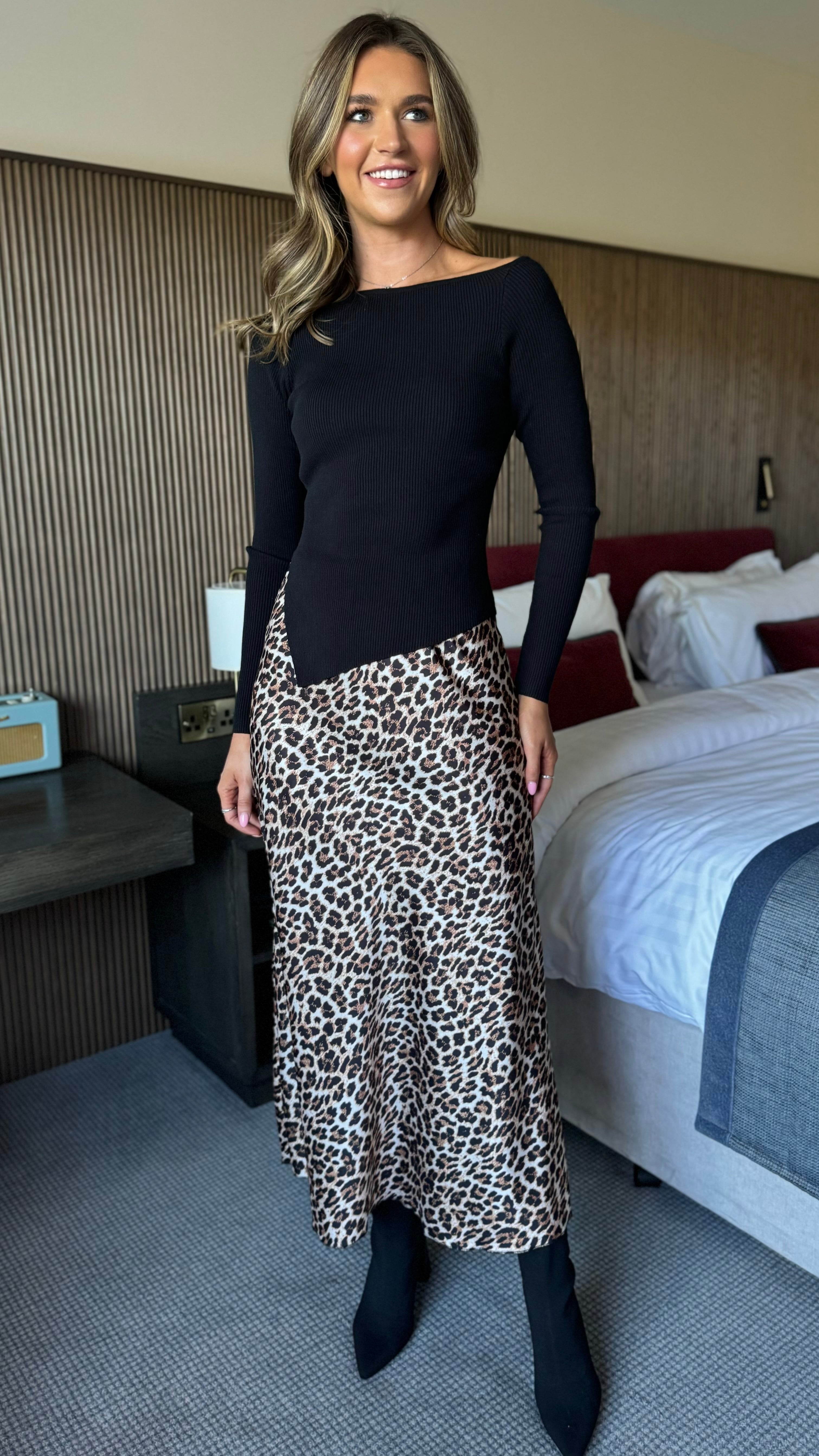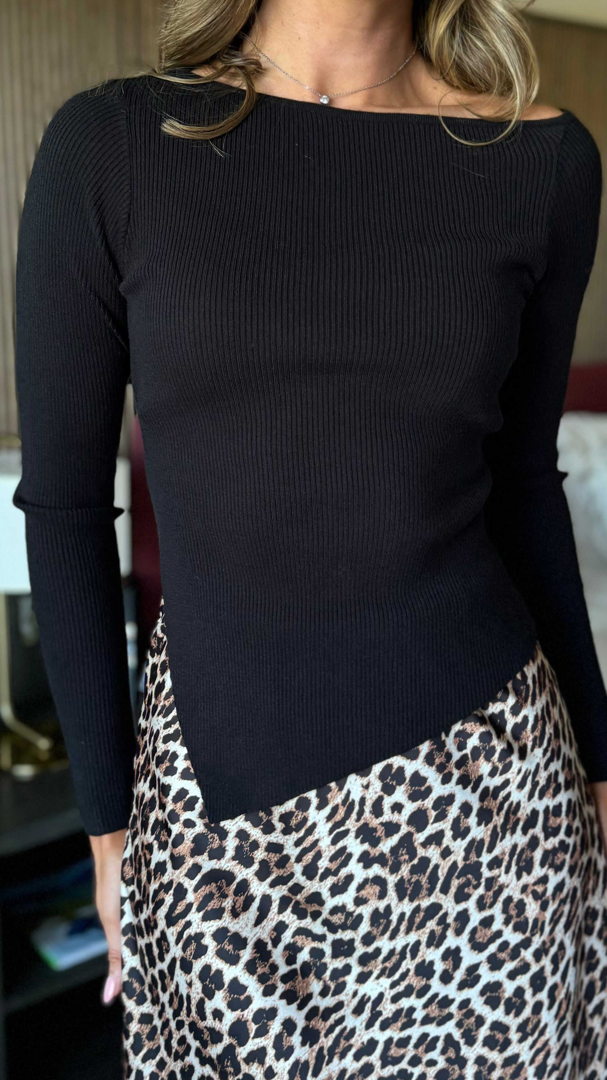 Turn heads with the Briana Black Slash Neck Asymmetric Top, where playful meets edgy. Featuring long sleeves for a sleek silhouette, a daring slash neck that adds a flirty twist, and an asymmetric hem that brings unexpected flair. The side slit keeps your look fresh and gives you freedom of movement—perfectly balancing comfort with style.