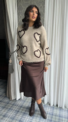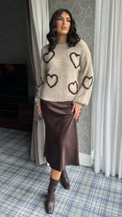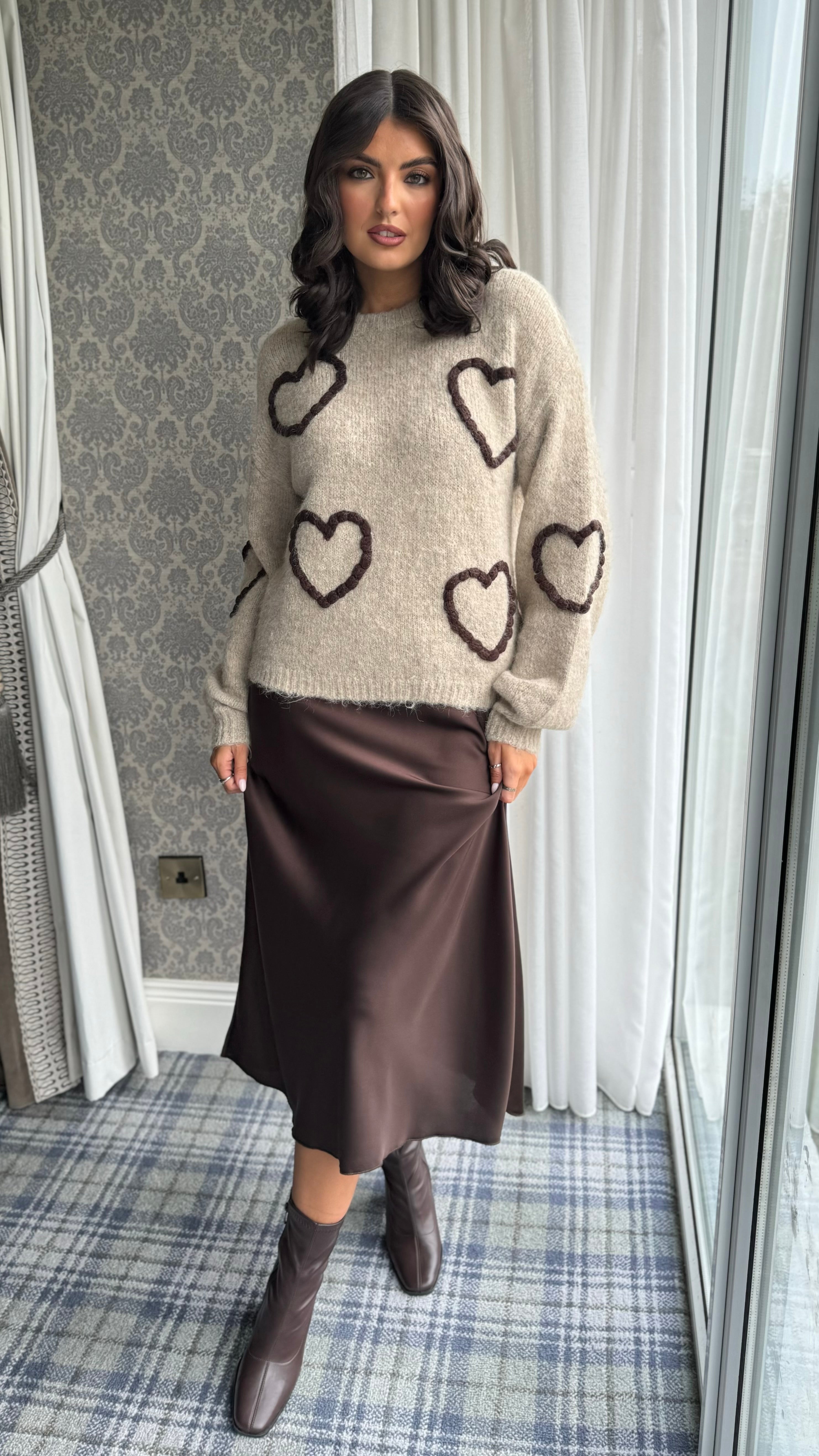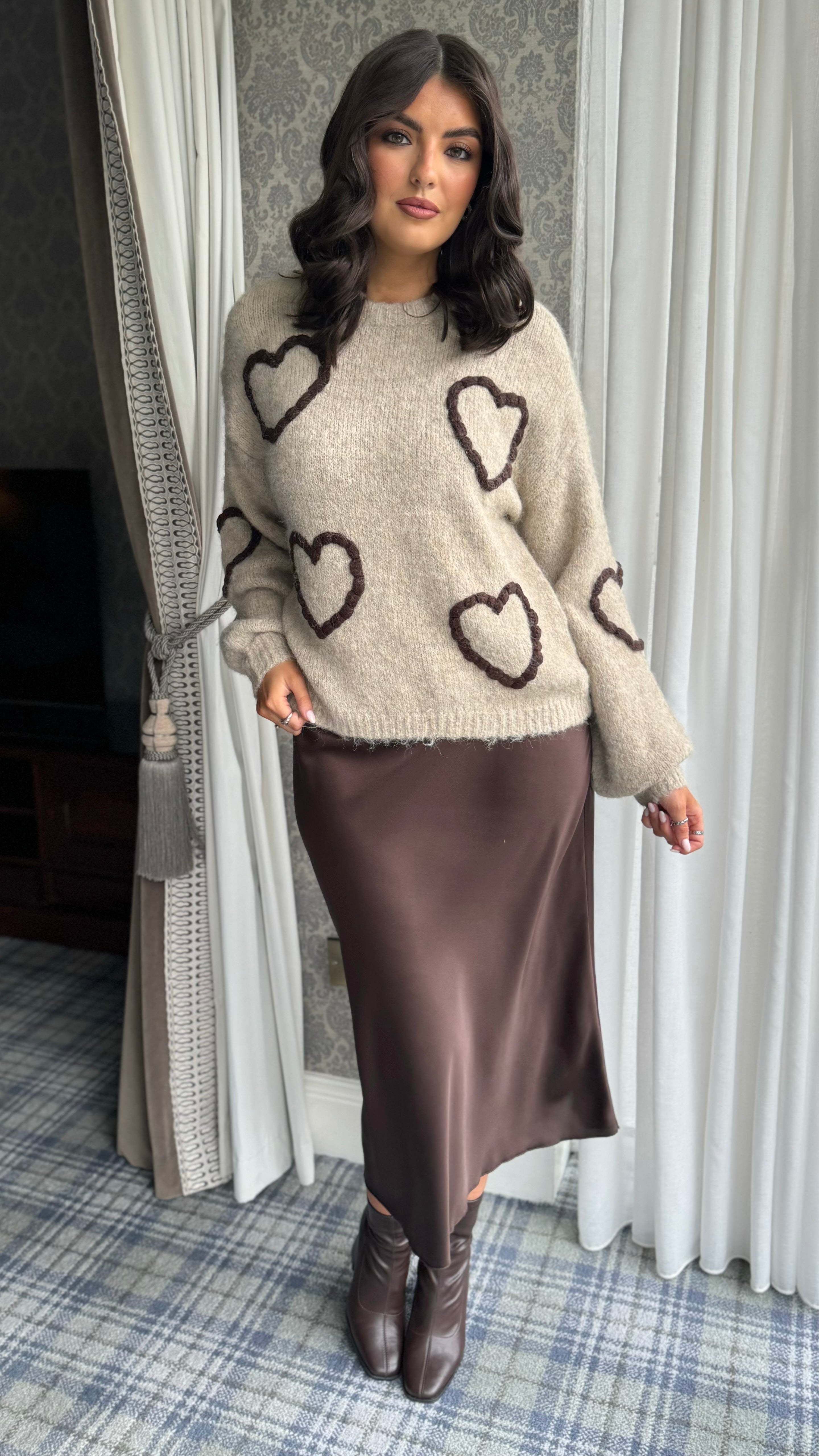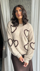 Wrap yourself in cozy charm with the Cadence Beige & Brown Heart Print Jumper. Featuring a playful round neckline and whimsical balloon sleeves, it adds a fun twist to your everyday look. Soft fabric paired with fitted cuffs keeps you snug, while delicate heart embroidery brings a sweet, stylish touch. Perfect for those who love comfort with a dash of delightful detail.