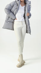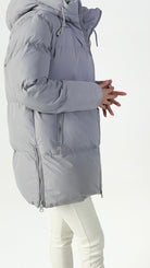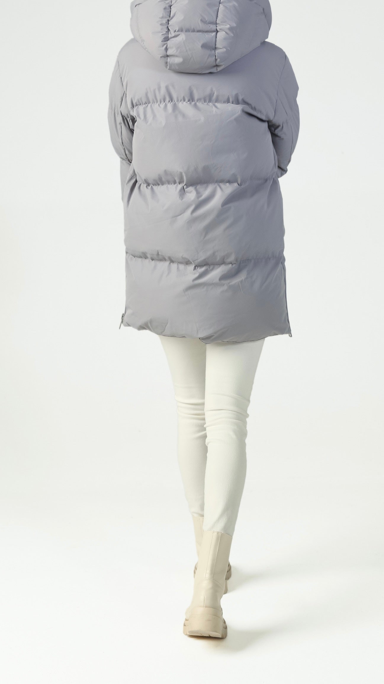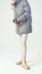 Stay cozy and stylish with our Carmella Light Grey Puffer Hooded Coat. This mid-thigh length coat features a double zip design and side zips for added comfort and convenience. The cuffed sleeves and zipped pockets add extra flair to this must-have winter essential.