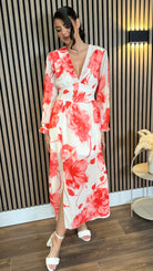Get ready to turn heads with our Carmen Orange & Cream Printed Printed Midi Dress! This dress features a playful v neckline and a flowy midi length, perfect for any occasion. With its trendy long sleeves, you'll feel chic and stylish all day long.🌸👗