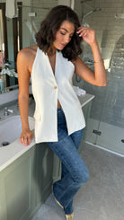 This Claudette White Halter Neck Tailored Style Blazer is sleek, sophisticated, and ready to make a statement! With a unique backless design and faux pocket details, this blazer is perfect for adding a touch of flair to any outfit. Plus, the large button adds a playful twist to this tailored piece. 🔥