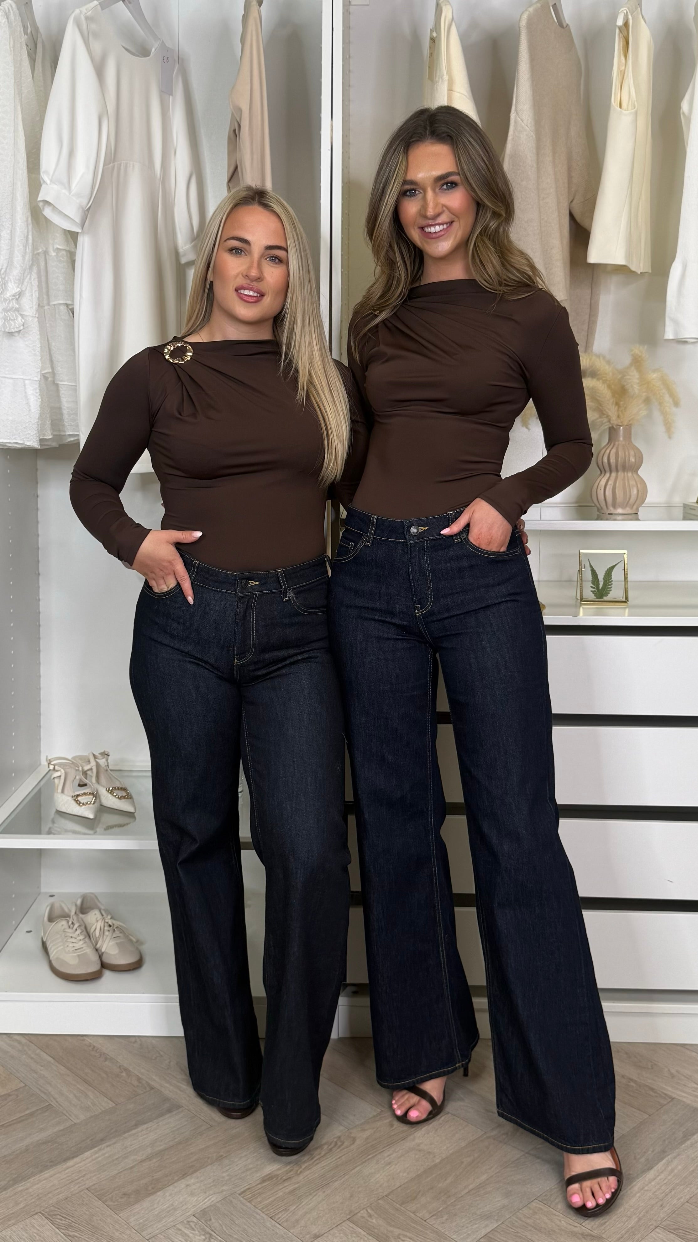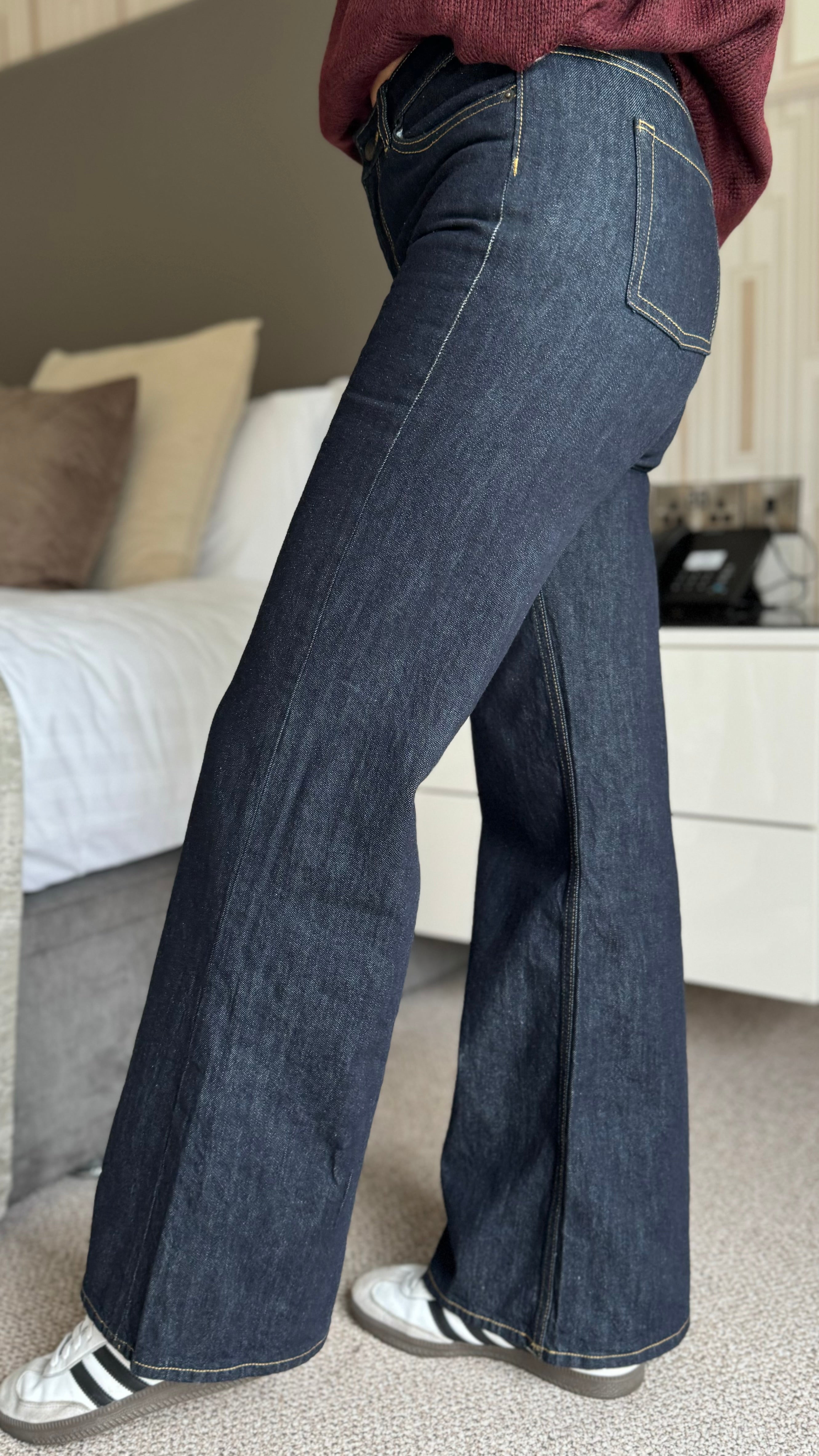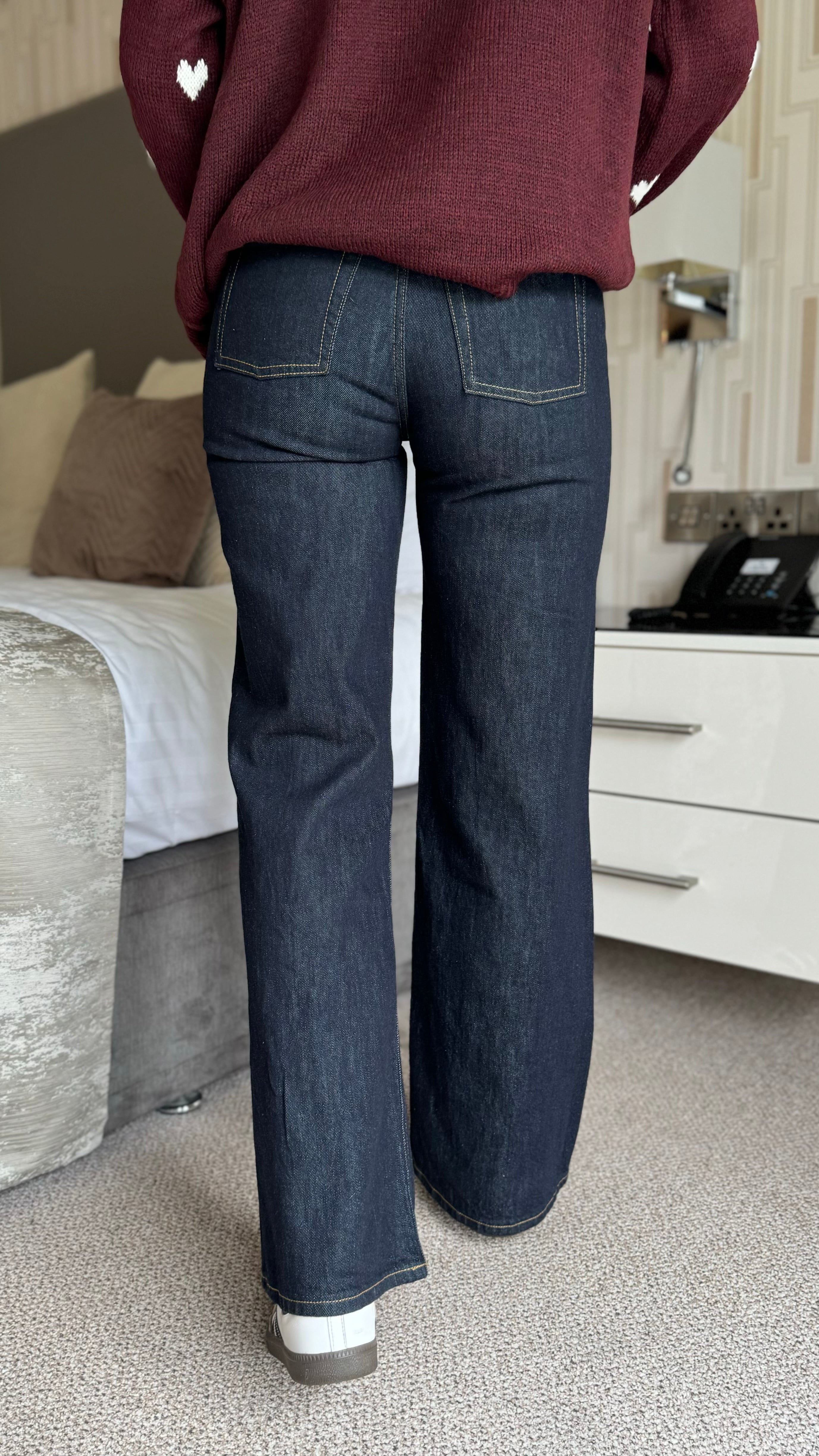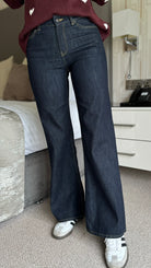These Edith Dark Denim Flared Wide Leg Jeans bring a fun twist to your wardrobe with playful yellow stitching that pops against structured denim. Featuring a flattering mid-waist fit and roomy front and back pockets, they combine comfort with style. The flared leg design adds a retro flair that's perfect for making a statement wherever you go.