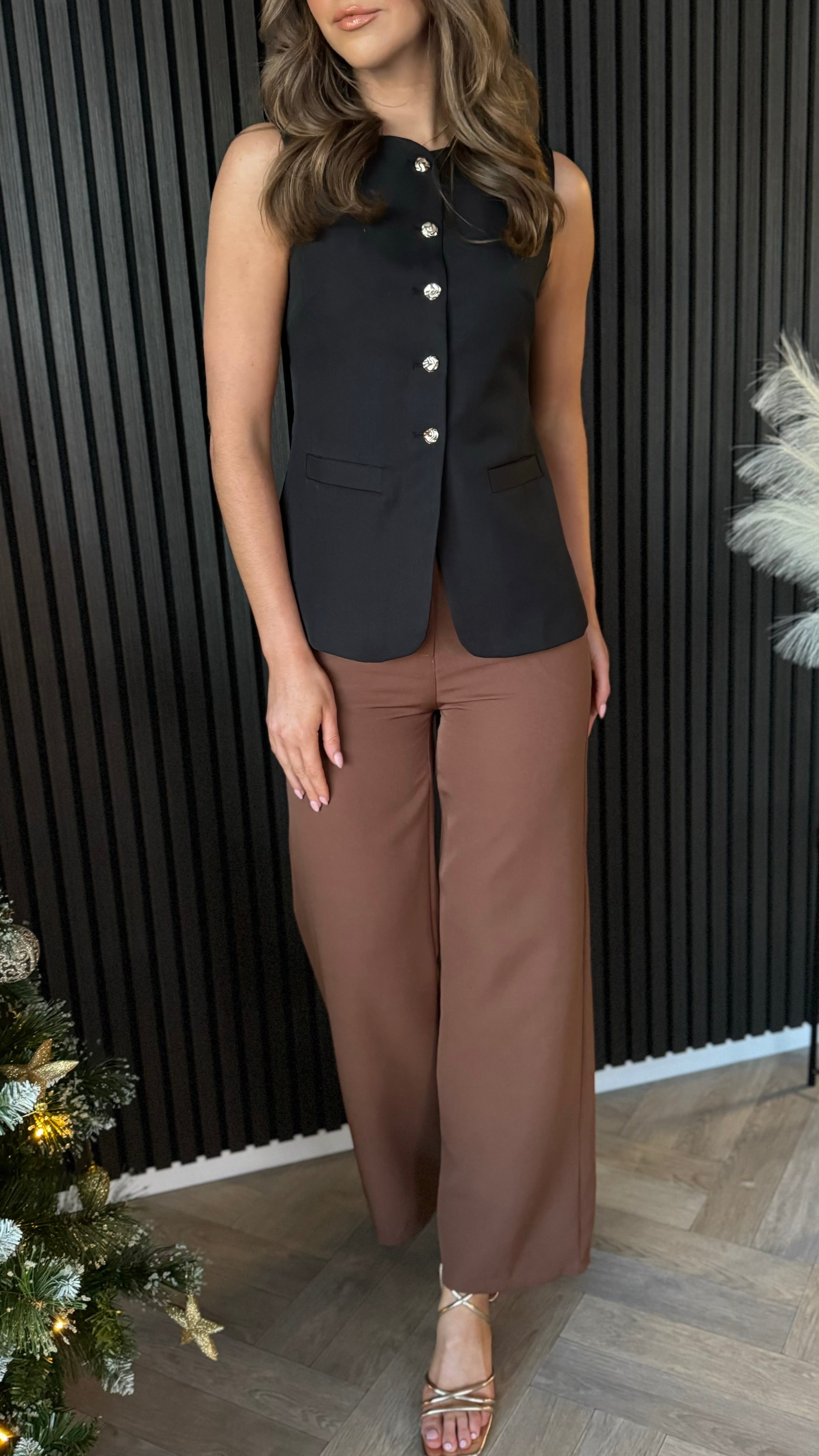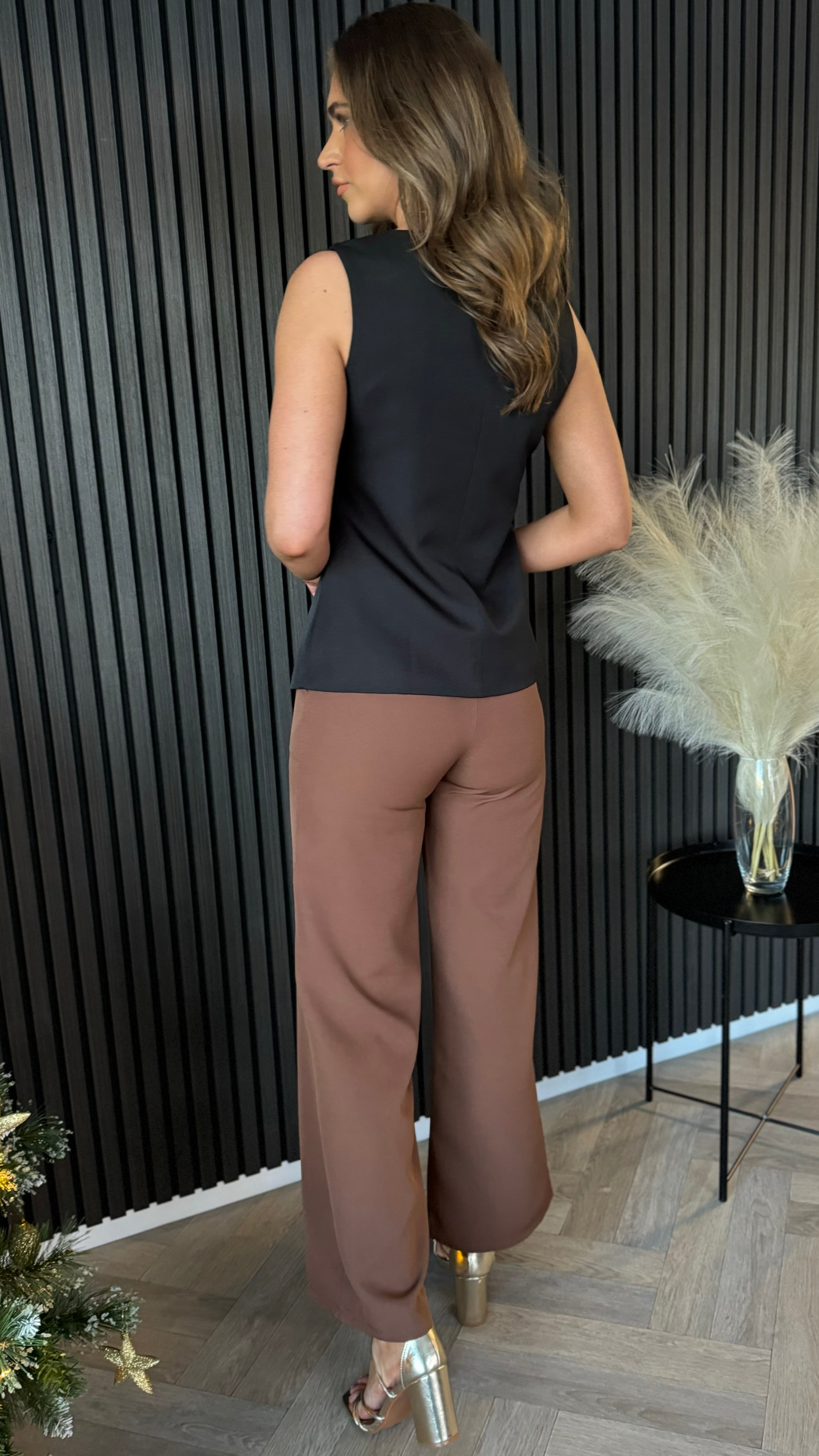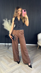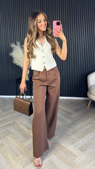Get ready to rule the fashion game with our Effie Chocolate Brown Wide Leg Trousers! These stylish trousers not only make a statement, but also offer a flattering and comfortable fit. Stand out from the crowd and exude confidence in these must-have trousers.