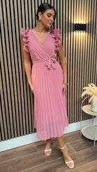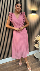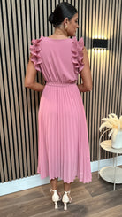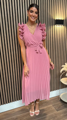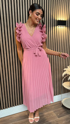 Get ready to be the life of the party in the Farah Dusky Pink Pleated Midi Dress. With frill sleeves, a belted waist, and an elasticated waistband, this v-neck dress is perfect for special occasions. Its pleated skirt adds a touch of elegance while ensuring you can dance the night away comfortably.