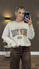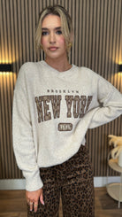 Stay snug and stylish in the Fiona Beige Round Neck 'New York' Jumper! With its soft, cosy fabric, ribbed cuffs, and hem, this jumper hugs you just right while those long sleeves keep you warm. Perfect for casual days when you want comfort with a dash of fun flair.
