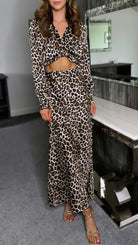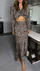 Get ready to turn heads with our Georgette Camel & Black Leopard Printed Crop Shirt & Midi Skirt Co Ord! This stylish set features a collared v neckline top with a playful knot detail and long sleeves for a touch of sophistication. Perfect for any occasion, this co ord is sure to make a statement. 🌸