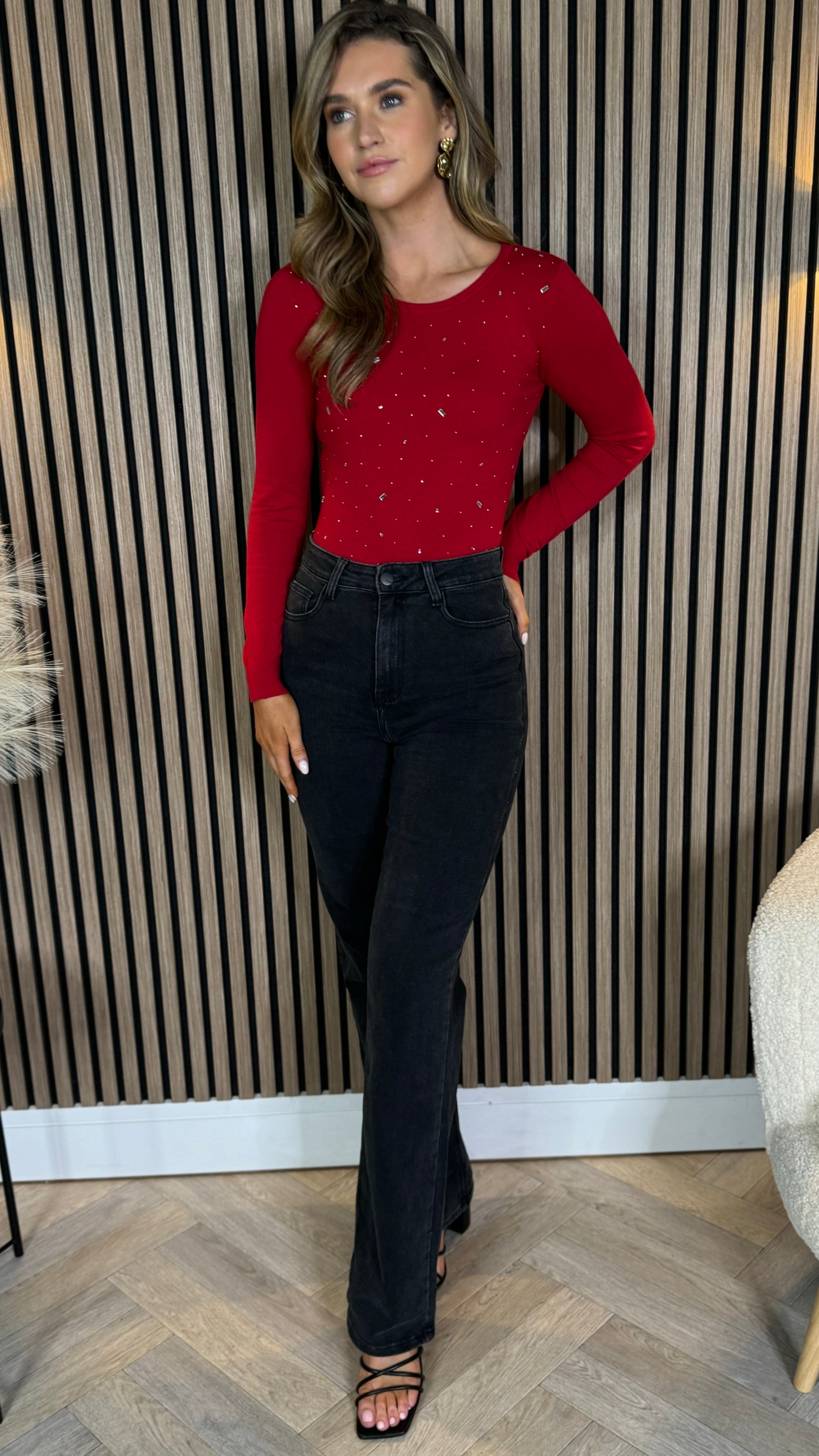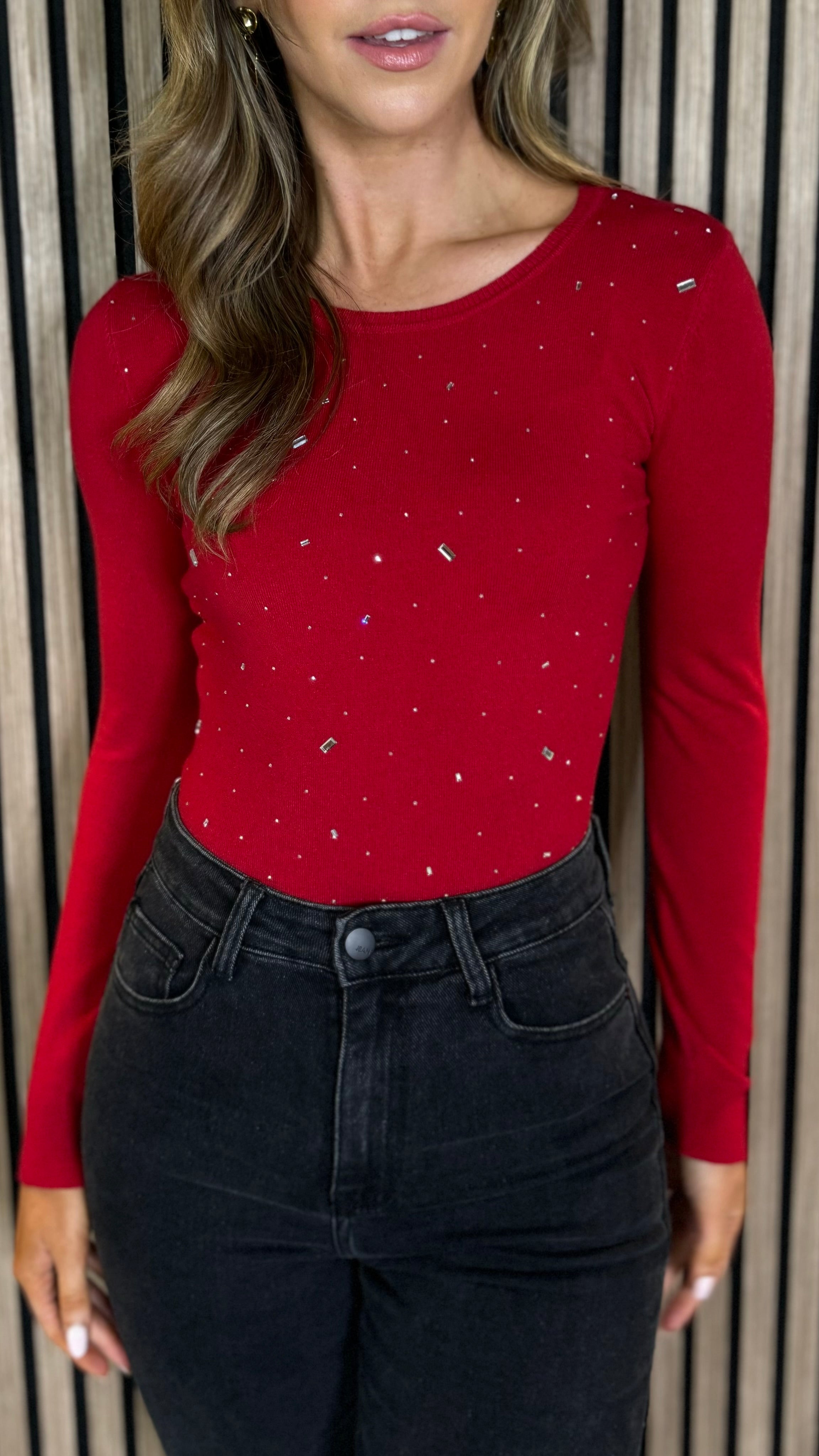 Get ready to slay in this Harmony Red Embellished Detail Fine Knit Bodysuit 👌 Flaunt a round neckline and different size embellishments, all while staying comfy in its fine knit material. Perfect for a night out or just slaying your everyday look 💁♀️🔥