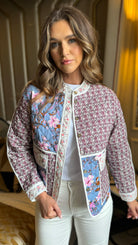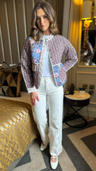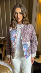 Stay warm and stylish with the Harriet Pink Floral Patchwork Quilted Jacket. Featuring a round neck and padded design, this jacket is perfect for chilly days. Make a statement with the unique floral patchwork and stay cozy all season long.