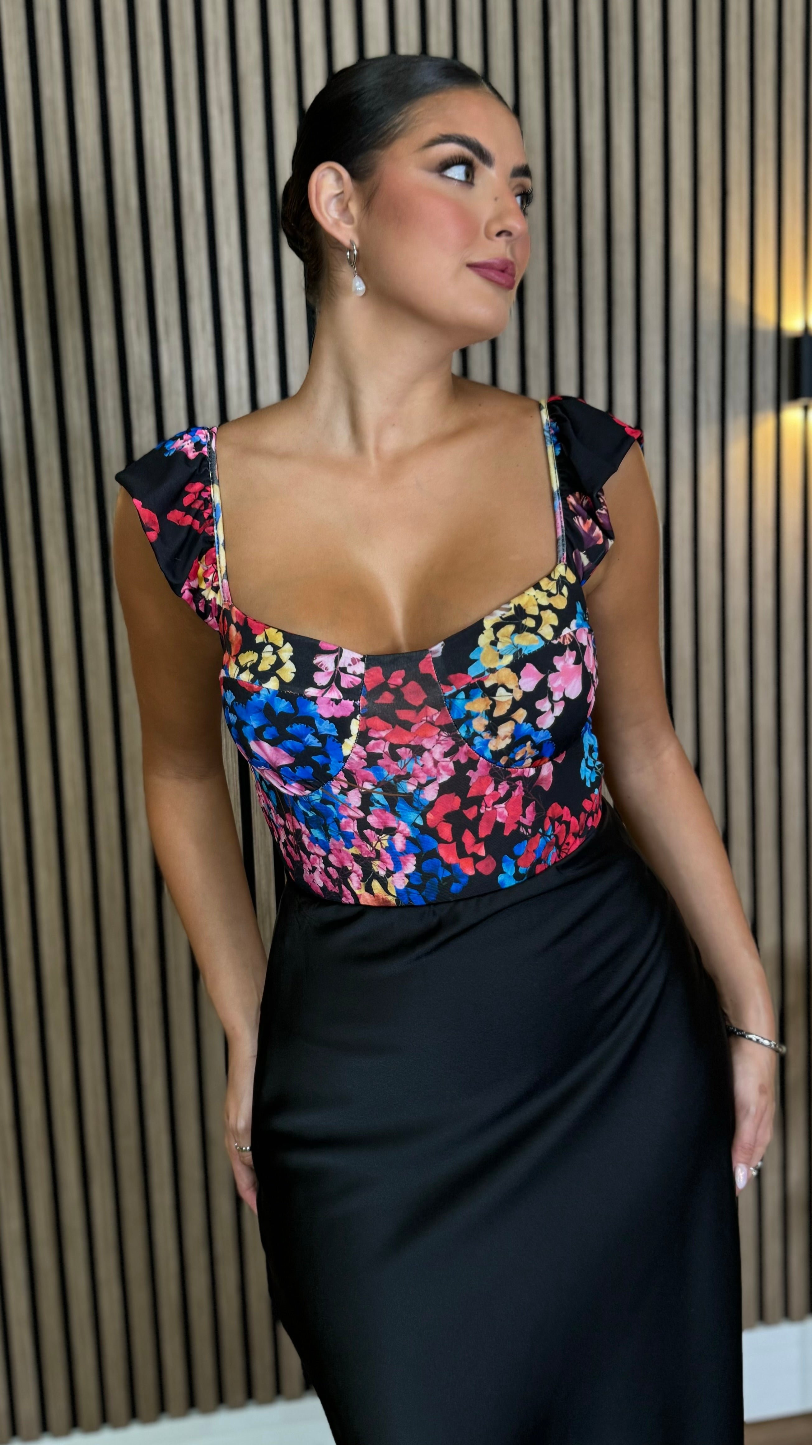 Heather Black & Multi Coloured Floral Cupped Bodysuit