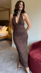 Hester Brown Sequin Halterneck Maxi Dress