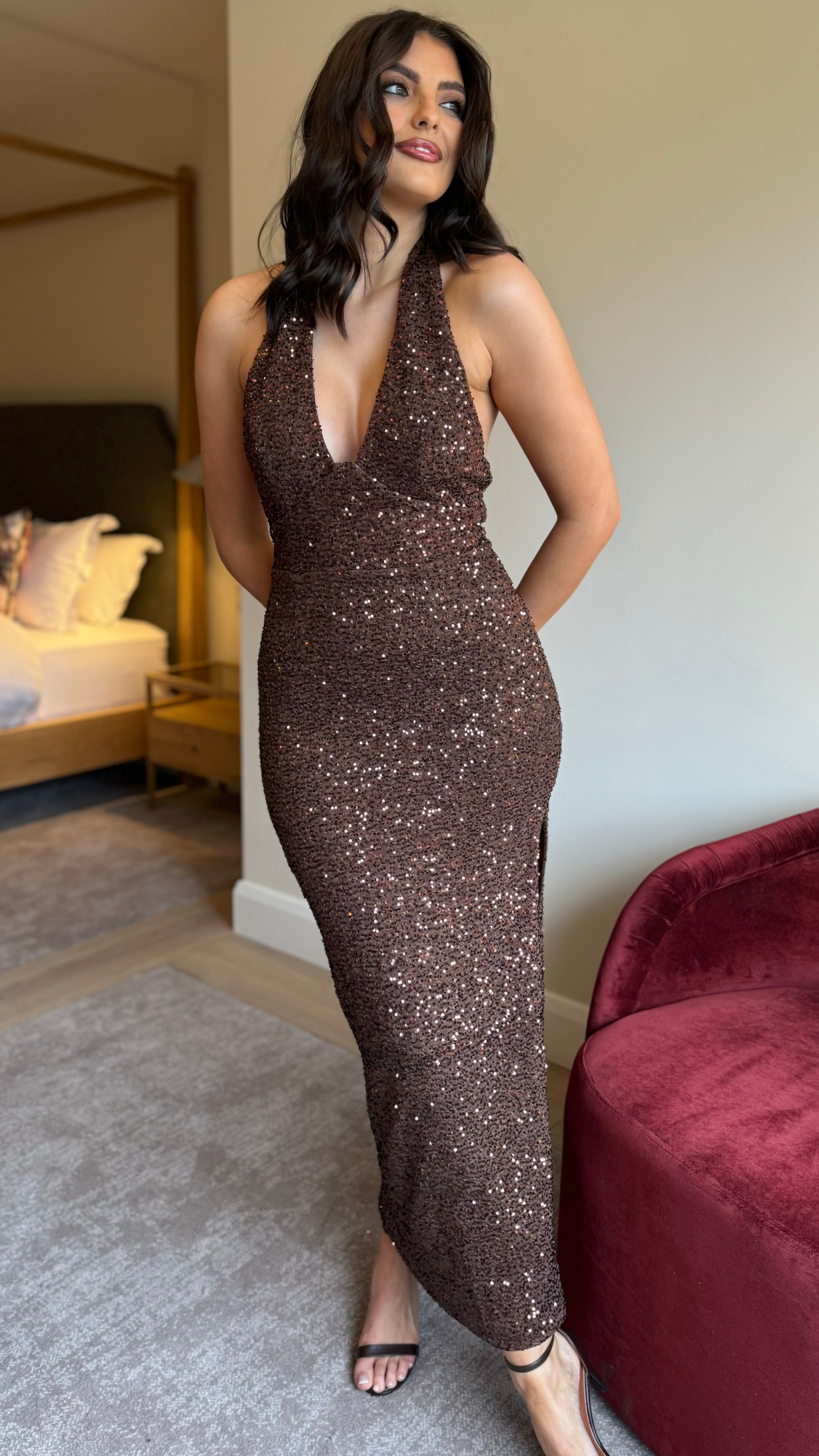 Turn heads in this stunning Hester Brown Sequin Halterneck Maxi Dress. The plunging halterneck and fitted silhouette create an effortlessly glamorous look, while the maxi length keeps things sophisticated. A daring side slit adds movement and flair, and the tie fastening at the back of the neck ensures a secure, adjustable fit. Perfect for making a sparkling statement at your next event.