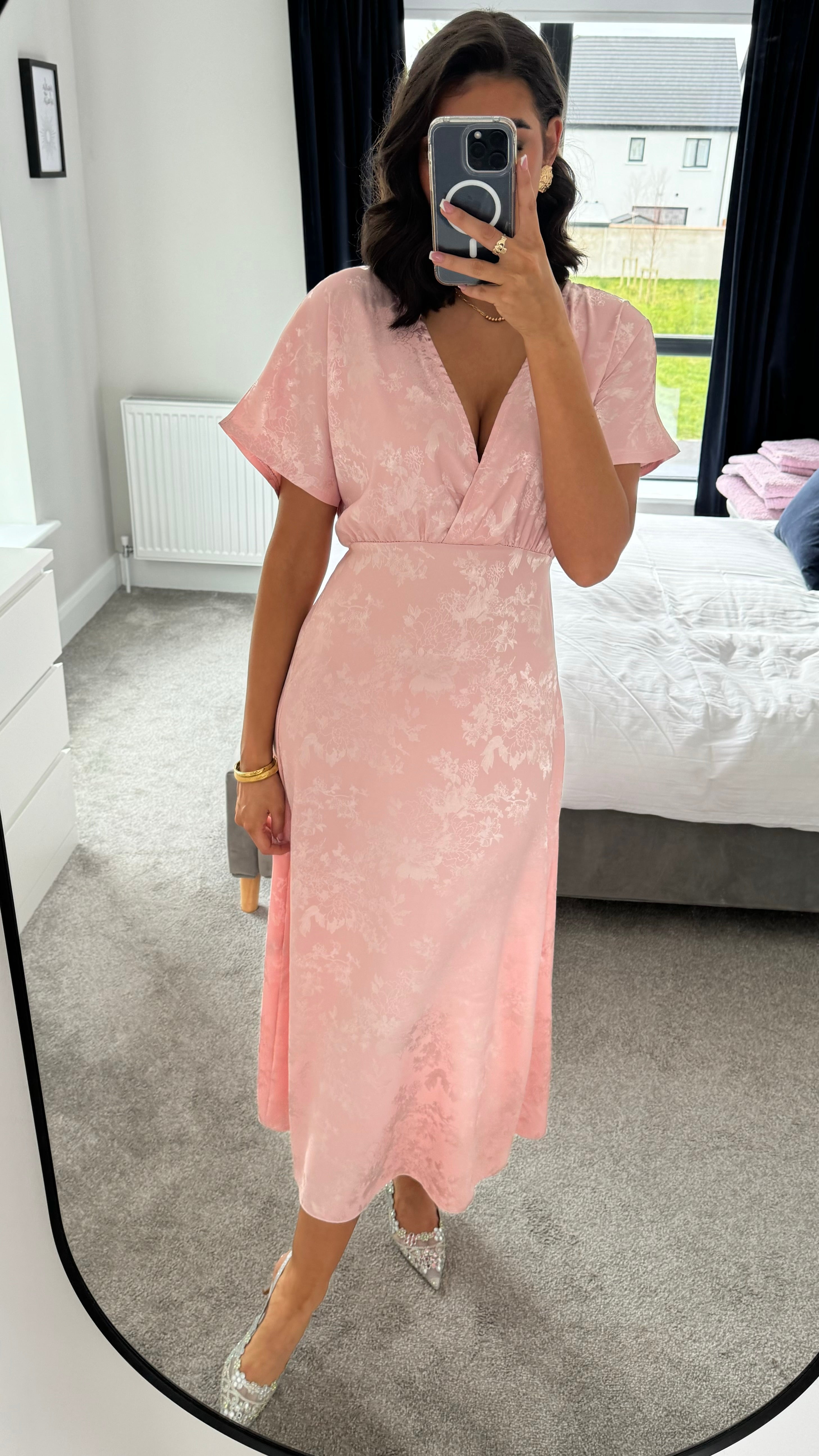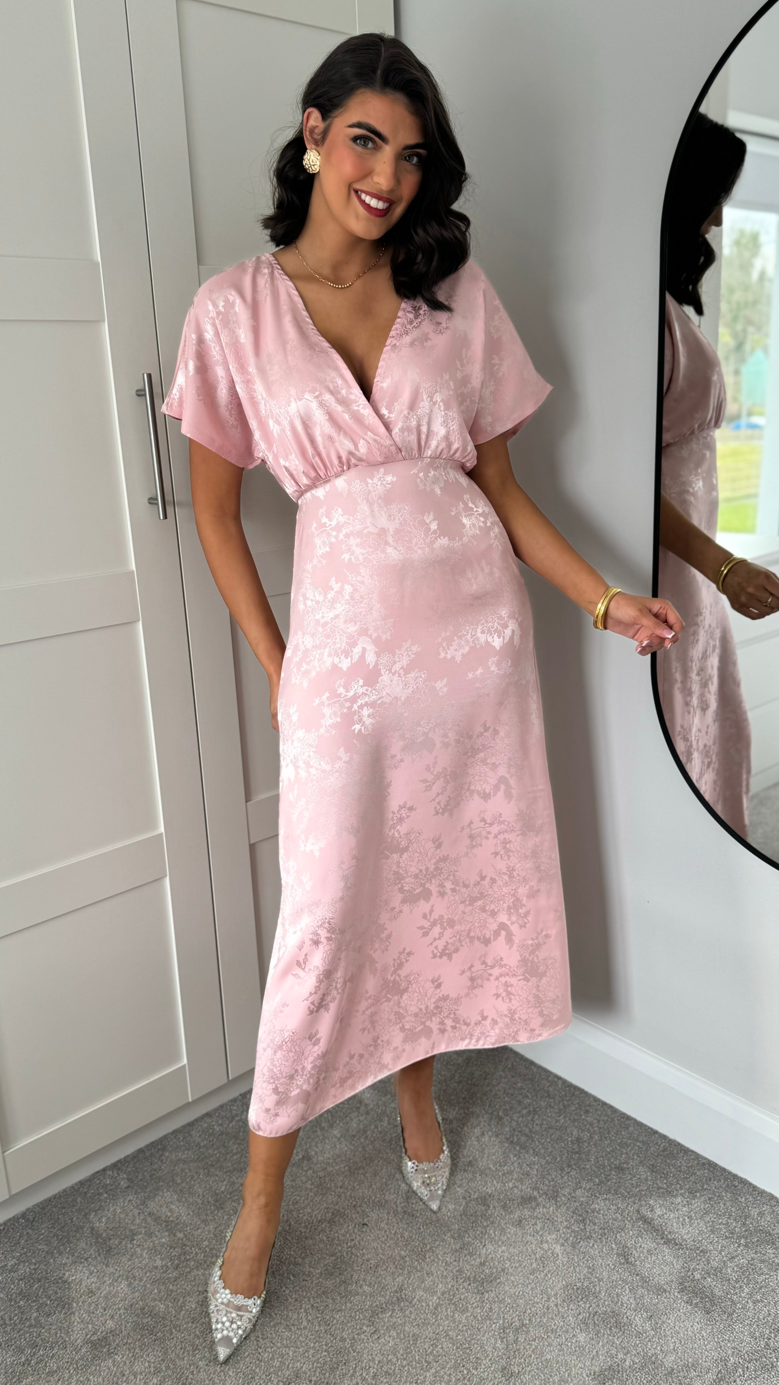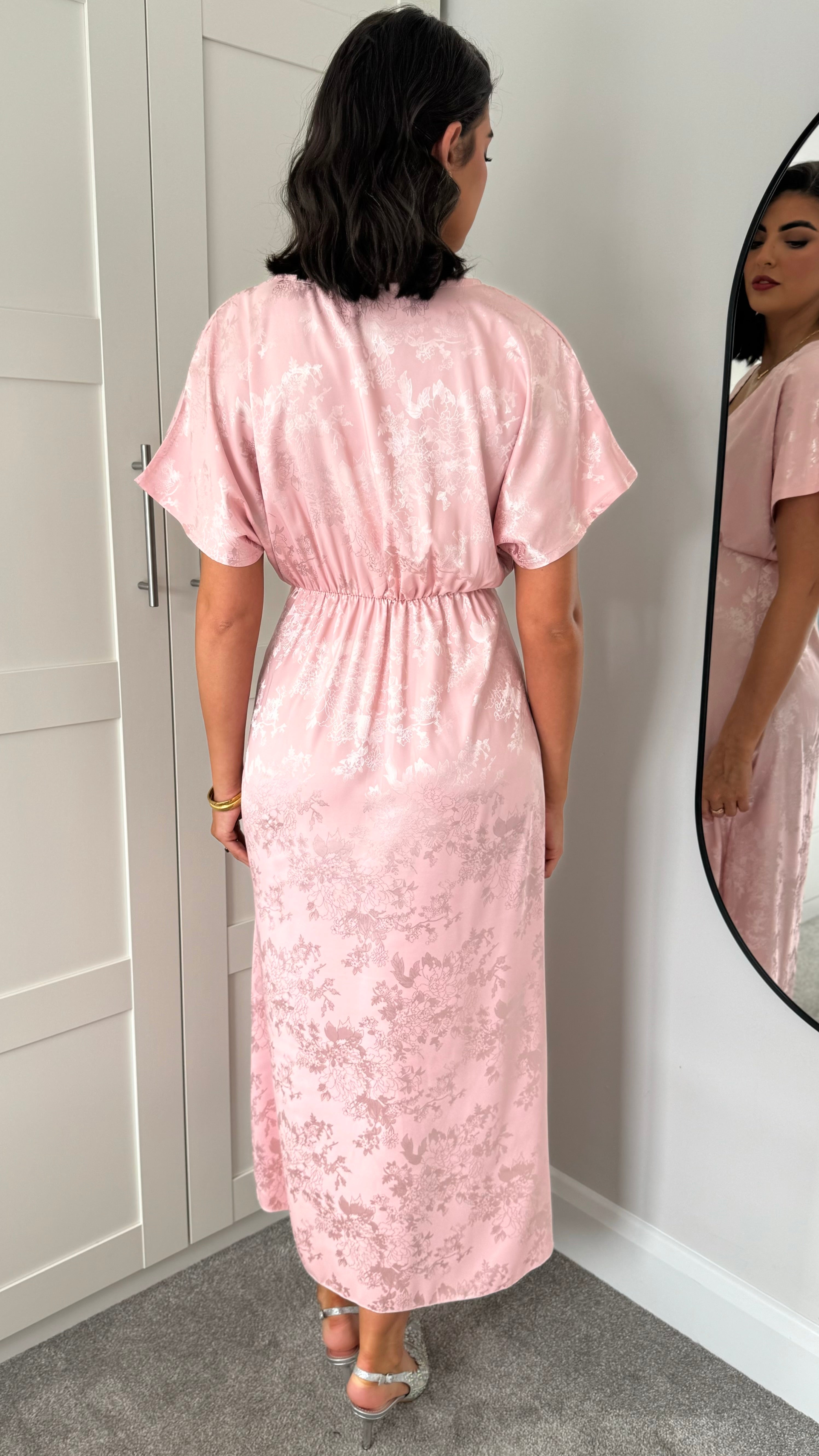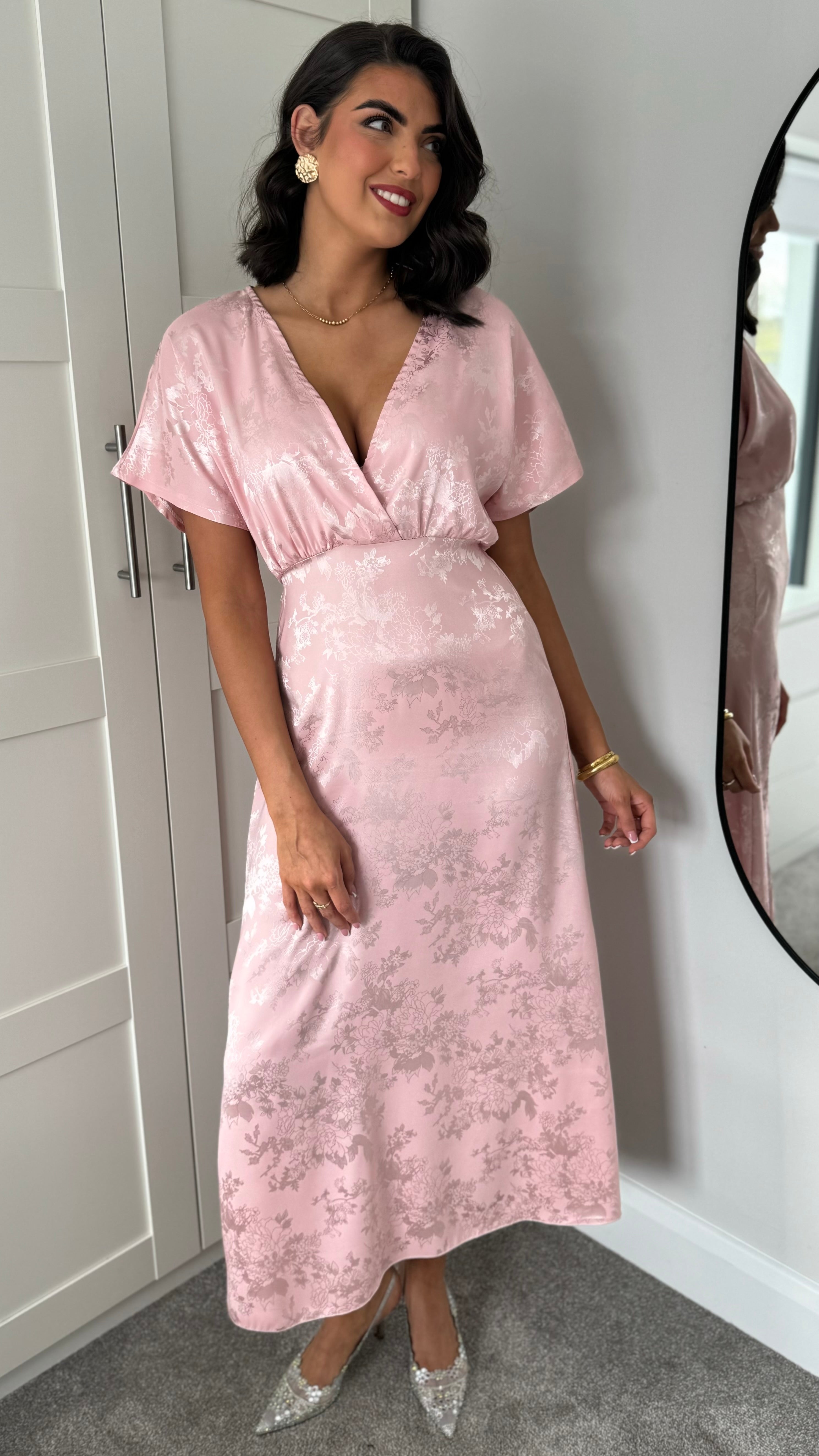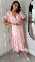 Feel like royalty in the Inez Rose Pink Printed Satin Finish Midi Dress! This dress features a stunning v-neckline and wide, short sleeves for a comfortable yet stylish look. The printed satin finish adds a luxurious touch to any occasion. 👑