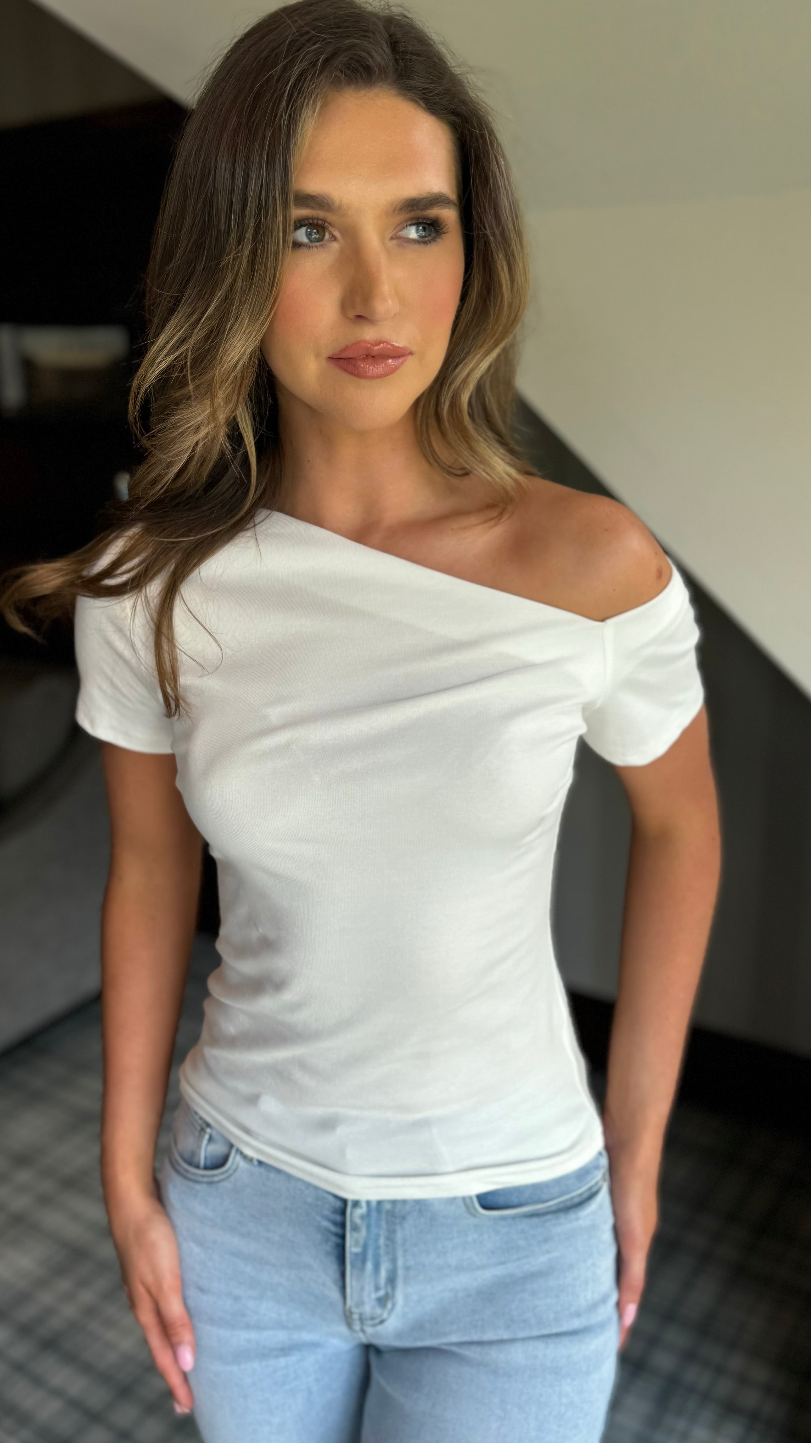 Show those shoulders some love with our Ivy White One Shoulder Jersey Top. This playful piece features a single shoulder design and short sleeves that are perfect for any occasion.