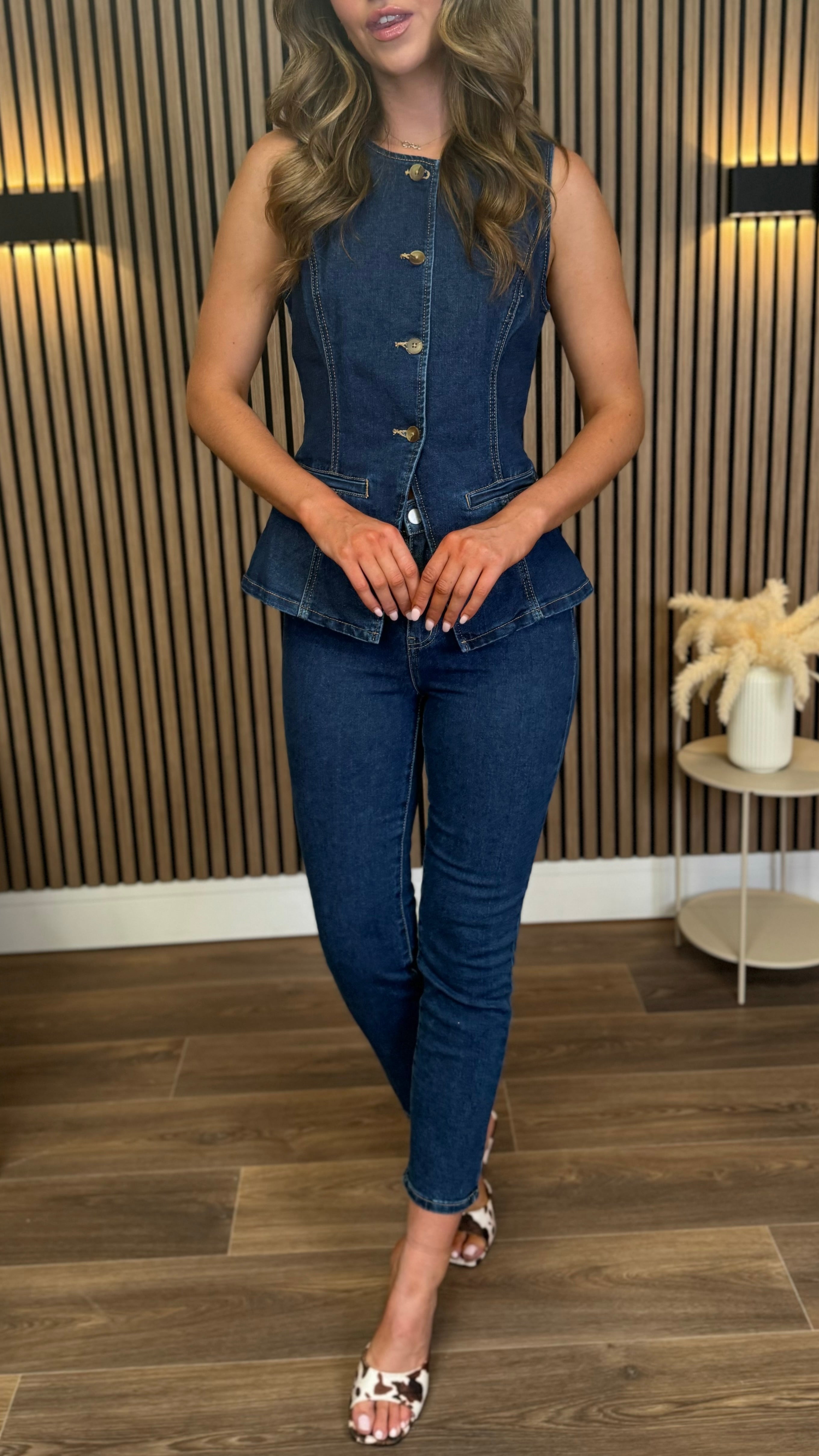 Jane Denim Longline Marble Effect Button Detail Waistcoat