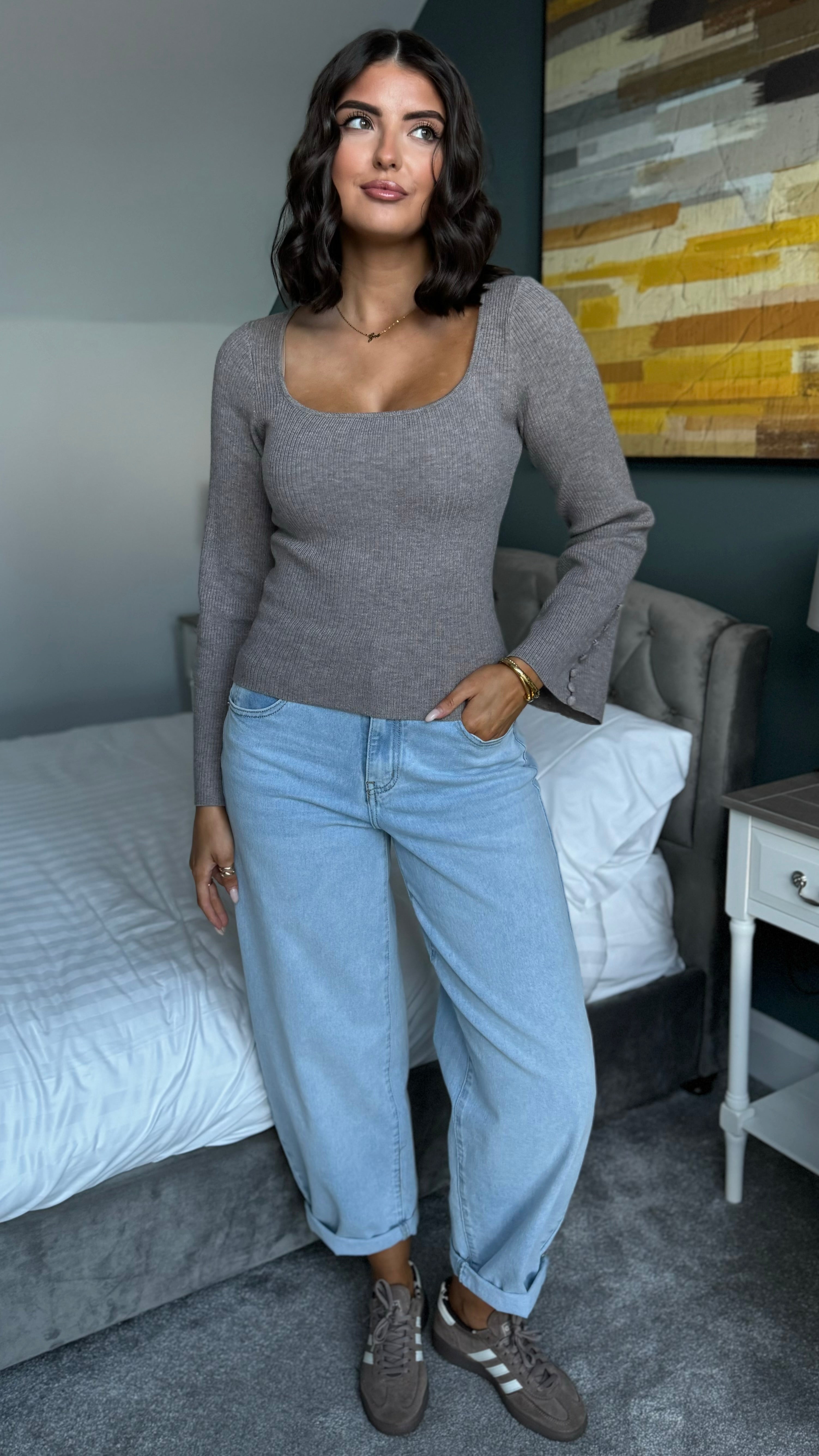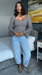 The Joyce top is your new go-to for effortless style. This taupe ribbed knit features a chic square neckline that frames the shoulders beautifully, while generously wide sleeves add a modern, relaxed vibe. Sweet button details at the cuffs let you adjust the fit to your mood—cinch them snug or let them flow loose. Versatile enough for casual days or dressed-up evenings, this piece is about to become your wardrobe's best friend.