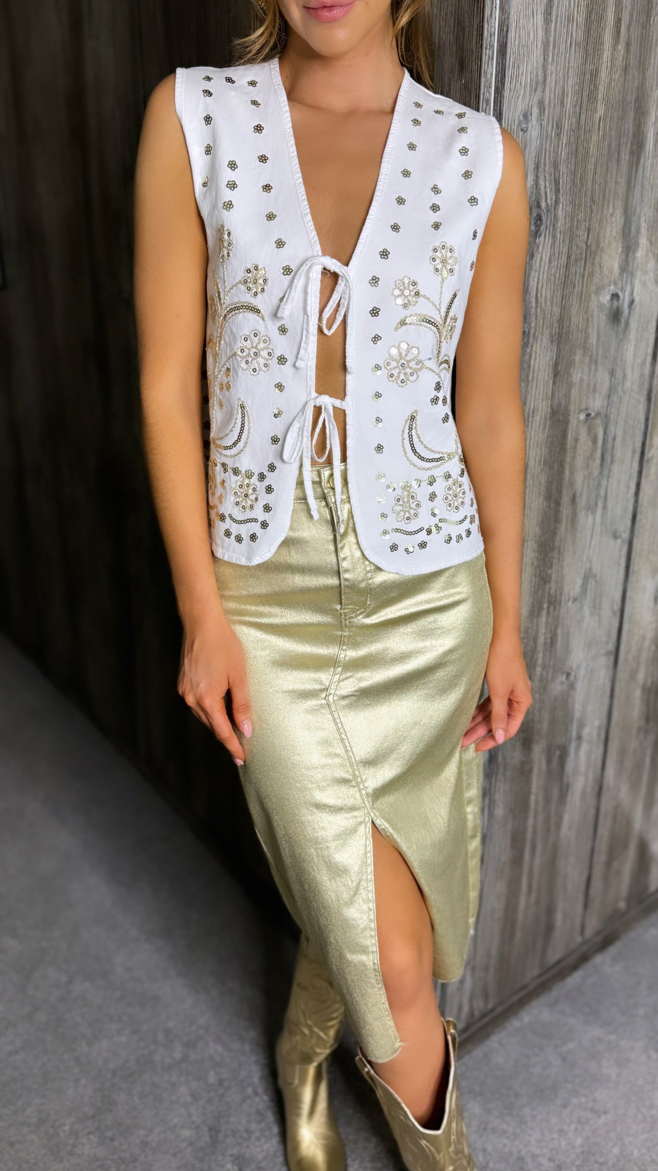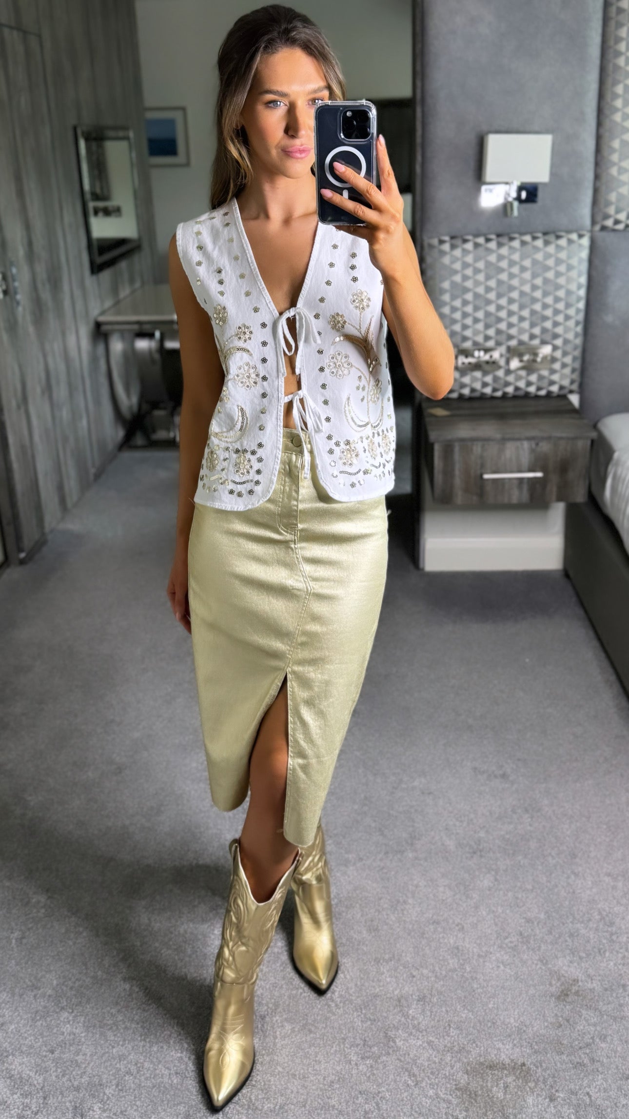 Get ready to slay in style with the Julian Gold Midi Skirt! This quirky and fun skirt features a playful length and a chic gold hue, perfect for adding a touch of glam to any outfit. Whether you're dressing up for a night out or keeping it casual, this skirt is sure to make a statement. 💫👗