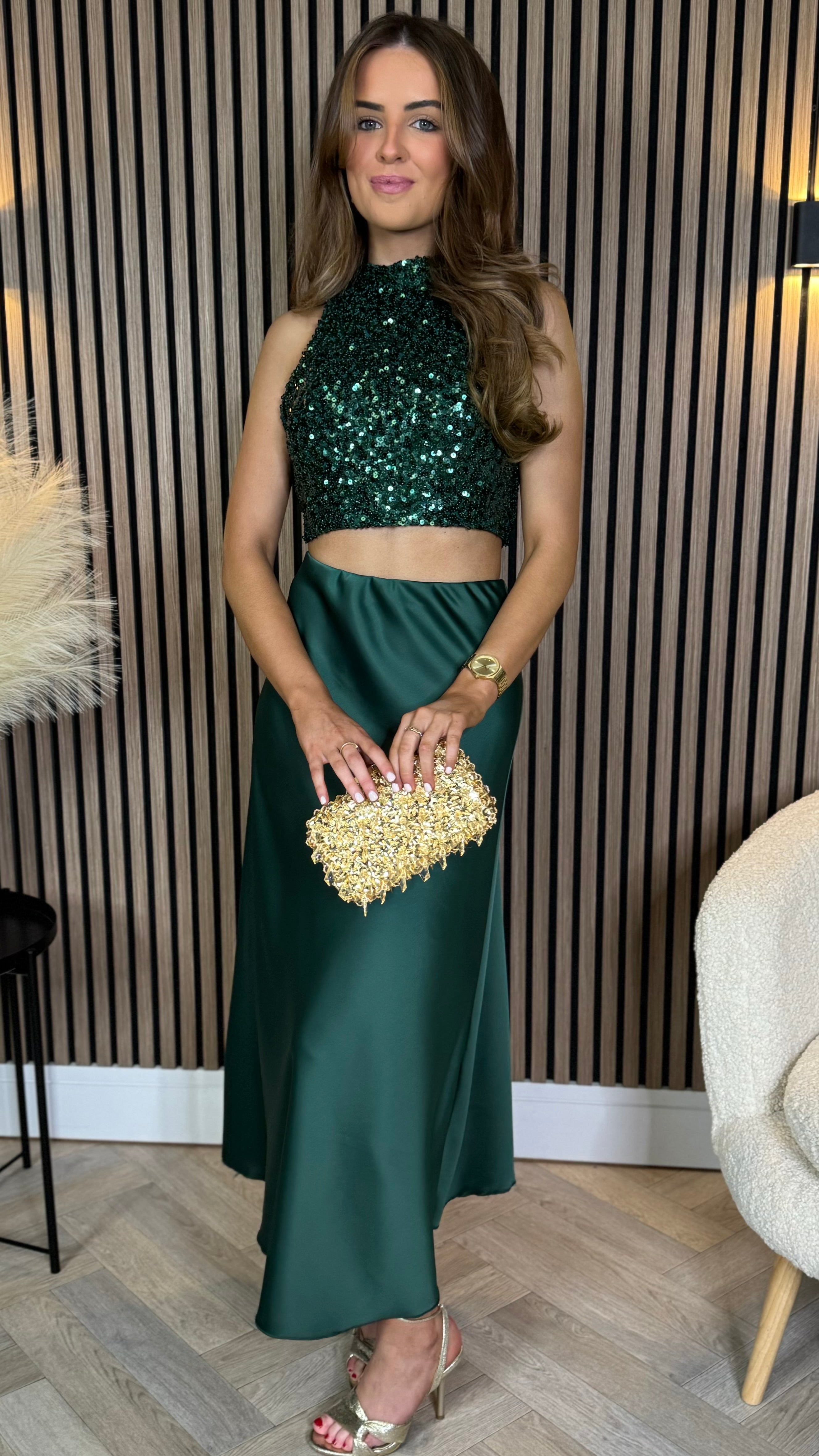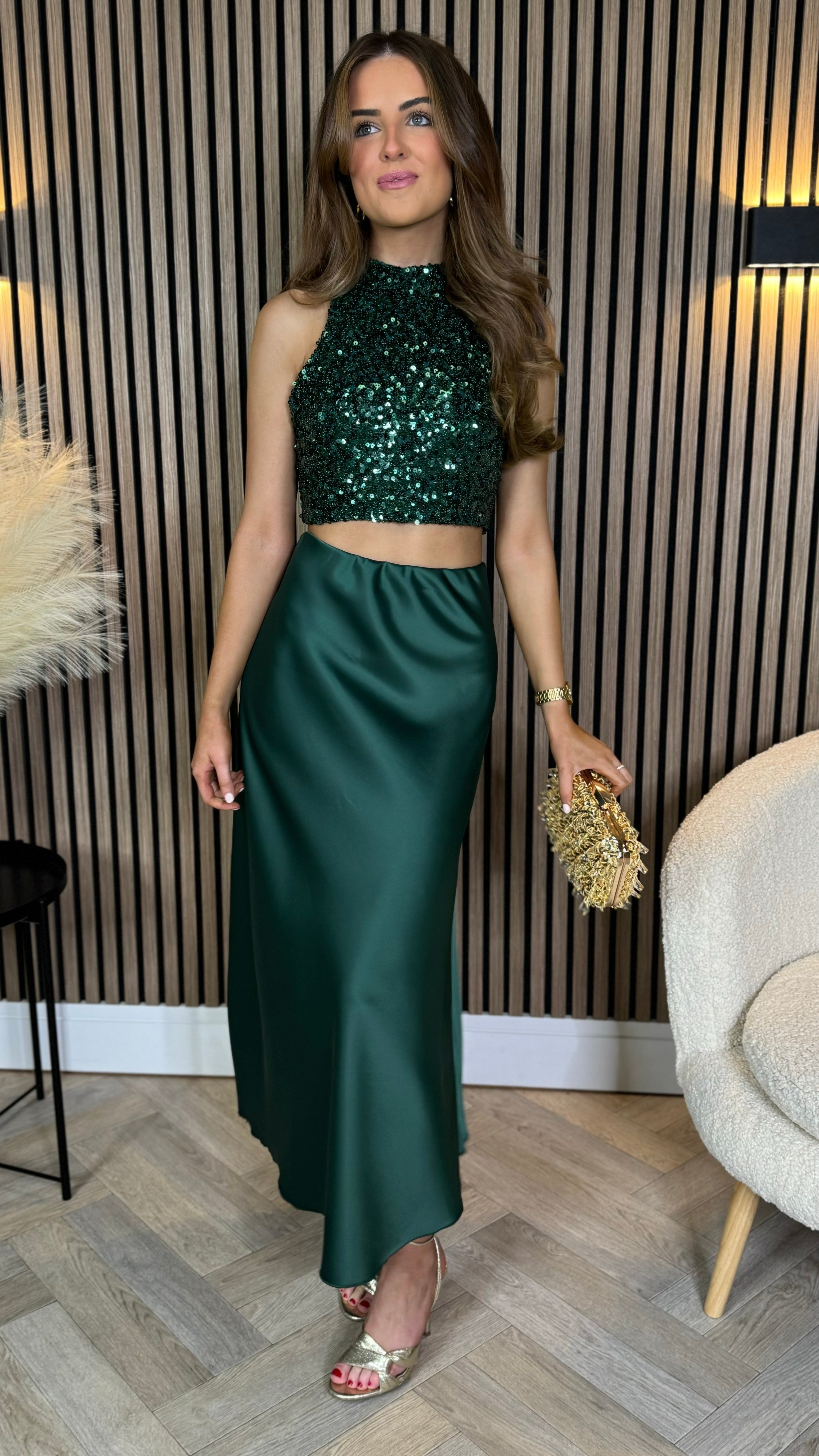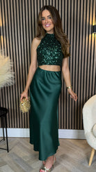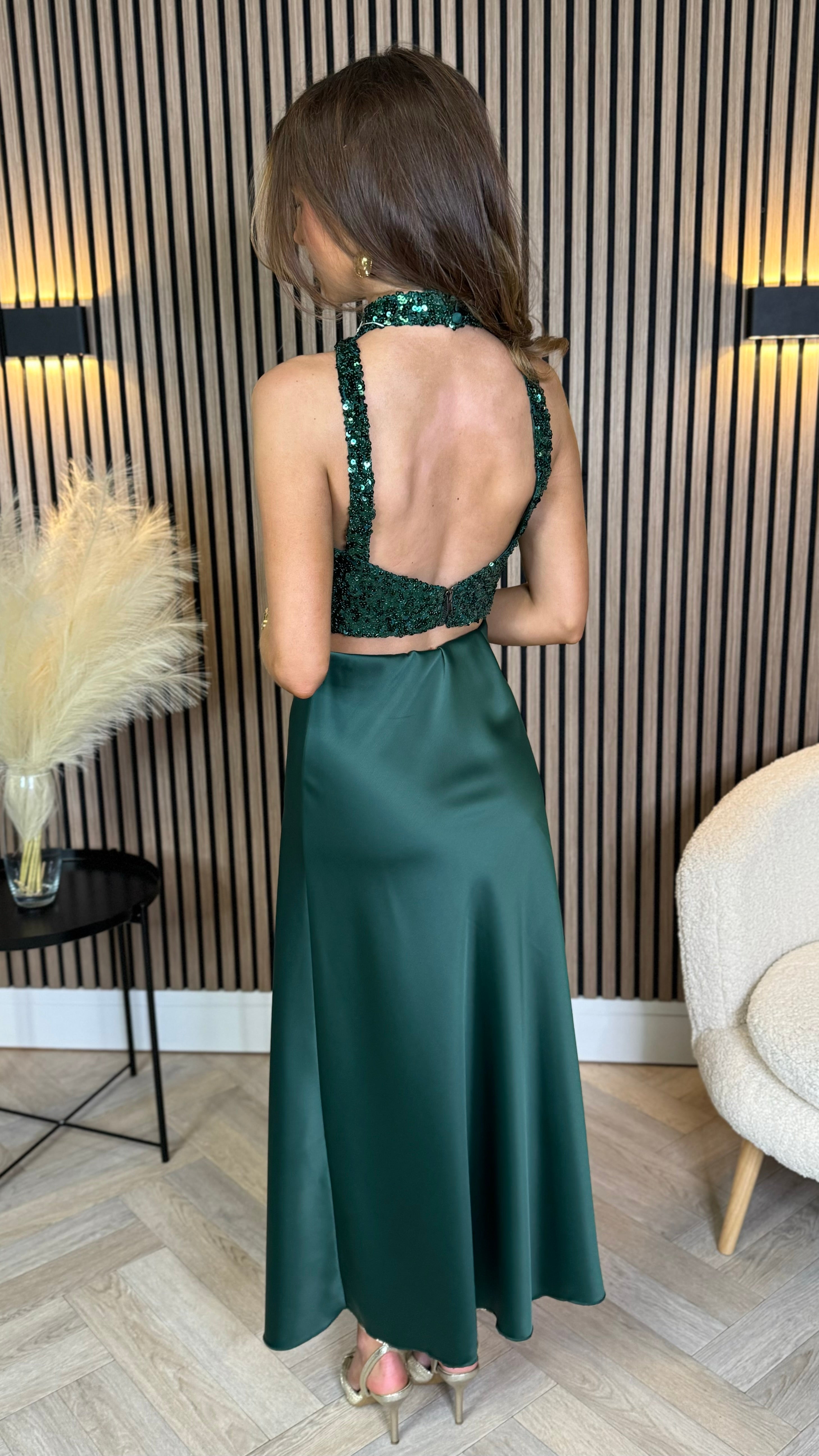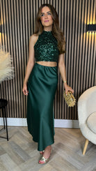 Kara Forest Green Backless Halterneck Sequin Crop Top