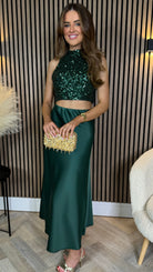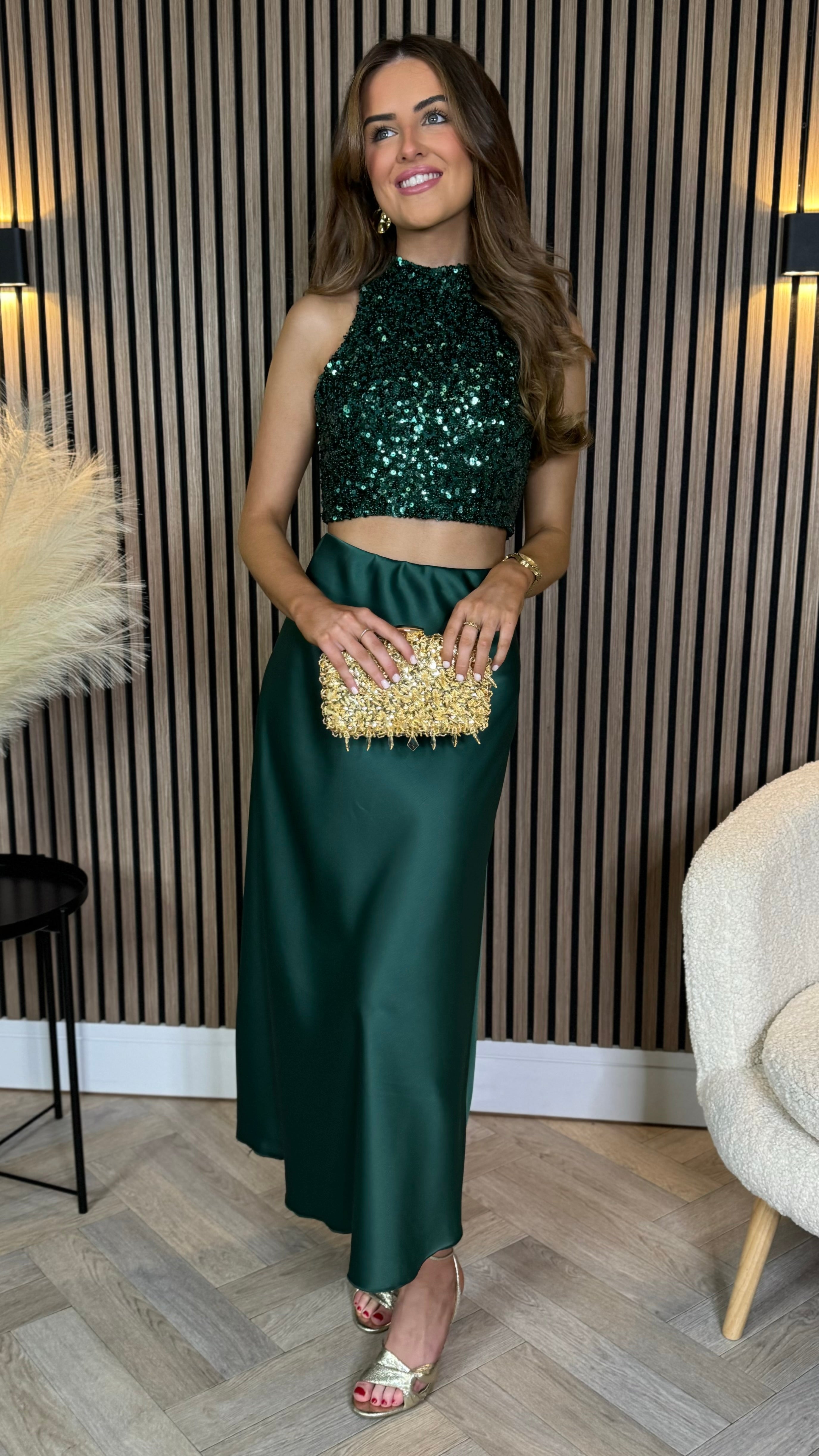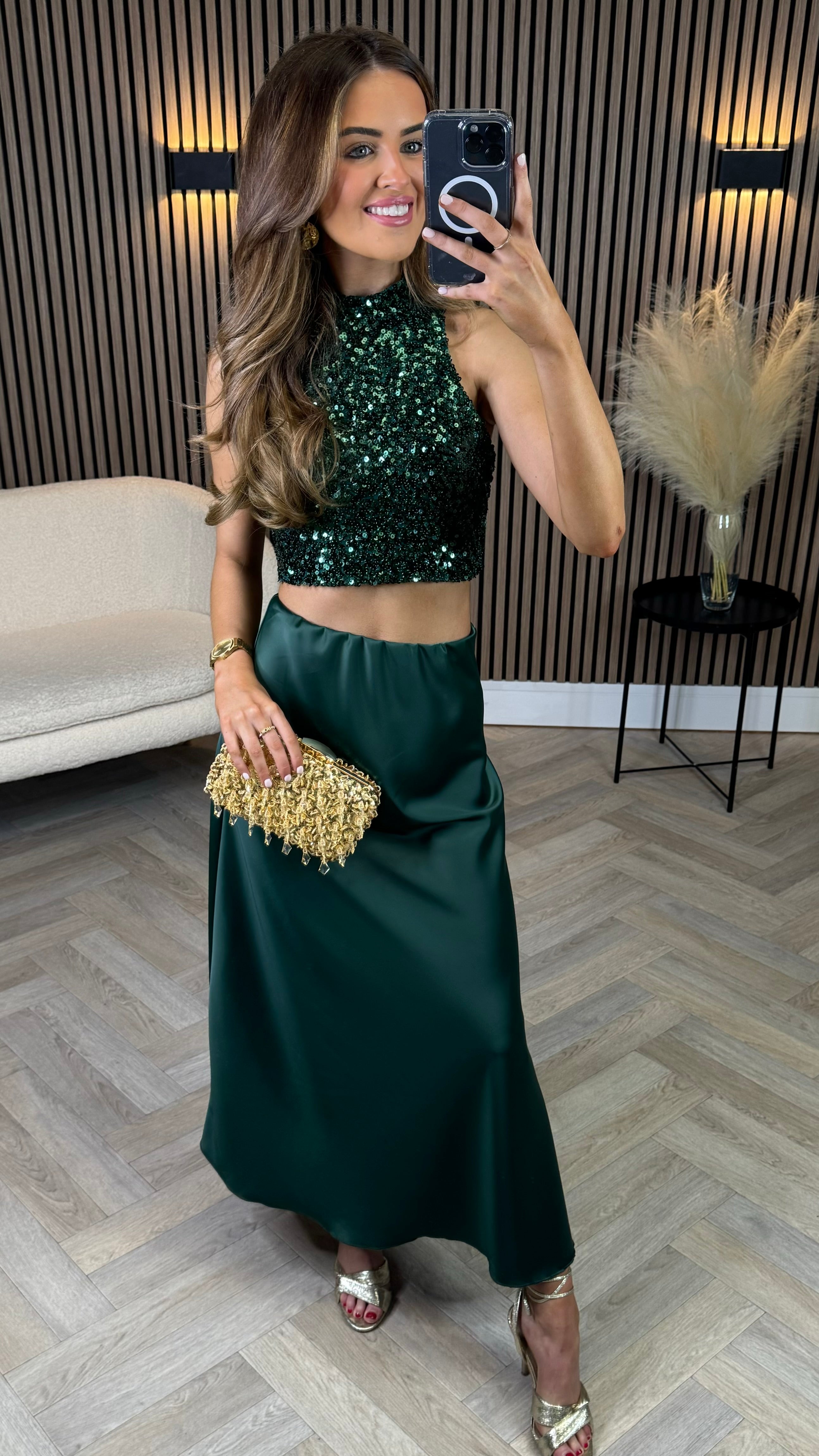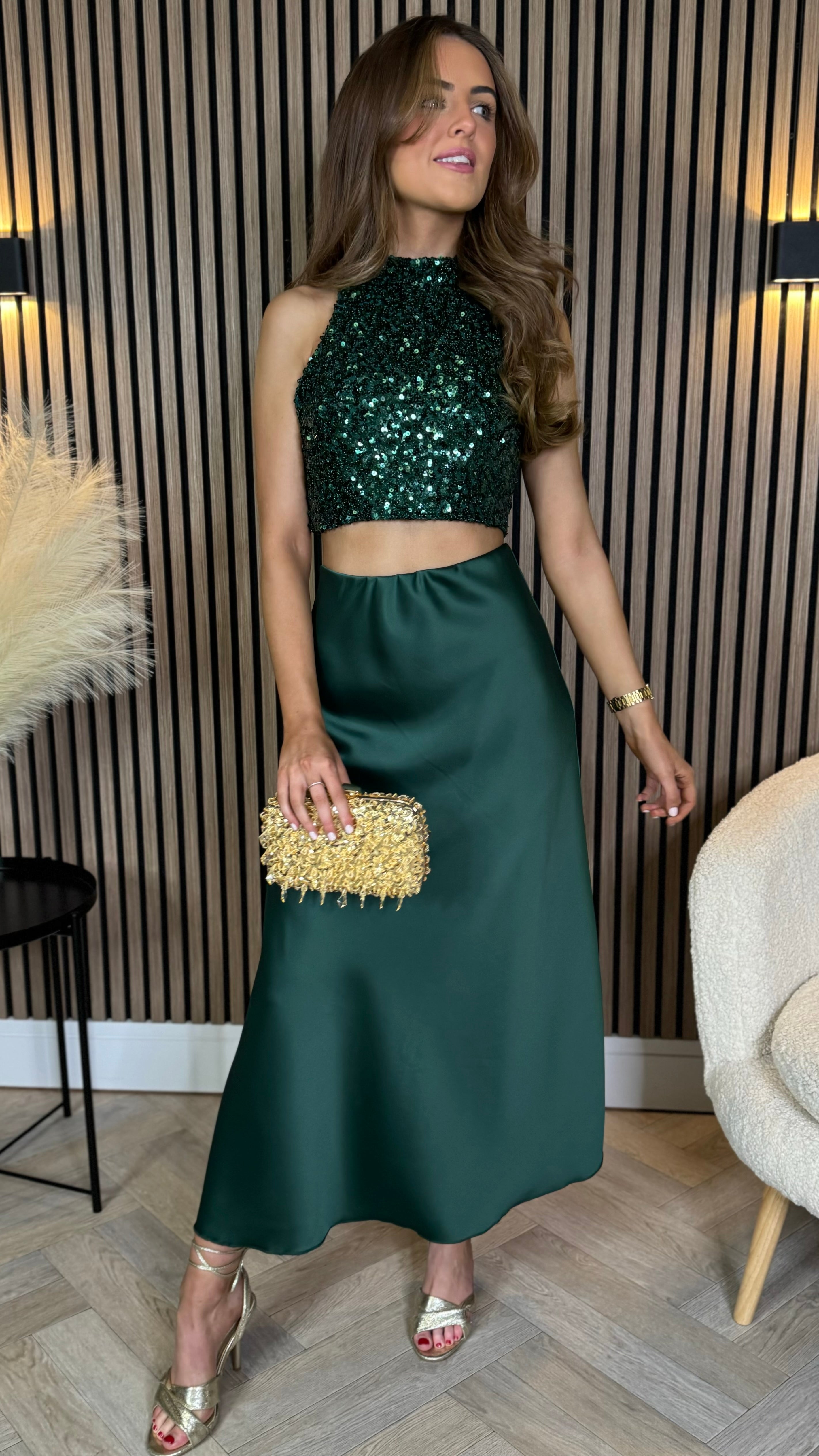 Kara Forest Green Backless Halterneck Sequin Crop Top