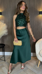 ✨ Make a statement with our Kara Forest Green Backless Halterneck Sequin Crop Top! This playful top features a fun halter neck design and eye-catching sequins. Guaranteed to turn heads and add some sparkle to your wardrobe! 💫