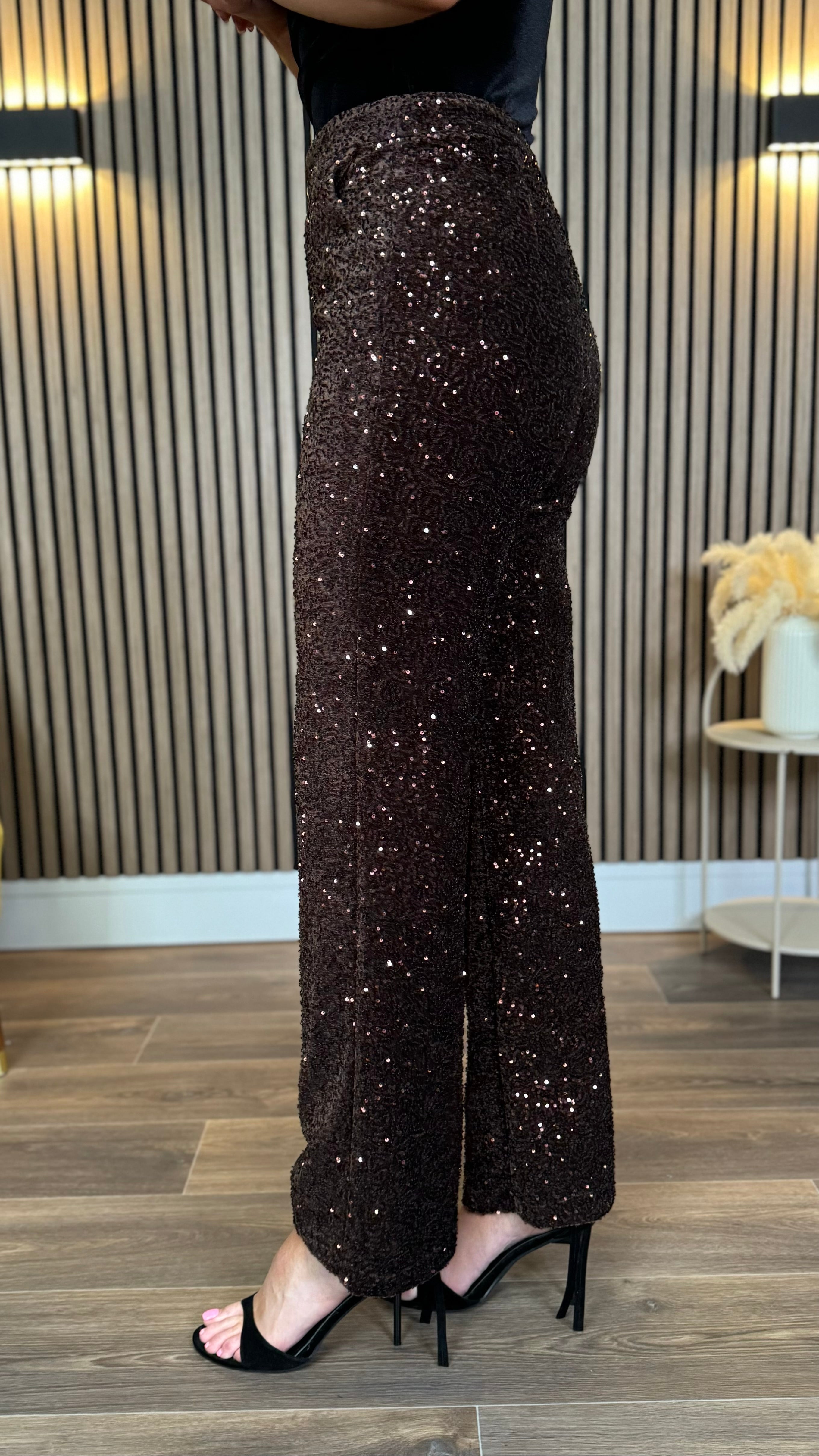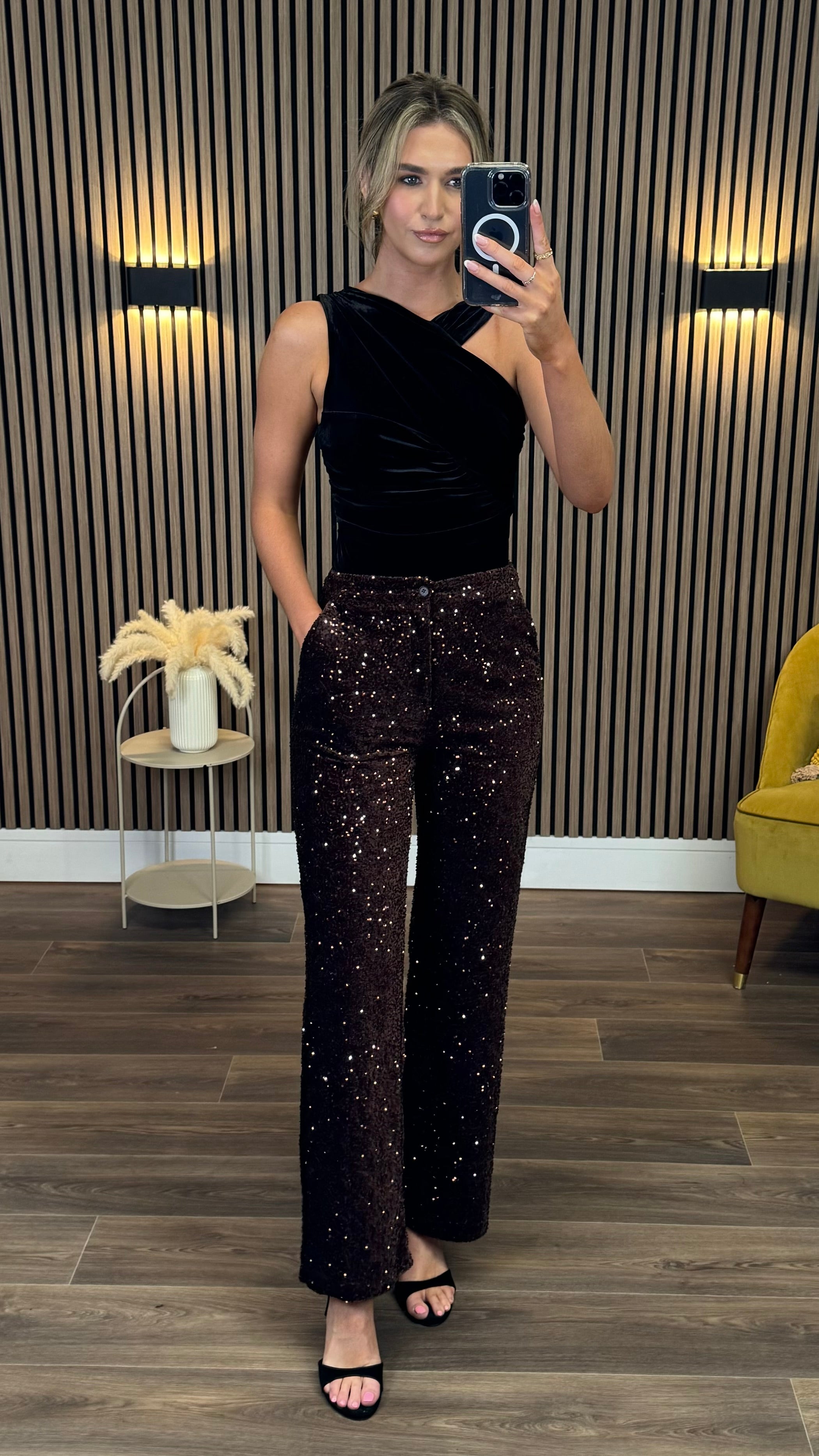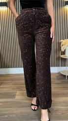 These Labhaoise Brown Velvet Sequin Trousers bring a playful twist to your wardrobe with their high-waisted design and sleek black button detail. Featuring handy front pockets and a straight fit, they combine comfort with style effortlessly. Perfect for adding a sparkling touch while keeping things chic and fun!