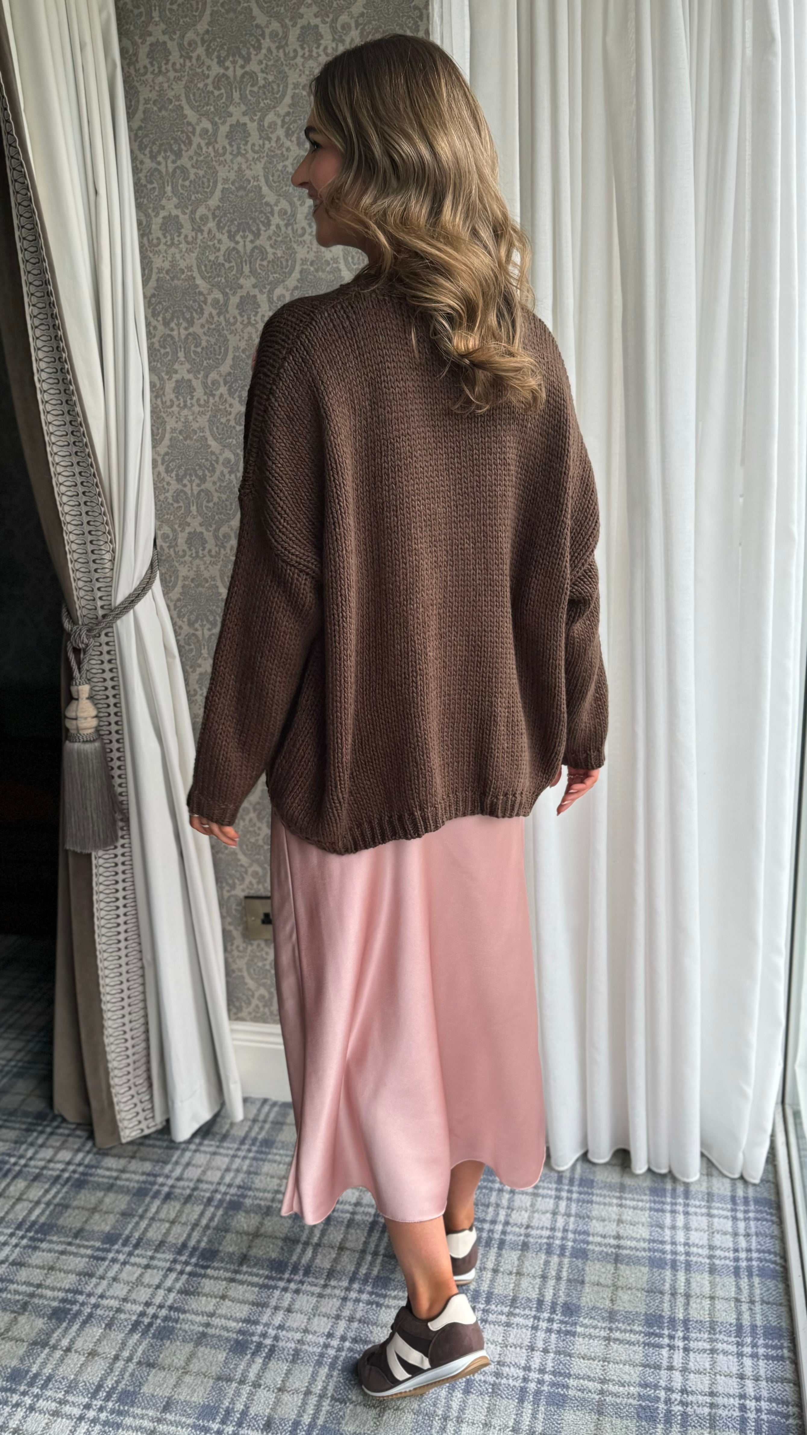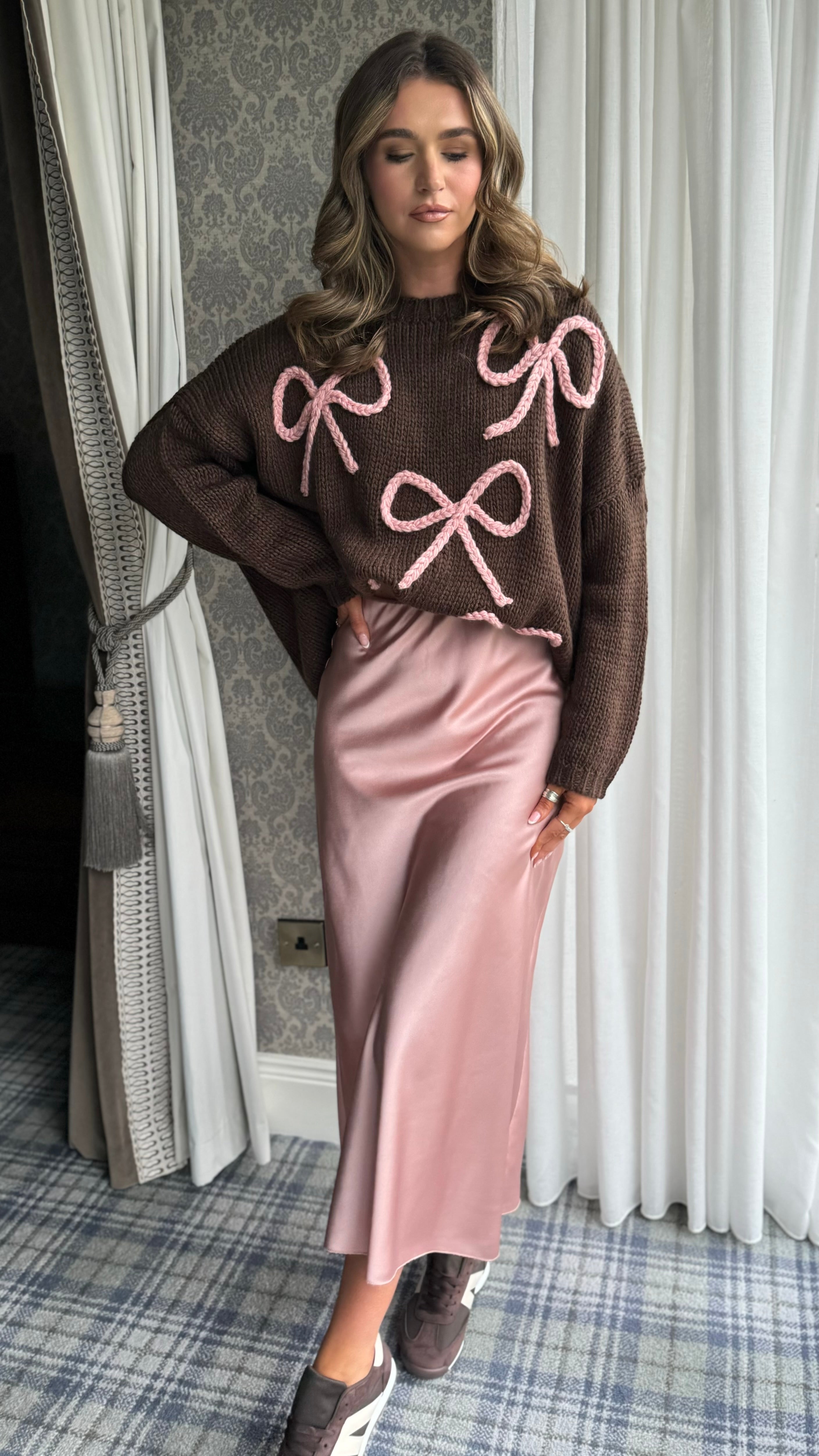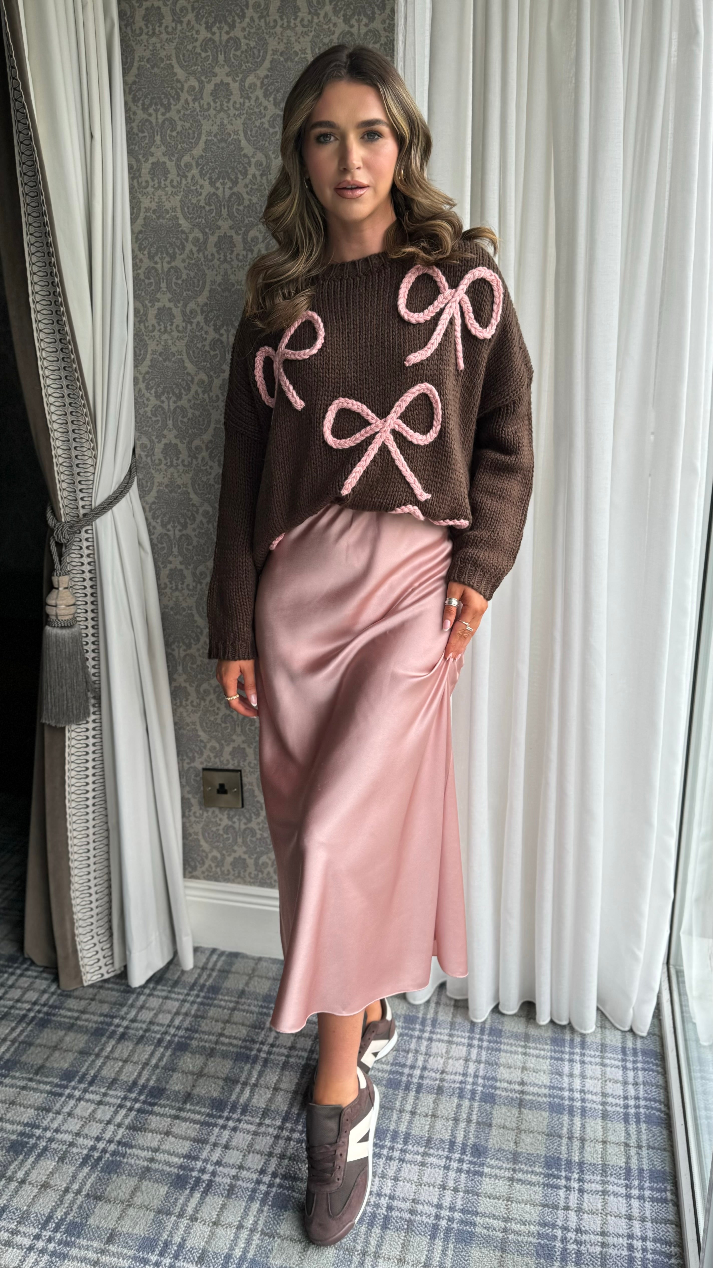 Cozy up in style with the Leigh-Anne Brown & Pink Bow Design Jumper! Featuring a playful oversized fit and chunky knit, this jumper wraps you in warmth and comfort. The round neckline and long sleeves add classic charm, while the standout bow design brings a fun, flirty touch to your look. Perfect for layering or wearing solo on cooler days, it’s your new go-to for effortless, cheerful fashion.