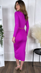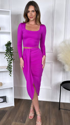 Get ready to drop some jaws with the Leona Fuchsia Crop Top & Midi Skirt Co Ord! This bold and sassy set includes a square neckline, long sleeve crop top and a ruched and draped midi skirt that'll have all eyes on you. It's the perfect look for a night out on the town. 😍 #twopiece #coord