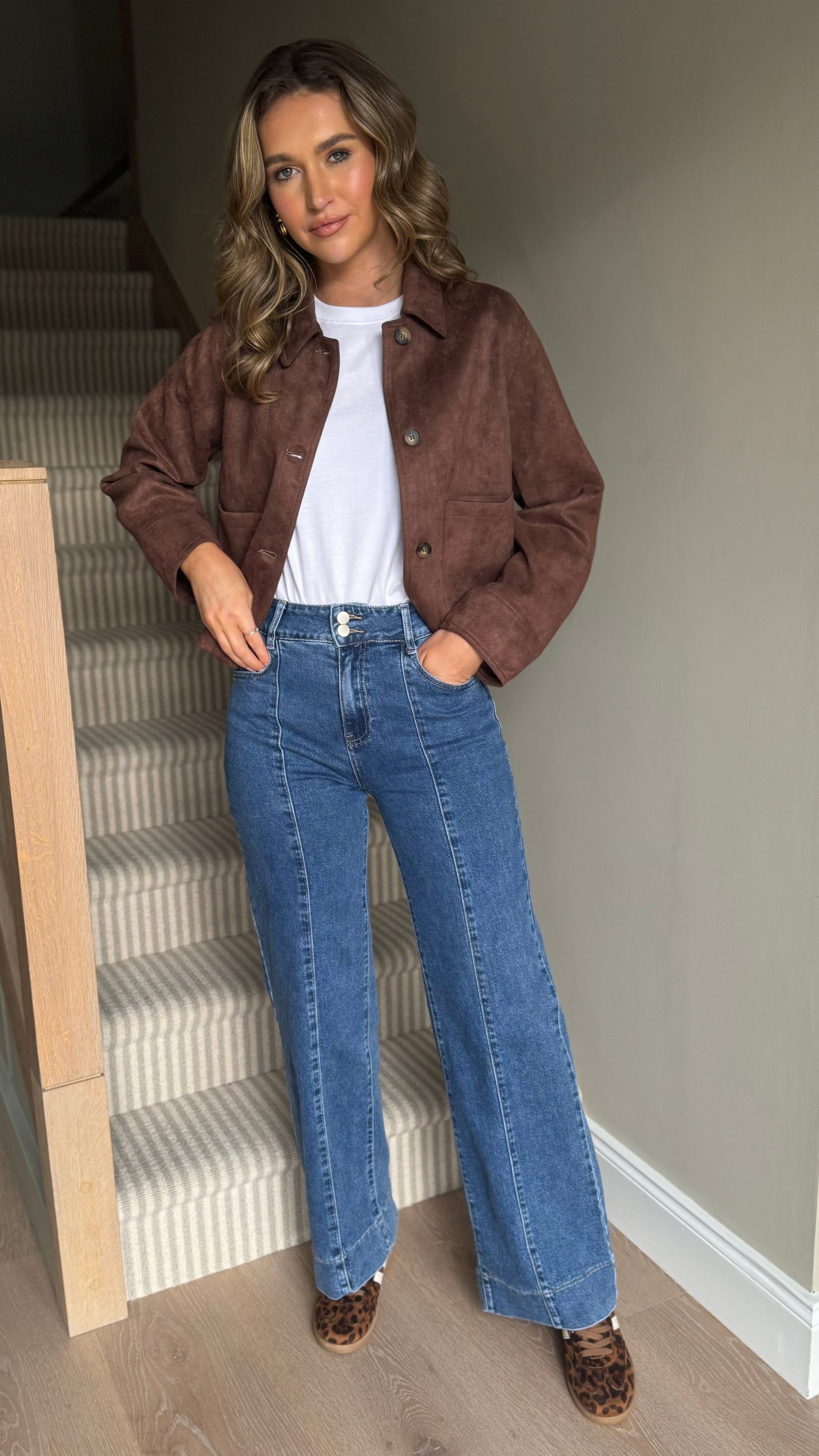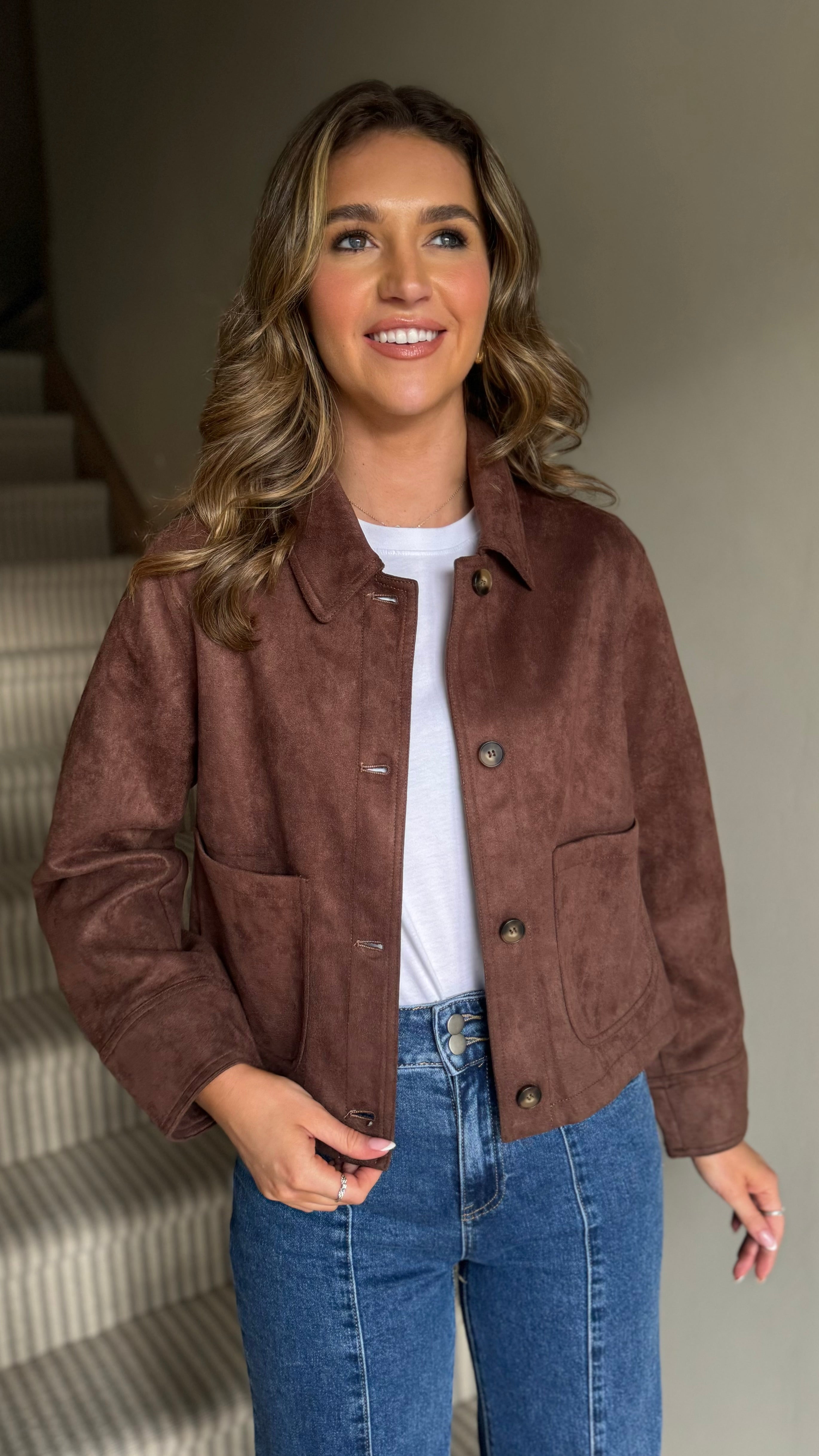 Wrap yourself in cozy charm with the Libby Chocolate Brown Faux Suede Jacket. Its soft faux suede texture and playful collar detail accented by brown buttons add a stylish twist. Large front pockets keep essentials close, while wide sleeves and a boxy fit give you room to move and a relaxed vibe. Perfect for adding a touch of fun and comfort to any outfit!