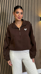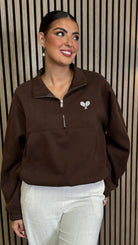 Serve up style and comfort with the Lina Brown Tennis Detail 1/4 Zip Top! This playful piece adds a sporty twist to your wardrobe, perfect for warming up or cooling down on the court. Its sleek 1/4 zip design lets you adjust your look and ventilation with ease, while the tennis-inspired details bring a fun, energetic vibe to your game day or casual outings. Get ready to ace your style!