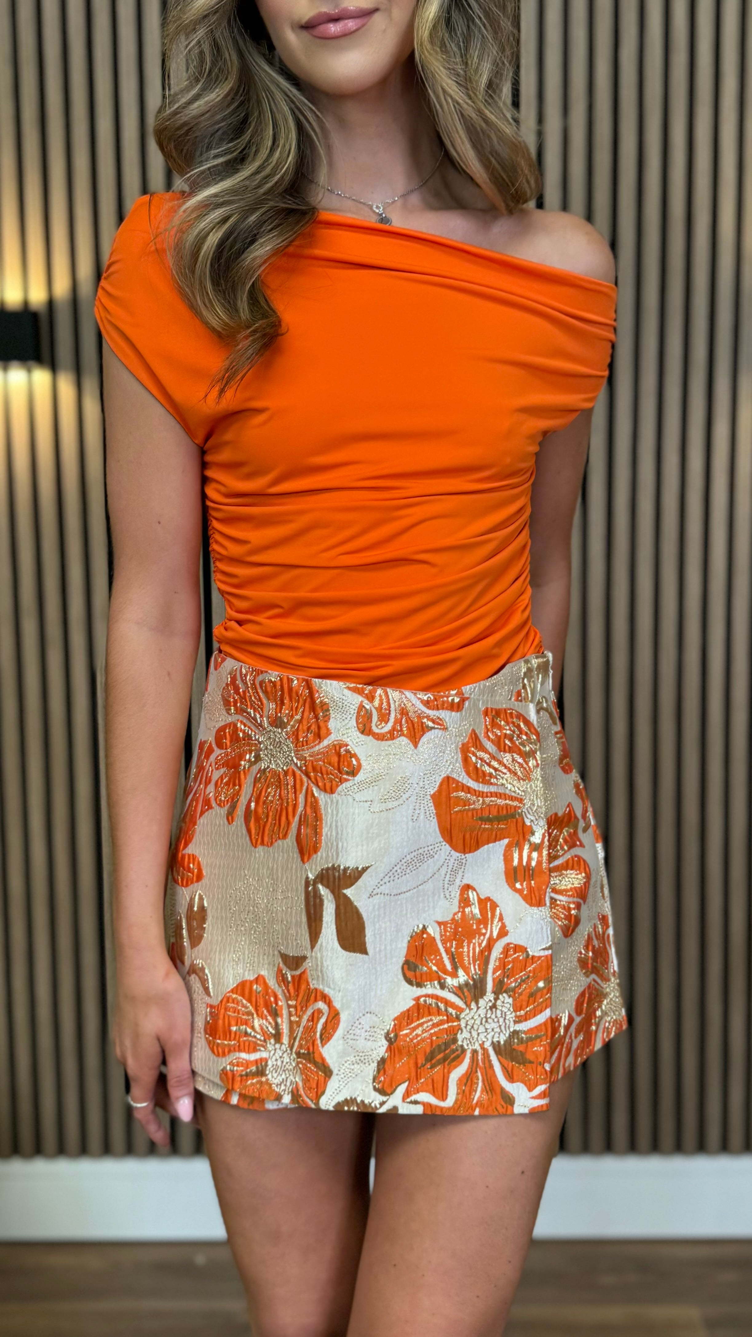 Get ready to make a stylish (and fun!) statement with the Linda Orange & Gold Jacquard Skort! This skort features a unique and playful jacquard design that will turn heads. It's perfect for adding a touch of personality to your outfit. 😉