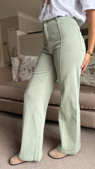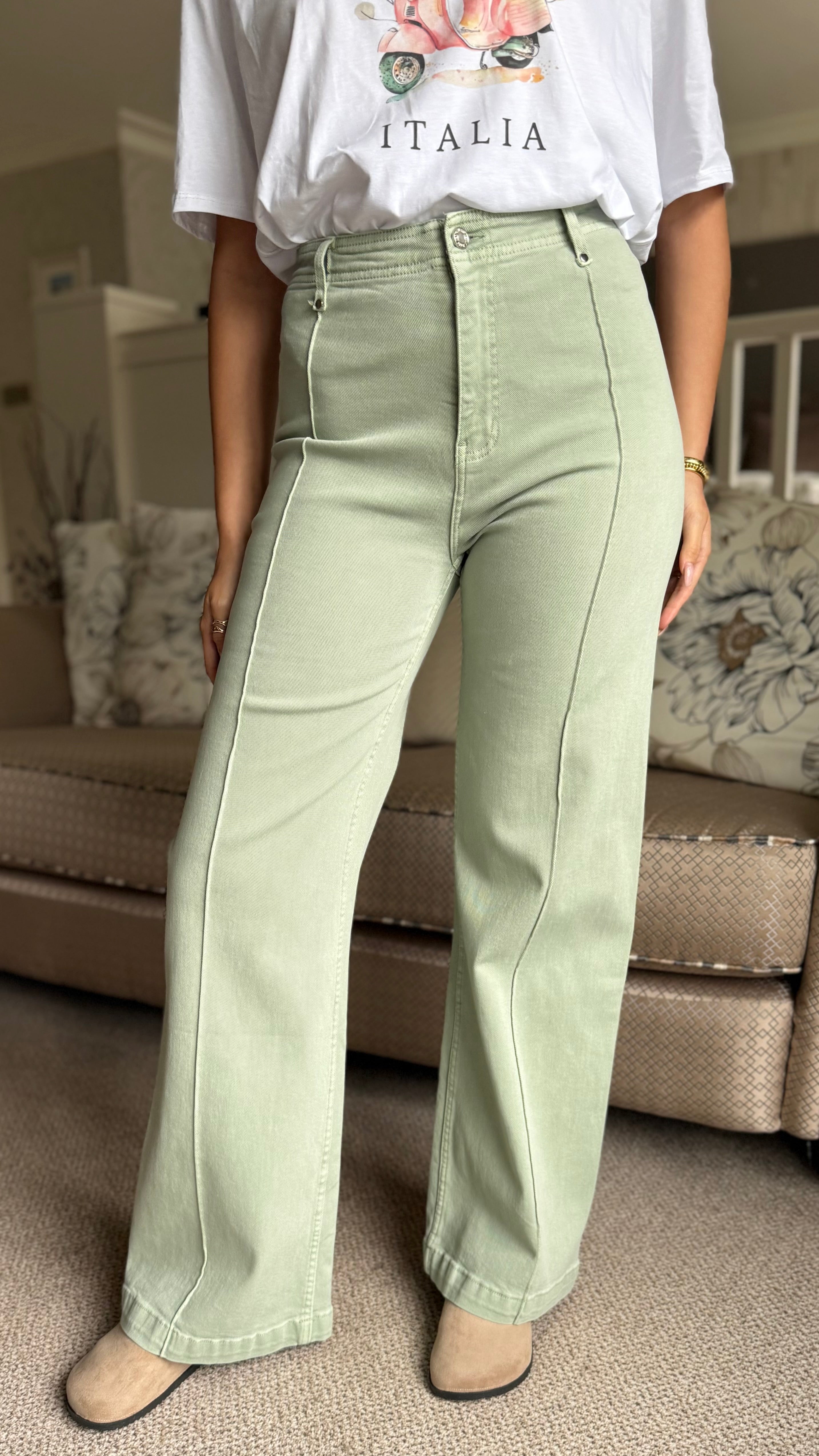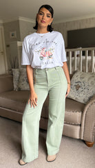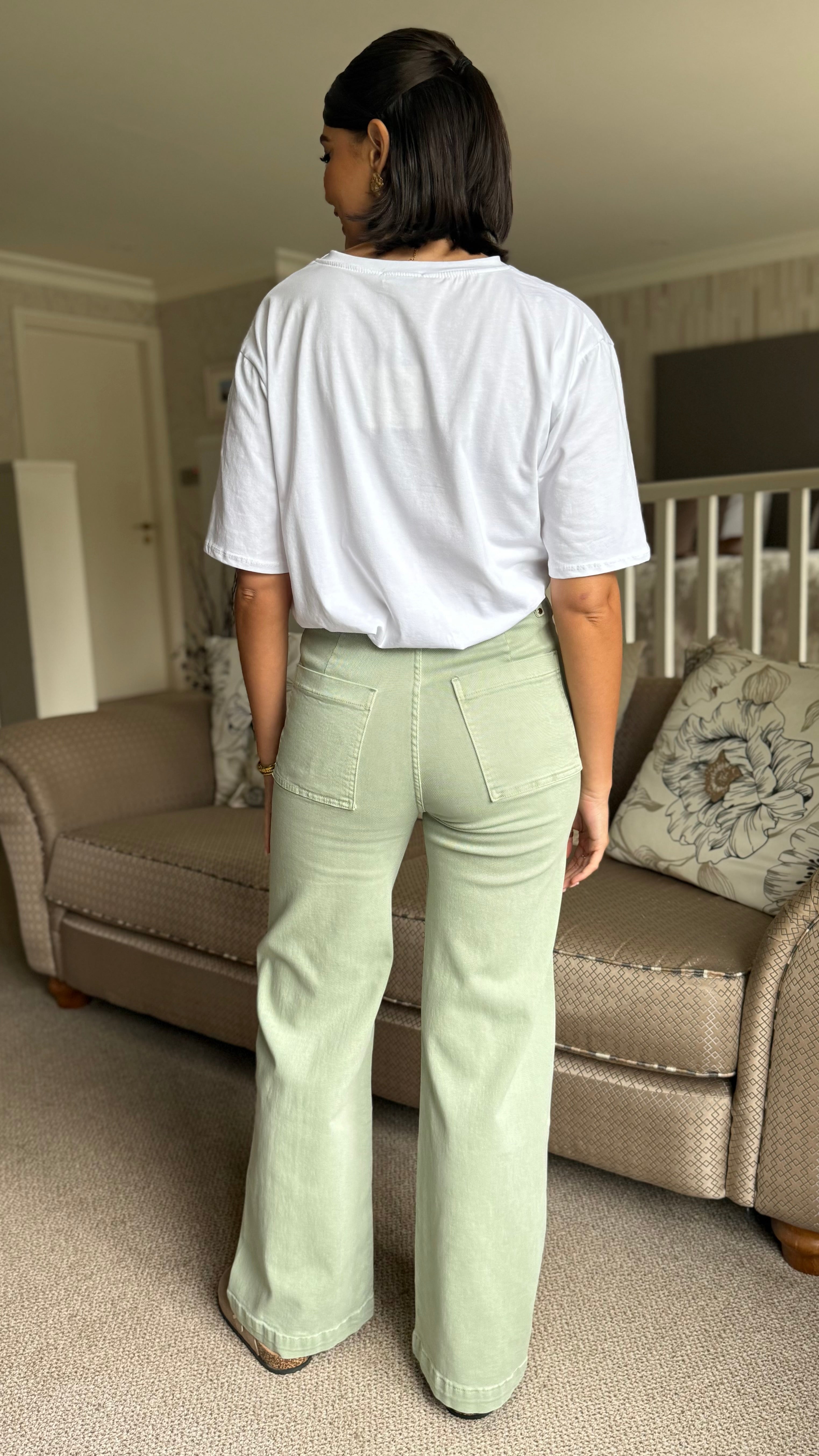 Loretta Light Green Wide Leg Jeans feature a relaxed, flattering silhouette with front and back pockets for practical storage. Dual fastening with zip and button closure ensures secure wear, while belt loops offer styling versatility. The wide-leg cut delivers contemporary comfort without compromising on structure, making these jeans an effortless addition to any wardrobe.