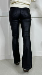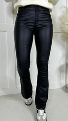 Add a playful flair to your wardrobe with Lucy Black Coated Leather Look Flared Trousers. The mid-rise waist and flared lower leg create a flattering silhouette, while the push-up and stretch features provide a comfortable and flexible fit. Complete with five pockets, belt loops, and a zipped fly, these coated pants will give you a fresh and modern look that's straight out of the 70s! 🌟