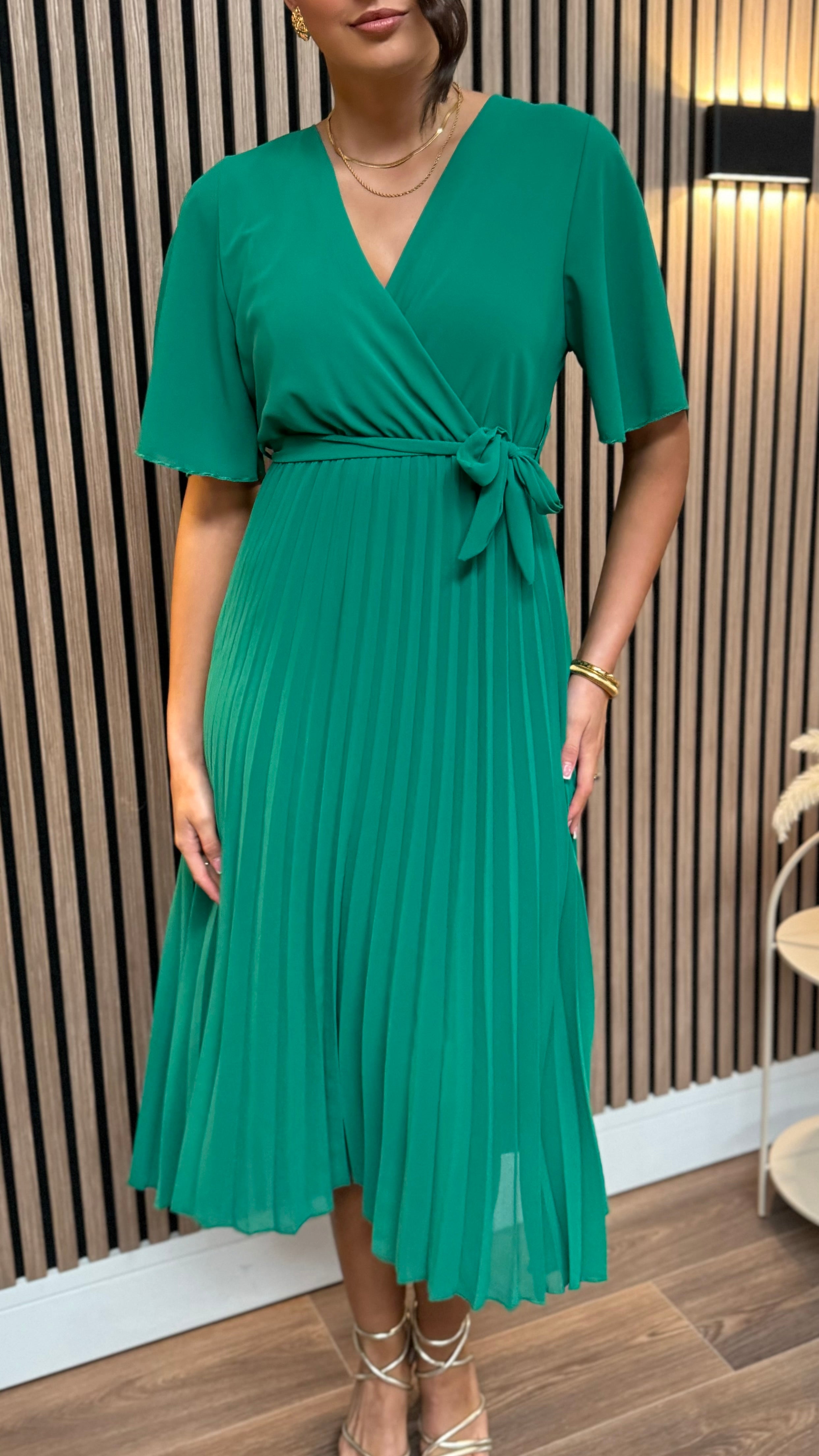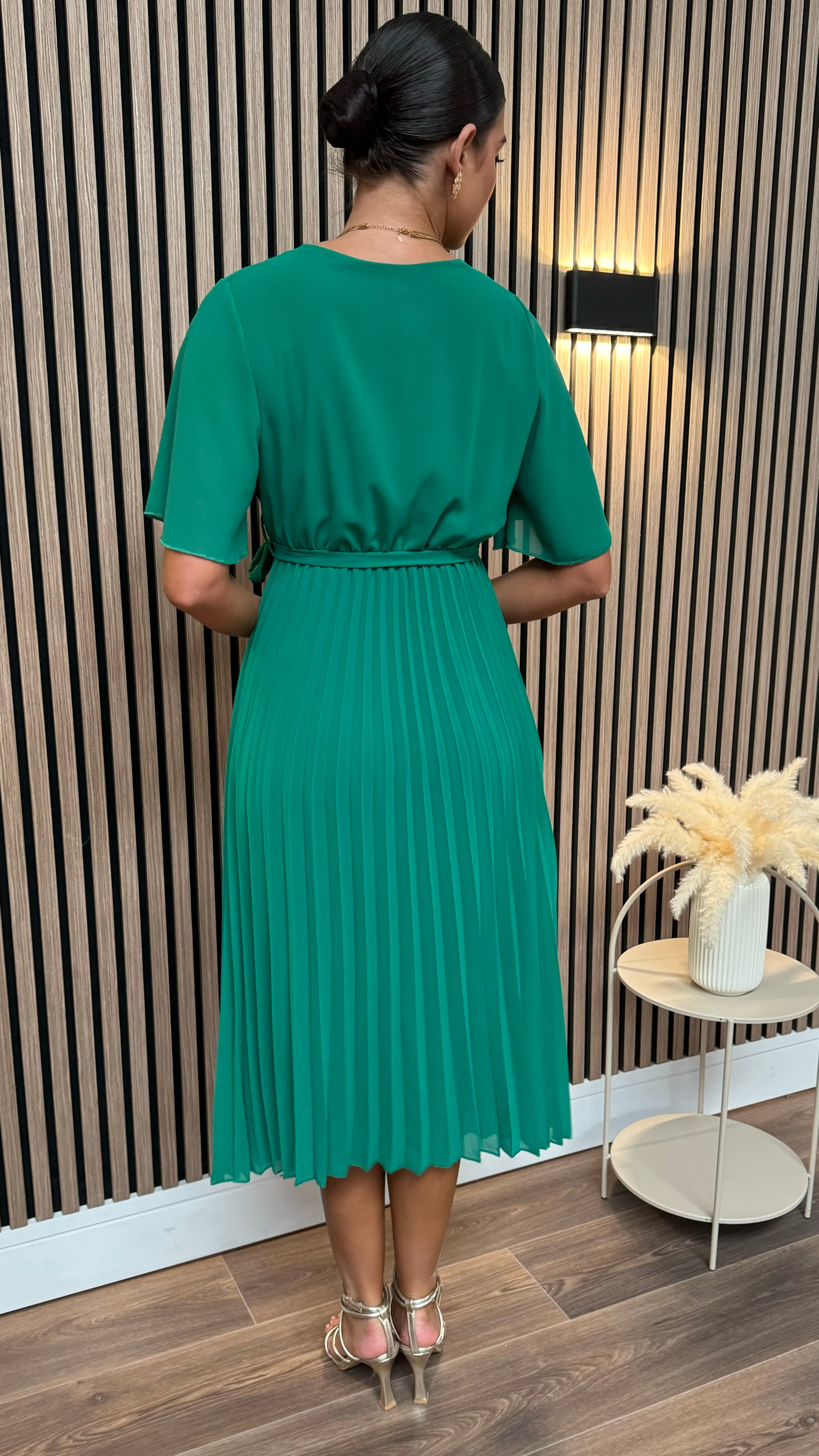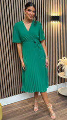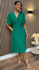 Lucy Green V Neckline Belted Pleated Midi Dress