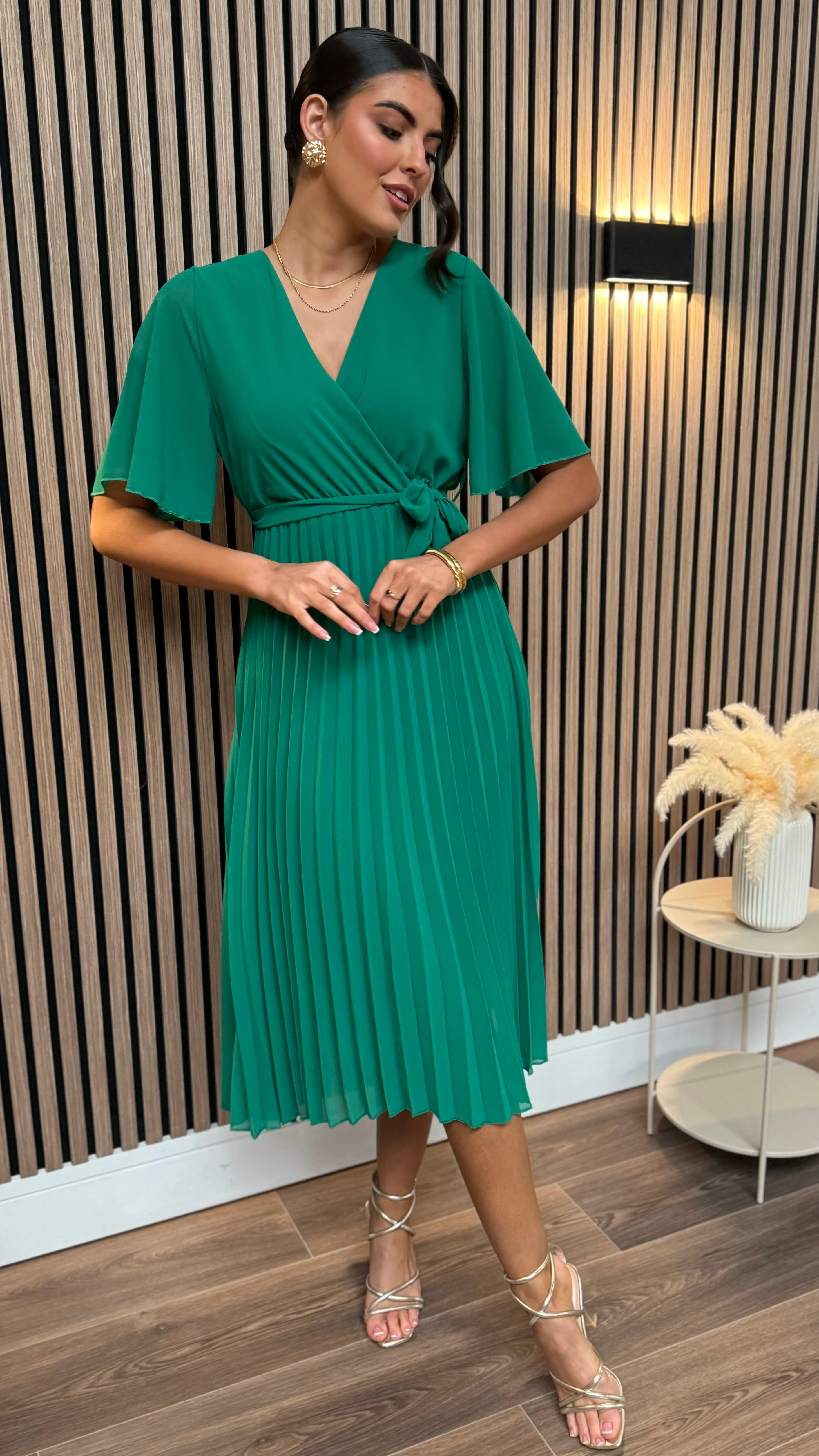 Get ready to turn heads in the Lucy Green V Neckline Belted Pleated Midi Dress! This stunning dress features a playful v neckline and wrap effect top that will accentuate your figure. The belted waistline adds a touch of elegance, while the flutter sleeves bring a fun and flirty touch. Perfect for any occasion, this dress is a must-have in your wardrobe! 😍