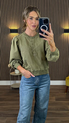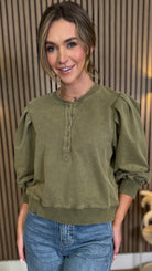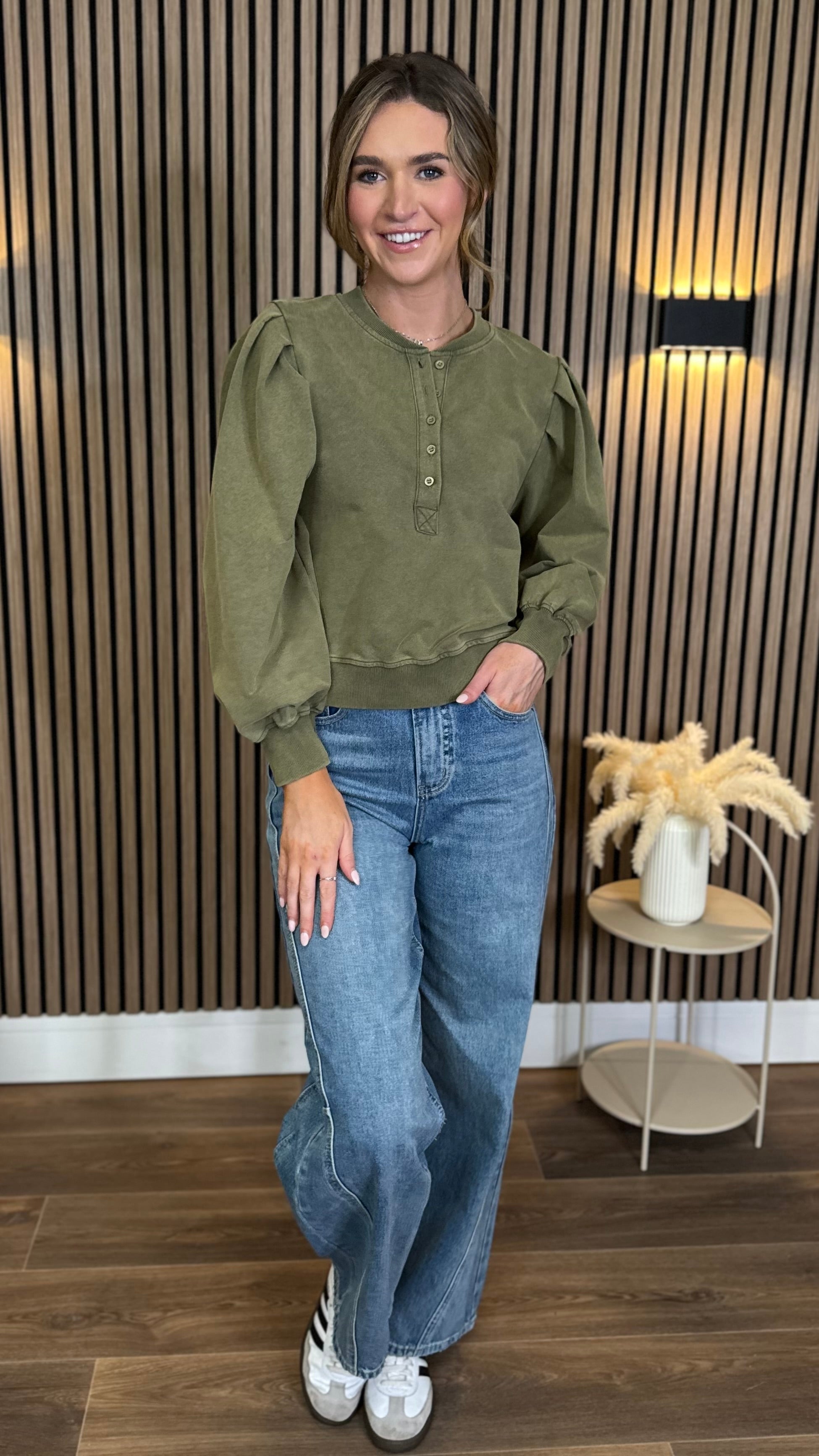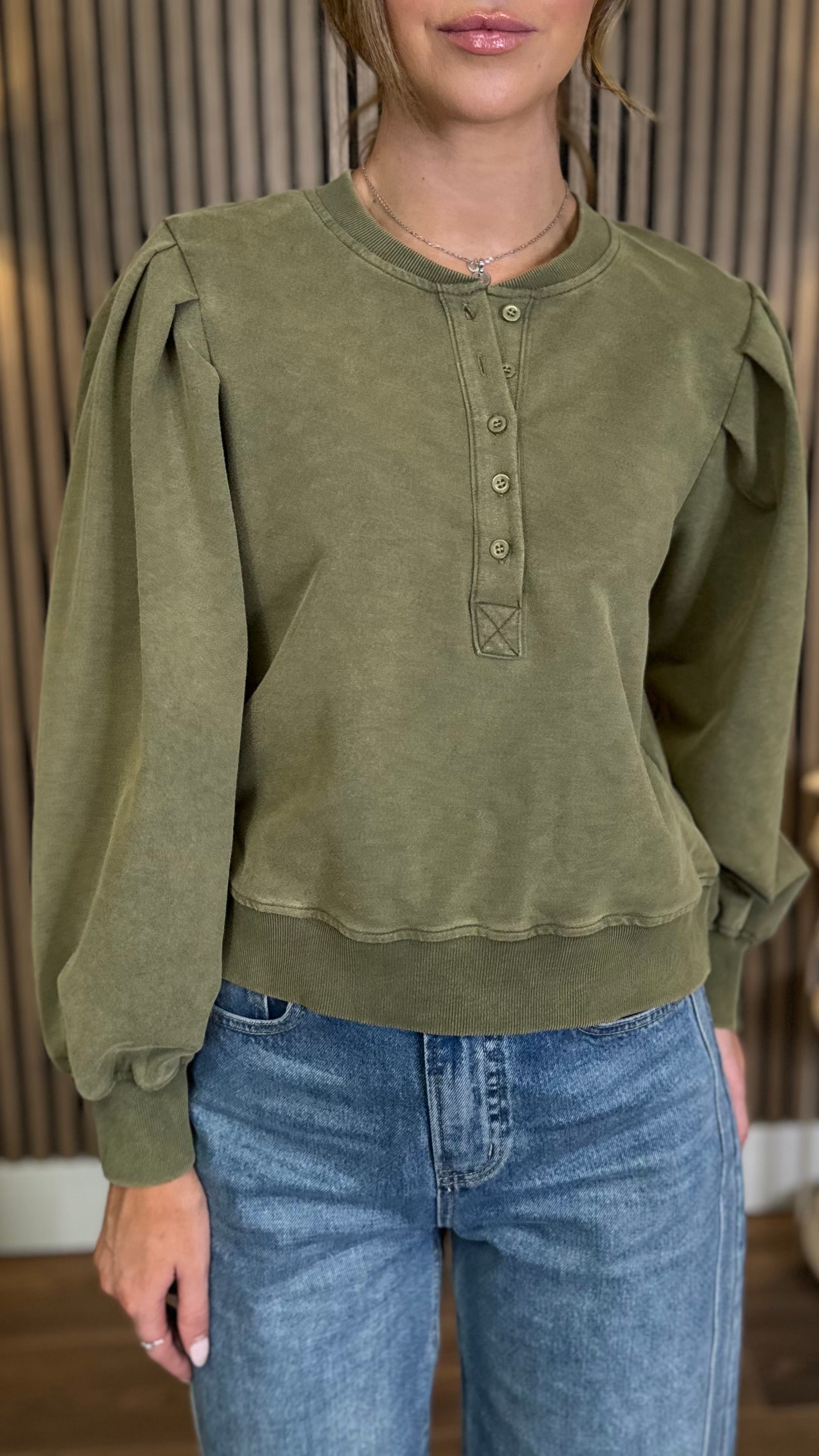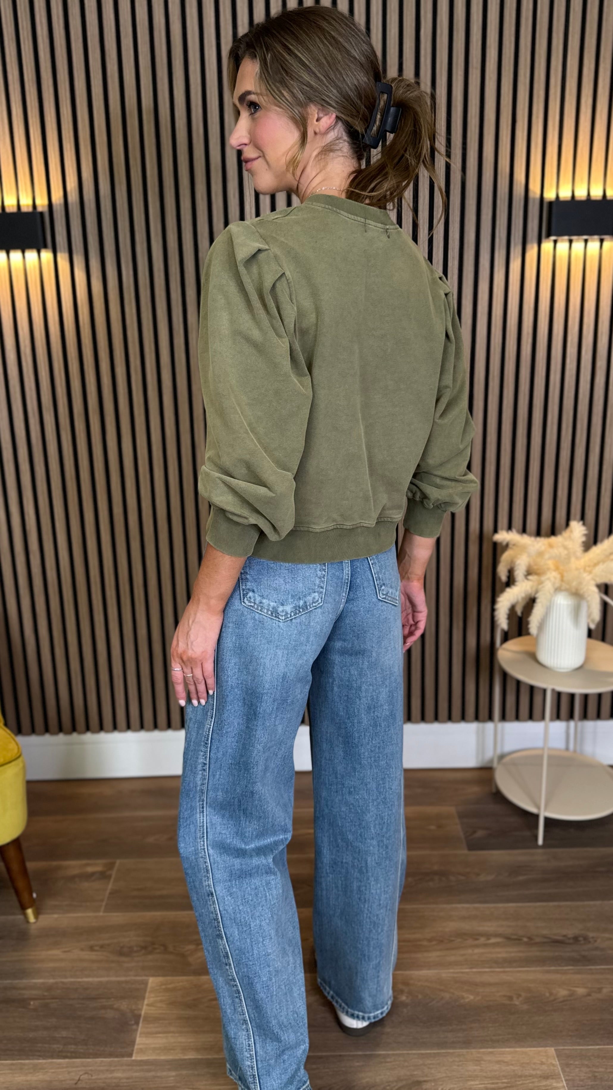 Marlee Moss Green Puff Long Sleeve Button Detail Cropped Sweatshirt