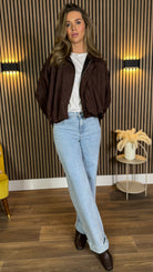 Embrace effortless cool with the Marnie Chocolate Brown Suedette Bomber Jacket. Its playful oversized fit and sleek zip-up front make layering a breeze, while the collar detail adds a stylish twist to the classic bomber look. Perfect for adding a cozy, fashion-forward edge to any outfit.
