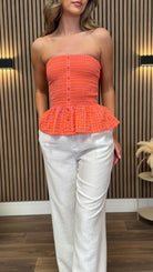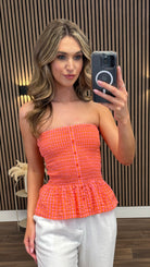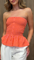 Matilde Orange & Pink Gingham Strapless Shirred Top