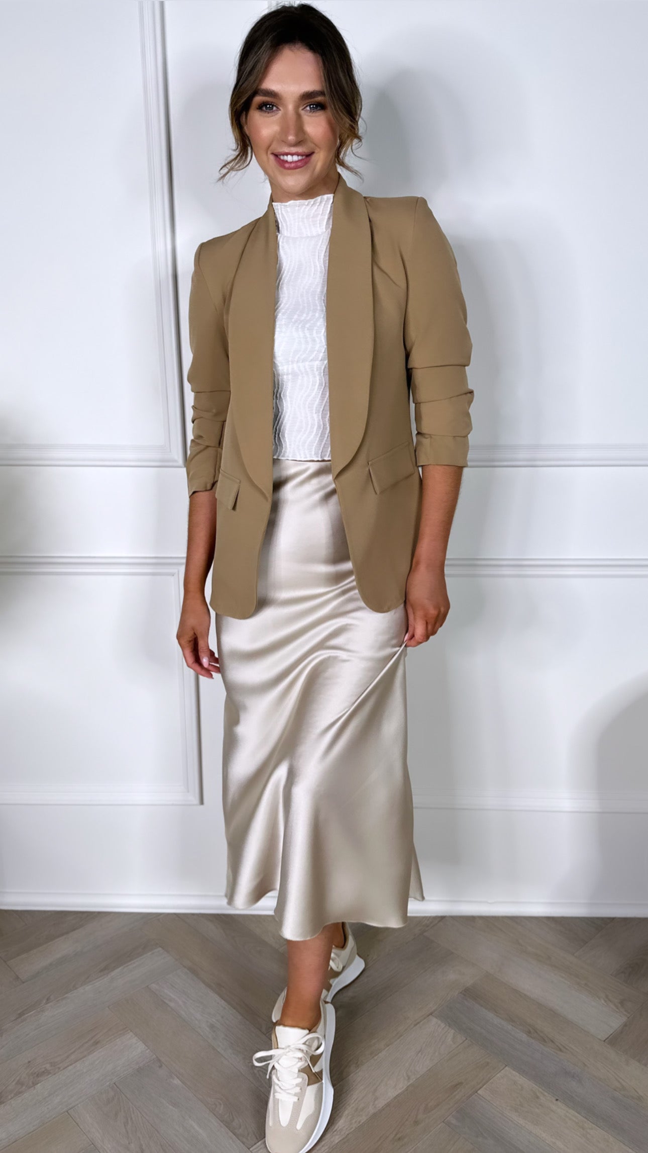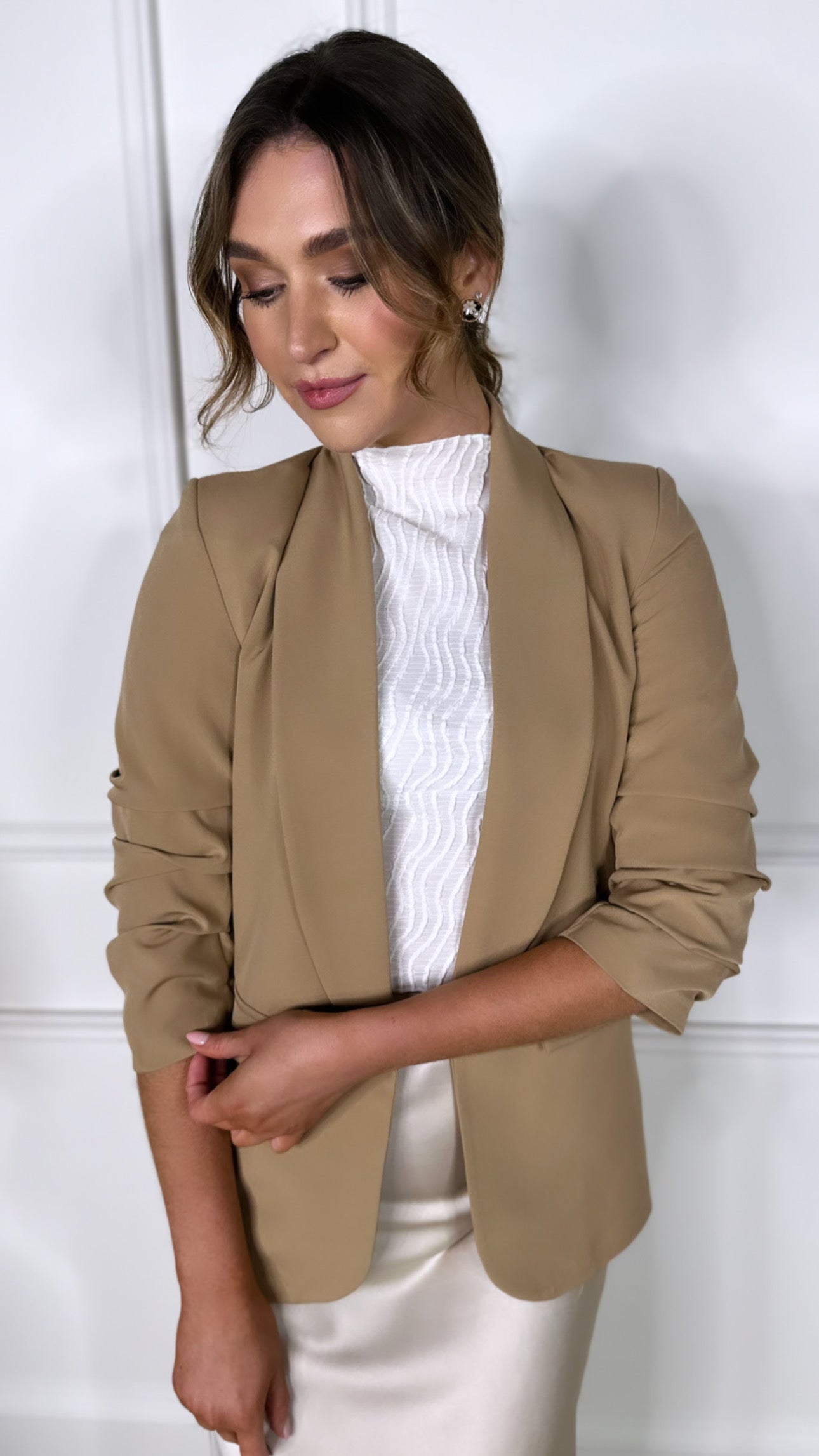 Look sharp and feel comfy with this McKinley Camel Ruched Sleeve Blazer! It's got all the features you need and then some: ruched sleeves, a trendy collar detail, faux pockets, and a lining to keep you comfortable 🔥