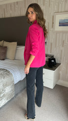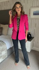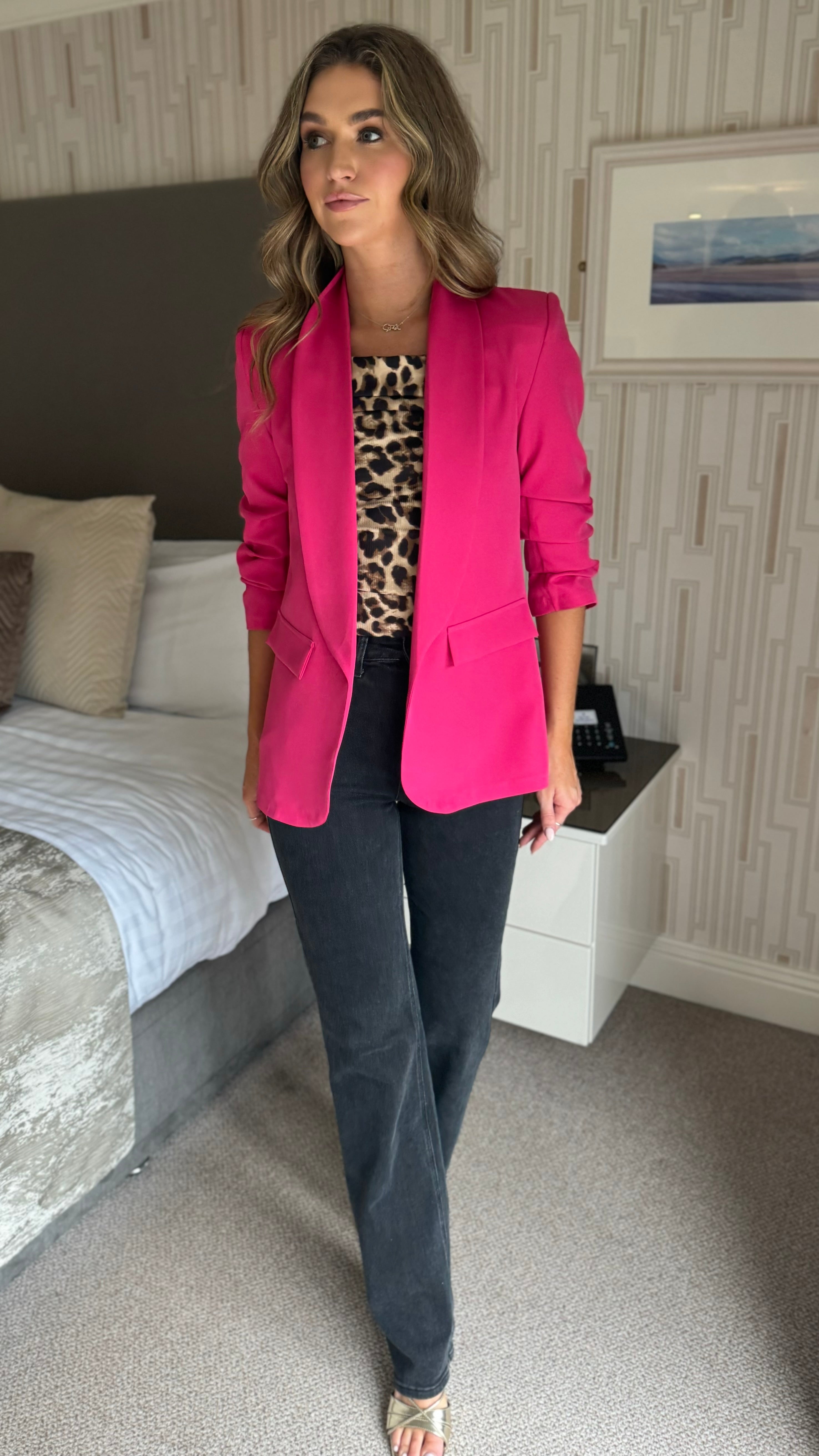 Elevate your wardrobe with the McKinley Fuchsia Ruched Sleeve Blazer 💼. Its vibrant fuchsia hue and elegantly ruched sleeves create a refined silhouette, perfect for making a confident statement at any event. Crafted to blend style with sophistication, this blazer adds a polished touch to both professional and evening looks.