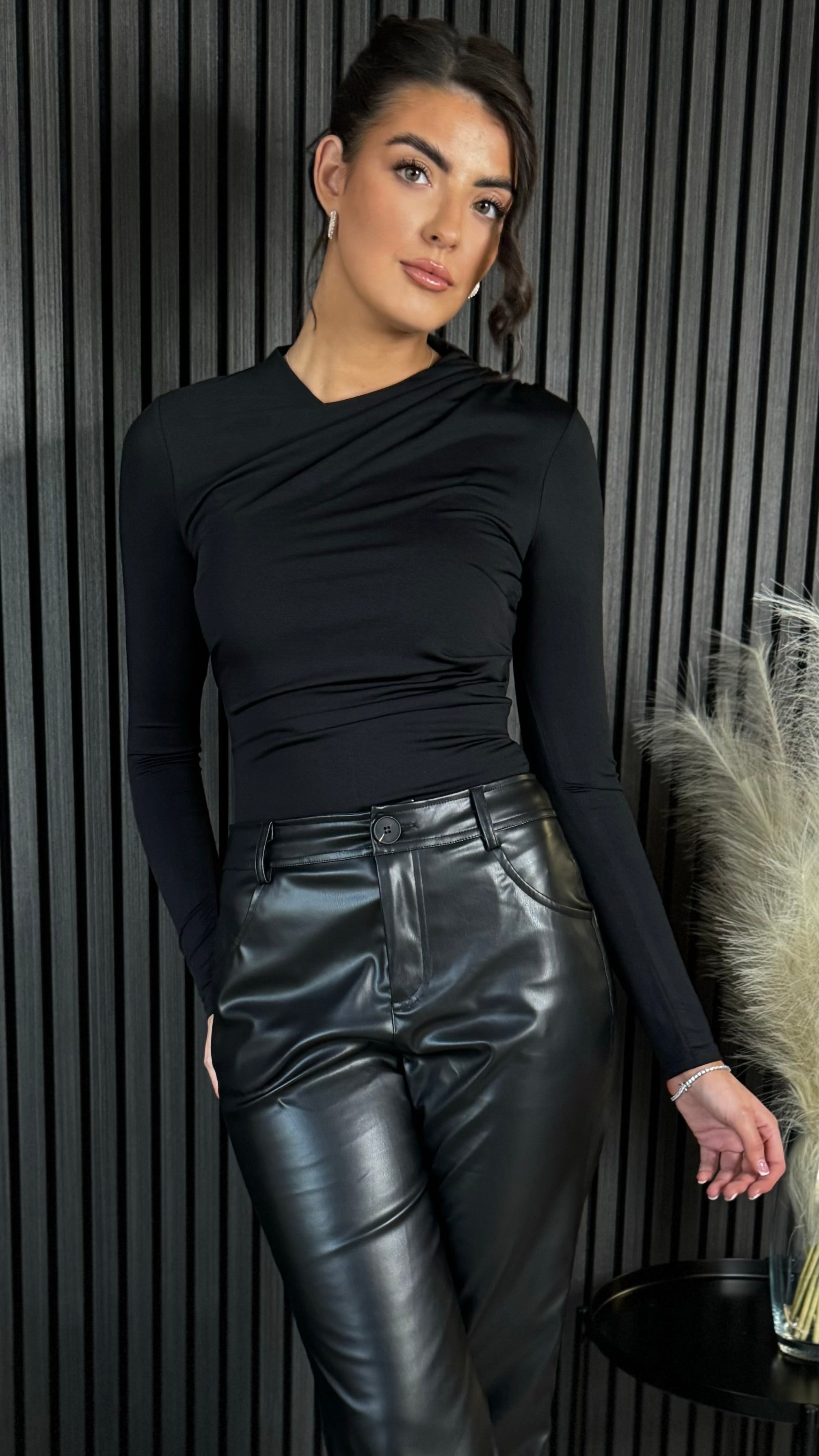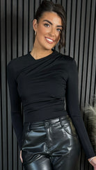 Be the embodiment of effortless cool with our Meabh Black Ruched Detail Bodysuit. Featuring a round neckline and ruched detailing, this bodysuit effortlessly elevates any outfit for a look that's both stylish and comfortable. Say goodbye to endless outfit choices and hello to easy, on-trend style.