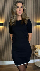 Get ready to turn heads with the Mollie Black Knit Co Ord! This stylish set includes a top and mini skirt, both featuring a trendy black and white trim and flattering round neckline. With its short sleeves and ribbed waist and hems, this co ord is perfect for a fun and flirty look!