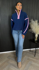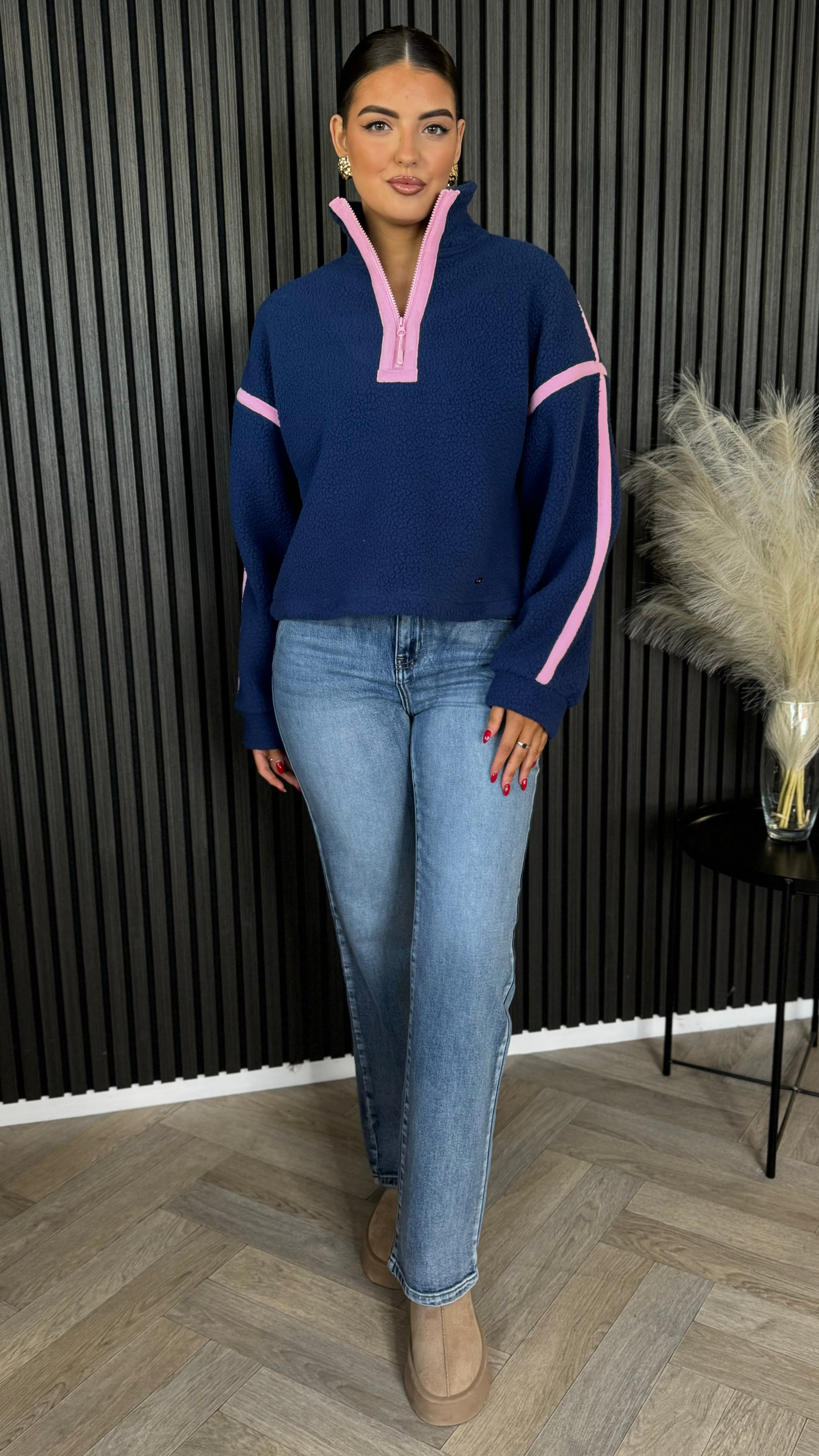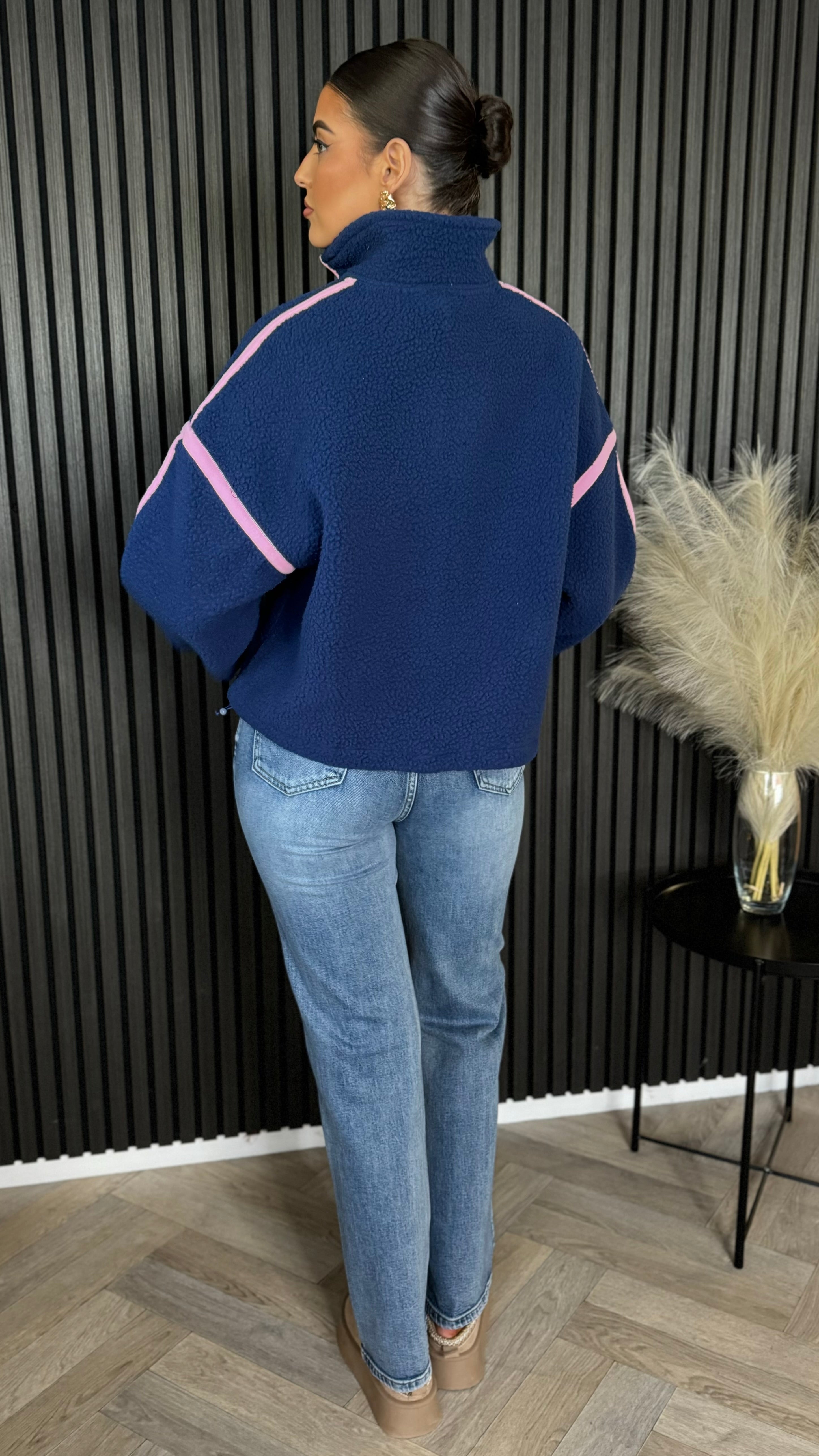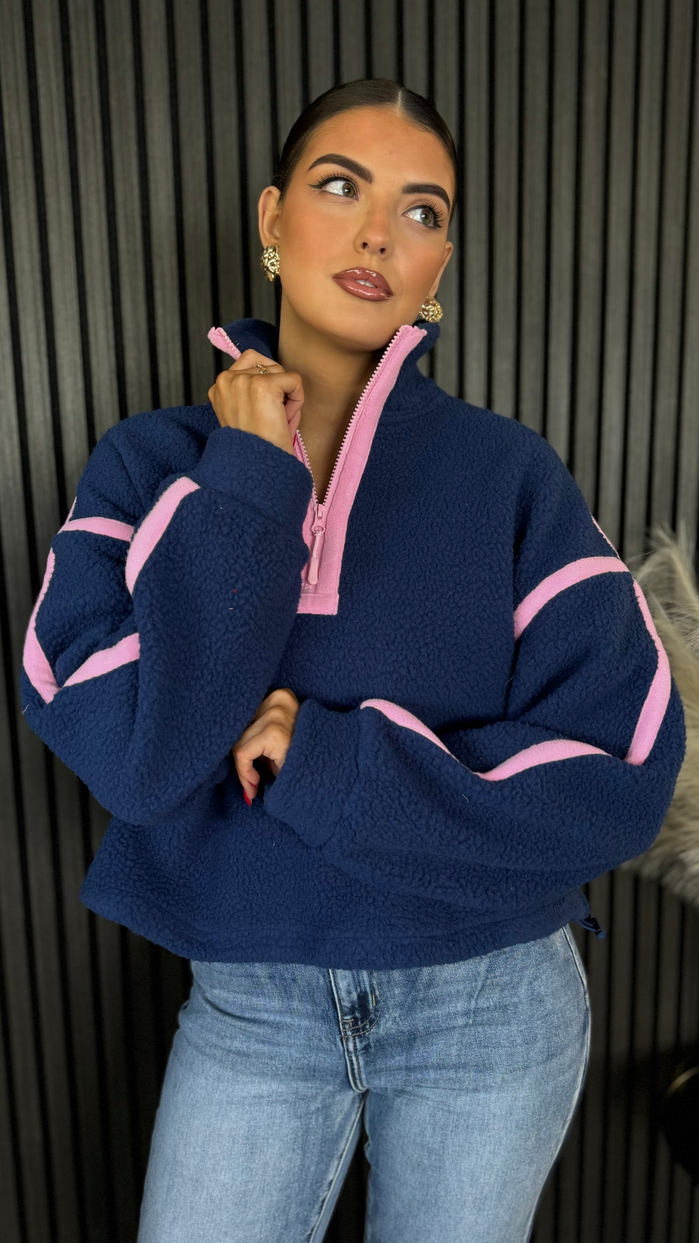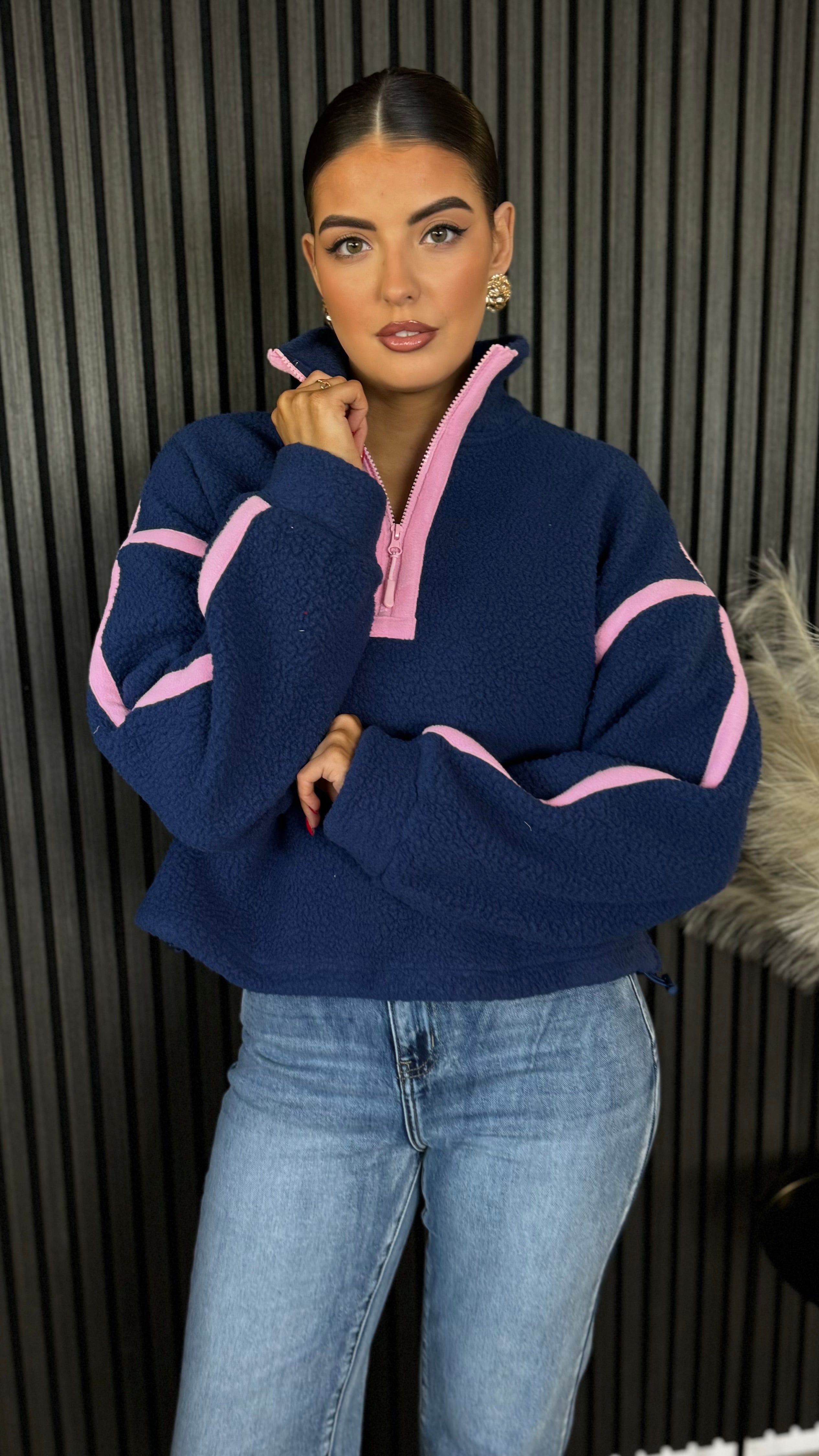 Cosy up in style with the Mollie Navy & Pink Contrast Zip Fleece – your new go-to for effortless cool. This borg fleece beauty features eye-catching contrast details that pop, a handy quarter zip for easy layering, and a drawstring hem to lock in warmth. Perfect for those days when you want comfort without compromising on fashion. Snug, chic, and ready for anything.
